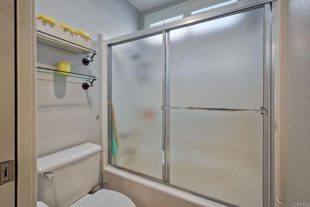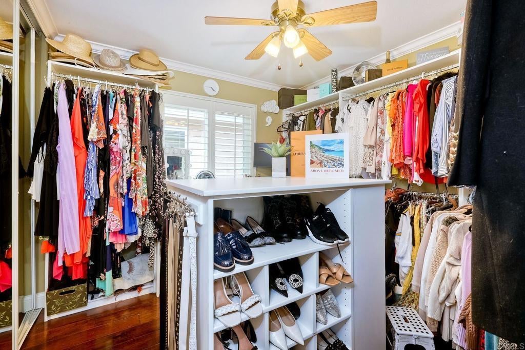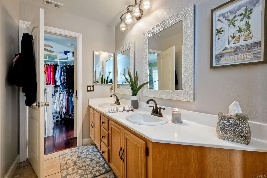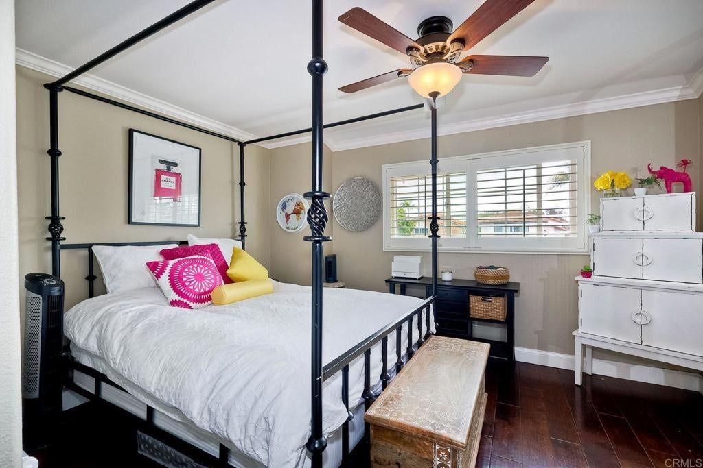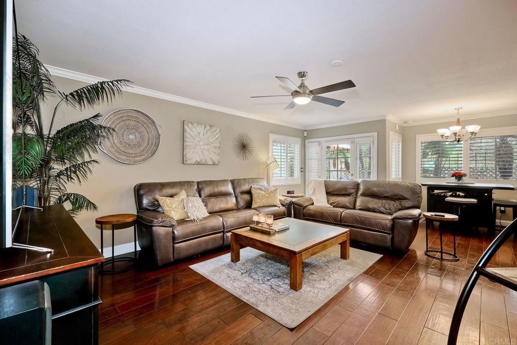 This home features a reimagined open-concept layout created by removing three walls between the kitchen, dining, and family room adding approximately 60 square feet and creating a bright, seamless great room ideal for everyday living and entertaining. The centerpiece kitchen offers a walk-around island with Bosch cooktop, breakfast bar seating, and rich walnut cabinetry with pull-out drawers, roll-outs, and lazy Susan. Chiseled-edge granite counters, stacked stone backsplash, and stainless steel Bosch and KitchenAid appliances complete the space. Scraped walnut engineered hardwood floors, crown molding, baseboards, skylights, and custom lighting enhance the light-filled interior. The family room includes built-in BOSE surround sound. The primary suite features a fireplace, dual vanities, soaking tub, separate shower, and walk-in closet. A Jack-and-Jill bath connects two bedrooms (one converted to a custom closet), plus a downstairs bedroom and full bath offer flexible living. Unique touches include a Travertine mosaic staircase, custom handrails, and numerous upgrades throughout—dual-pane windows, plantation shutters, A/C, whole-house fan and more. Outdoor spaces feature pebble paving in the front courtyard and backyard, tropical landscaping, and a gated entry. The garage offers wall-to-wall built-in storage cabinets. Located in Rancho Del Oro’s Villa Trinidad community with nearby park and tot lot, just minutes to shopping, dining, and Oceanside beaches.