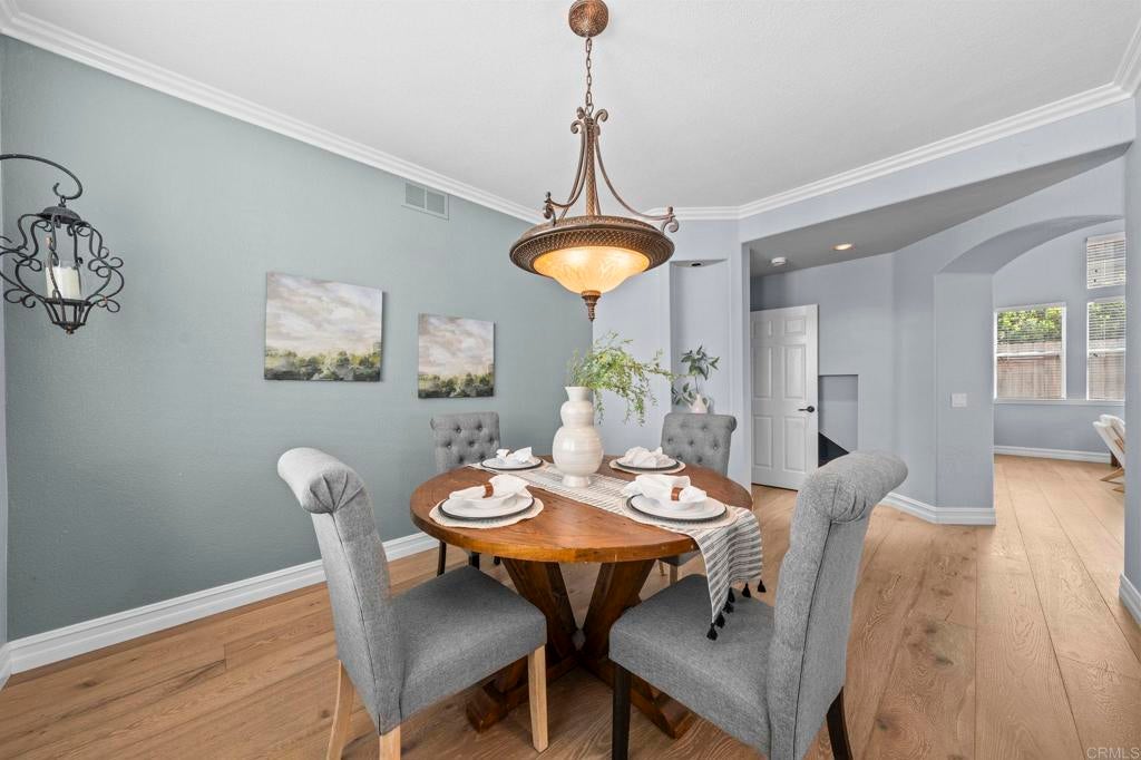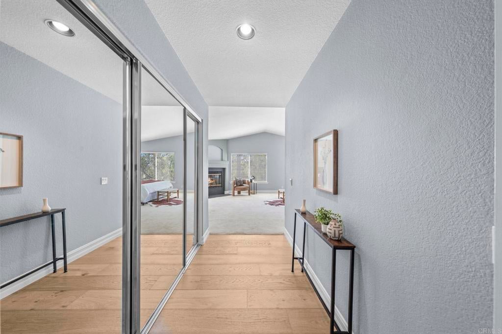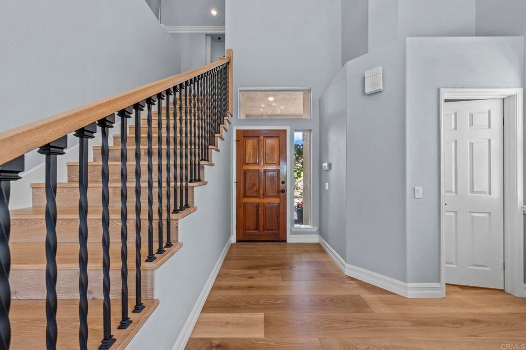 Located in the highly sought-after Broadmoor Hills community of Ocean Hills, this beautifully refreshed 4-bedroom, 2.5 bath residence offers the perfect blend of elegance and modern versatility. Spanning 2,611 square feet of sun-drenched living space, the home features soaring vaulted ceilings that create an immediate sense of scale and possibility. The main level is grounded by sophisticated engineered hardwood made of English oak that flows seamlessly through the formal living room, dining room, and kitchen, providing a move-in-ready canvas for any interior style. The recently remodeled gourmet kitchen serves as a central hub for both daily living and entertaining, featuring quartz countertops, a large center peninsula, premium stainless steel appliances, a double oven, superior lighting, glass cabinets, and abundant storage. Sliding doors transition the interior to a relaxing patio that has been meticulously landscaped yet designed for easy maintenance. The upper level is designed for maximum functionality, anchored by a generous primary retreat that functions as a true sanctuary. This suite includes a gas fireplace, generous sitting area, along with a private balcony. The primary bath is equally impressive with a walk-in closet, soaking tub, dual-vanity, and walk-in shower. Three additional bright bedrooms provide plenty of room for family, a home office, or guest retreat. Practicality is woven throughout the property, including the dedicated laundry room equipped with a utility sink to the powder room off the downstairs living space perfect for accommodating guests while entertaining. Ample storage is found in numerous linen closets and an expansive garage space, perfect for seasonal items. This home represents a rare opportunity to secure a spacious, flexible property in the desirable community of Shadowridge, optimized for the demands of modern California living.