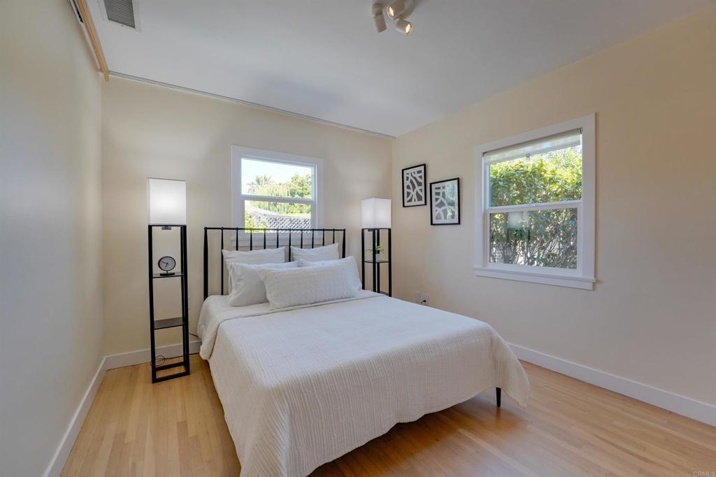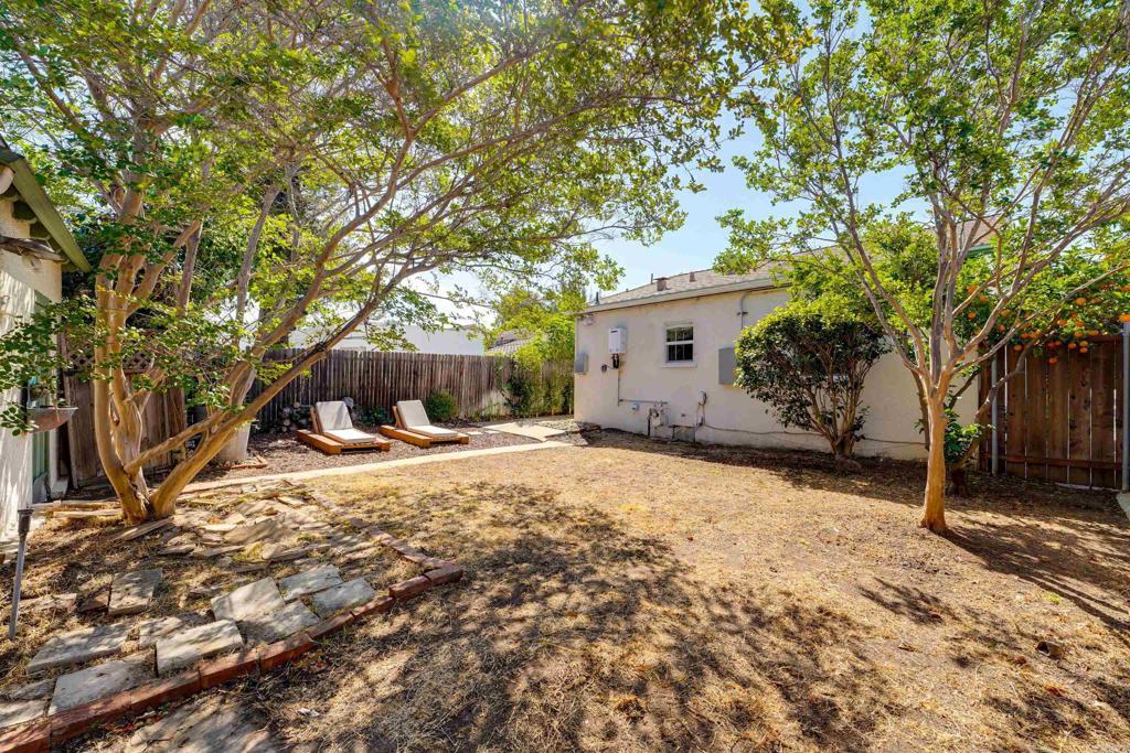 Freshly Updated Talmadge Bungalow with Style, Privacy, and ADU Potential This inviting Talmadge bungalow blends modern updates with timeless charm, offering a bright, welcoming atmosphere and a clean, contemporary aesthetic while maintaining its original warmth and character. The open-concept living and dining areas are filled with natural light and feature original wood floors, refined finishes, and a striking custom-tiled fireplace. The main living spaces have been newly professionally painted, while the kitchen has been refreshed with professionally painted satin white cabinetry, Hi Macs solid surface countertops, a quartz sink, and smart appliances. Additional highlights include Marmoleum flooring in the kitchen, dining, and hallway, newer dual pane windows, a custom primary closet, and a private primary bath. Central AC/heat and solar panels provide year-round comfort and efficiency. Outside, the home offers a flagstone patio, decomposed granite front yard, lush landscaping, and added privacy from the gate and mature hedges. Convenient access from the dining area to the backyard enhances the home’s indoor-outdoor flow for relaxing or entertaining. A detached two-car garage at the rear offers excellent ADU potential for future flexibility or rental income.