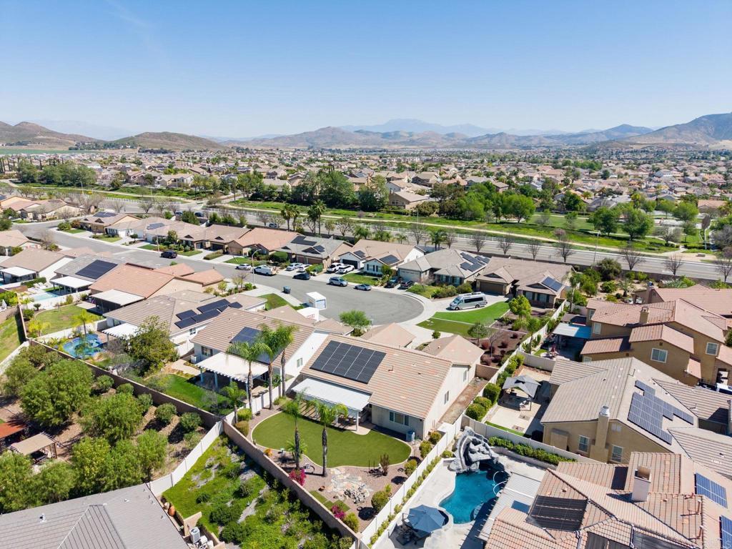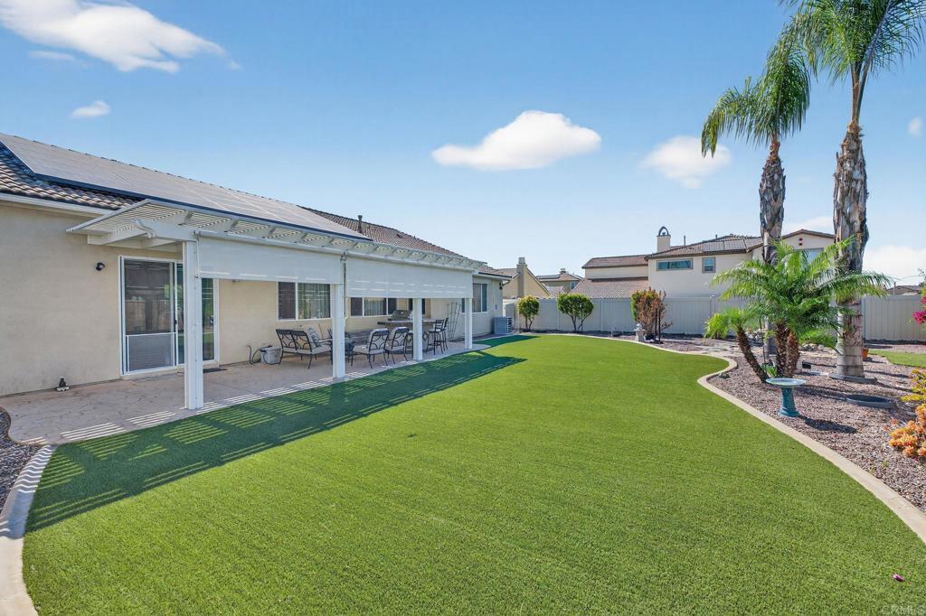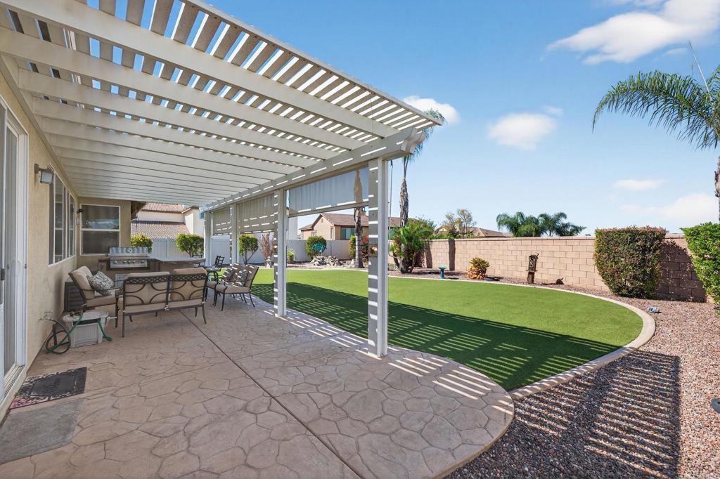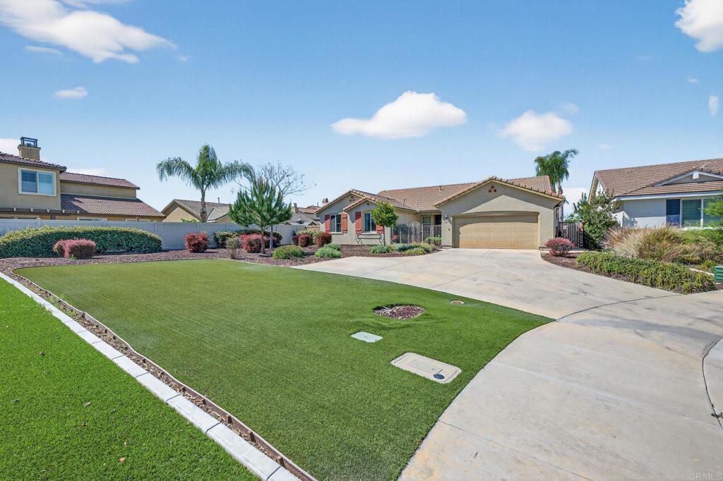 Privately positioned at the end of a cul-de-sac, this stunning single-story residence sits on a huge lot with breathtaking westward sunset views. Located in the highly desirable Spencer’s Crossing community, this 5-bedroom plus office, 3-bath, 2,760 sq. ft. home offers space, privacy, and thoughtful design throughout. A gated courtyard entry and extended turf front yard create exceptional curb appeal, setting the tone for the open and flowing floor plan inside. Beautiful wood-like flooring takes you effortlessly through the expansive layout, guiding you from the formal dining room into the heart of the home where the open kitchen shines. Featuring a broad center island, stainless steel appliances, abundant counter space, and a seamless connection to the living room warmed by a statement fireplace, this space was designed for gathering. Sliding glass doors frame views of the backyard and invite indoor-outdoor living. The flexible floor plan includes five bedrooms plus an office area, with one bedroom positioned in a private wing complete with its own 3/4 ensuite bath — perfect for guests or multigenerational living. Ceiling fans in every bedroom enhance comfort throughout. Retreat to the spacious primary suite, offering a soaking tub, walk-in shower, dual sinks, and an enormous walk-in closet. Step outside to an entertainer’s backyard, featuring an alumiwood patio cover, built-in BBQ and outdoor kitchen, stamped and colored concrete, turf, white vinyl and block fencing, fountain and pond accents, rain gutters, and professionally designed drainage. The sunsets from this west-facing yard are simply breathtaking. Additional highlights include a 25-panel paid-off solar system, separate additional parking in the front yard, laundry room with sink and cabinetry, pull-down ladder attic storage (approx. 125 sq. ft.), wrought iron courtyard gate, and low-maintenance turf with professional drip irrigation in the front, rear, and side yards. Enjoy the lifestyle Spencer’s Crossing delivers, offering multiple parks, clubhouse amenities, resort-style pools, a sports park, and more — all just moments from your front door. Single story. Cul-de-sac. Huge lot. Paid solar. This home checks every box.