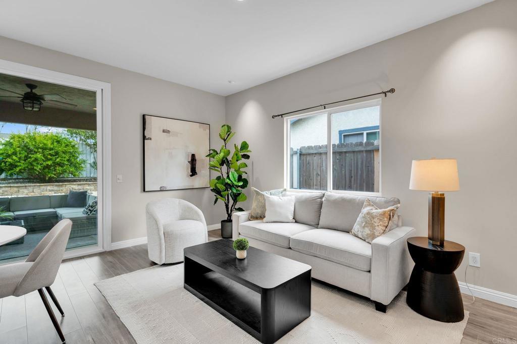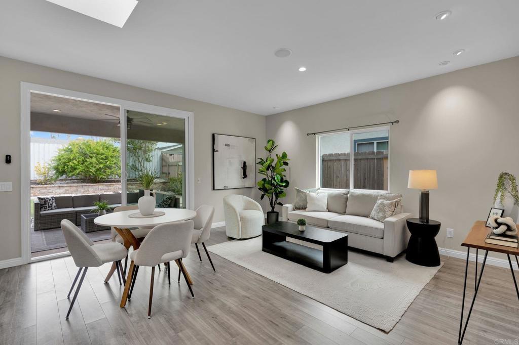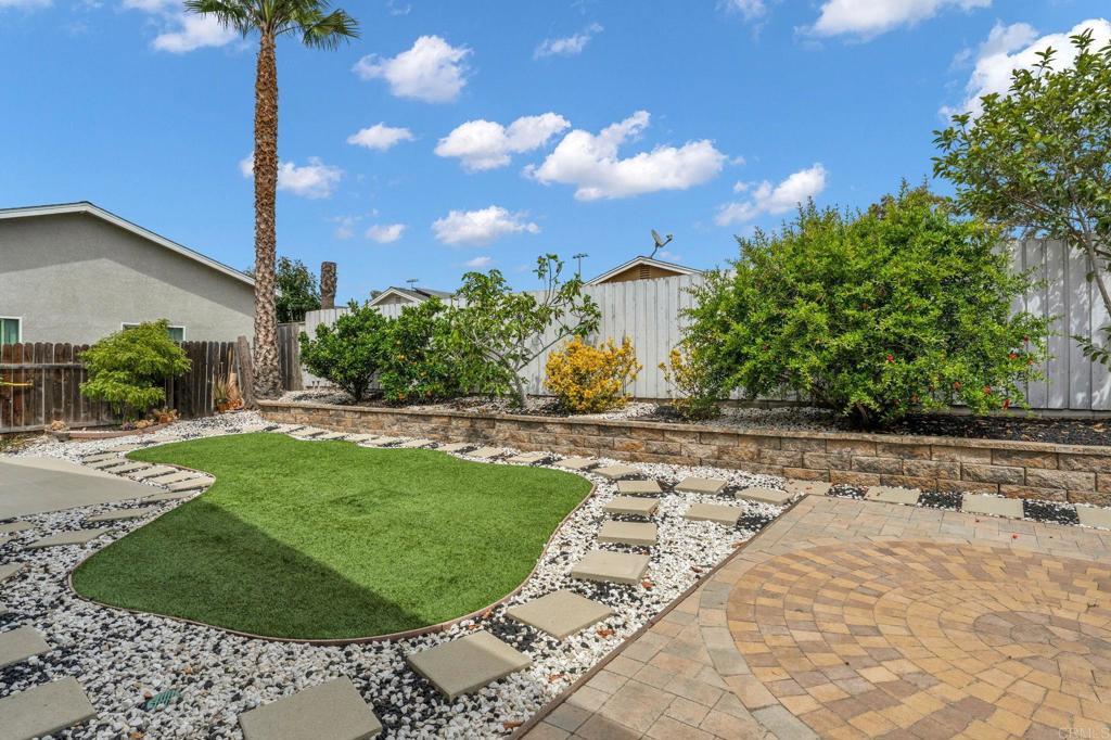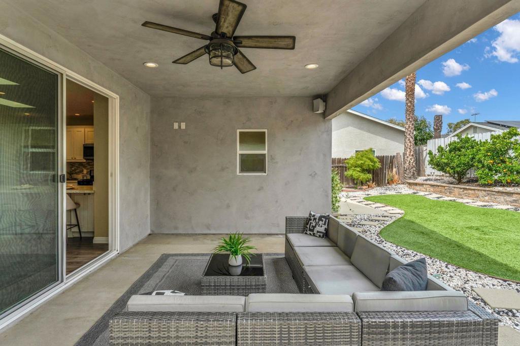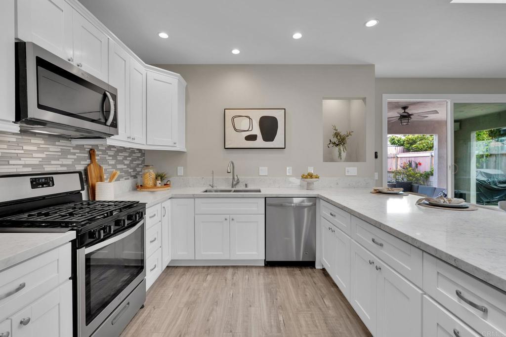 Beautiful newer construction offering a fully permitted and thoughtfully remodeled 4 bed/2 bath home with modern upgrades throughout. Open-concept layout with a spacious kitchen offering quartz countertops, stainless steel appliances, white cabinetry, lazy Susan, and a walk-in pantry. The home features luxury vinyl flooring, dual-pane windows, recessed and designer lighting, skylights, and smooth ceilings for a bright, contemporary feel. The primary suite is tastefully updated with quartz counters, dual sinks, glass-enclosed shower, designer tile, and a large walk-in closet. Secondary bedrooms include mirrored closets and ample storage, plus an oversized coat closet. Enjoy seamless indoor-outdoor living with a covered loggia featuring a ceiling fan, built-in speakers, TV hookup, gas line for BBQ, and energy-efficient LED lighting. The backyard offers low-maintenance artificial turf, hardscape, walk paths, and fruit trees. Additional highlights include owned solar, EV charger in the garage, whole-house water filtration, newer electrical panel, and laundry in the garage.