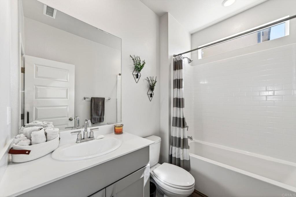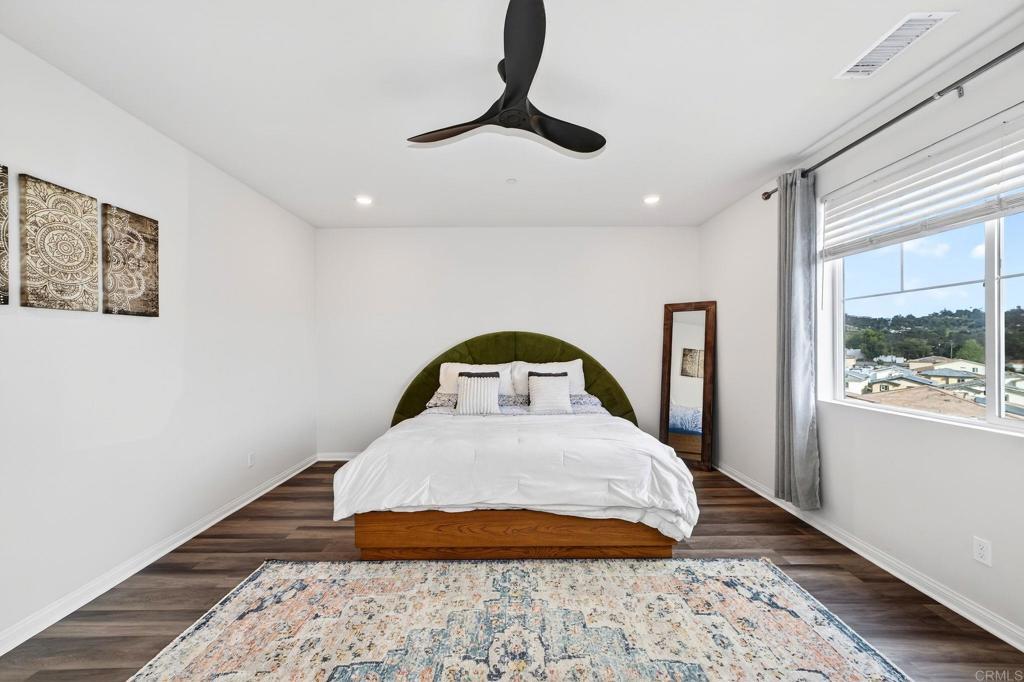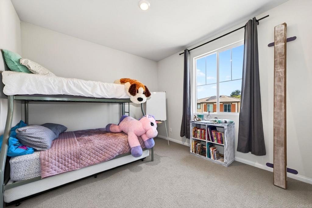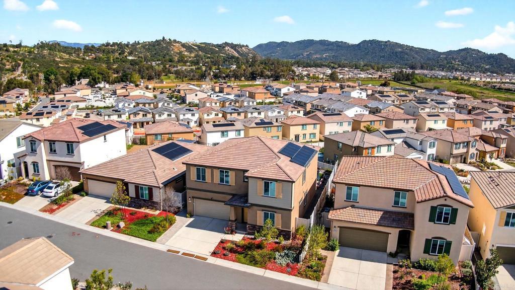 Welcome Home to this spectacular 5 bed, 3 bath home on the NW end of Park Circle in beautiful Valley Center. Once here, you won't want to leave this nearly 3000 SF home with customization everywhere...from the built-in coffee/wine bar in the kitchen, to the upgraded flooring and loft/living space upstairs, to designer paint and wall details. Sitting above the street below, you can BBQ and play in the turf-covered backyard while enjoying the mountain views rather than your neighbors' windows! Downstairs boasts an open concept living, dining and kitchen areas, great for entertaining. One bedroom and full bath downstairs along with a flex space, handy for home office. Upstairs hosts 4 bedrooms and 2 full baths, including a lovely primary suite with closet space for days. The owned 4.2 kw solar system and 50 watt EV charger in the garage make for easy energy efficiency. Park Circle offers a host of amenities including 2 pools, dog parks, pickleball court, grills, 6.6 acres of park space, 8 miles of trails, and so much more!