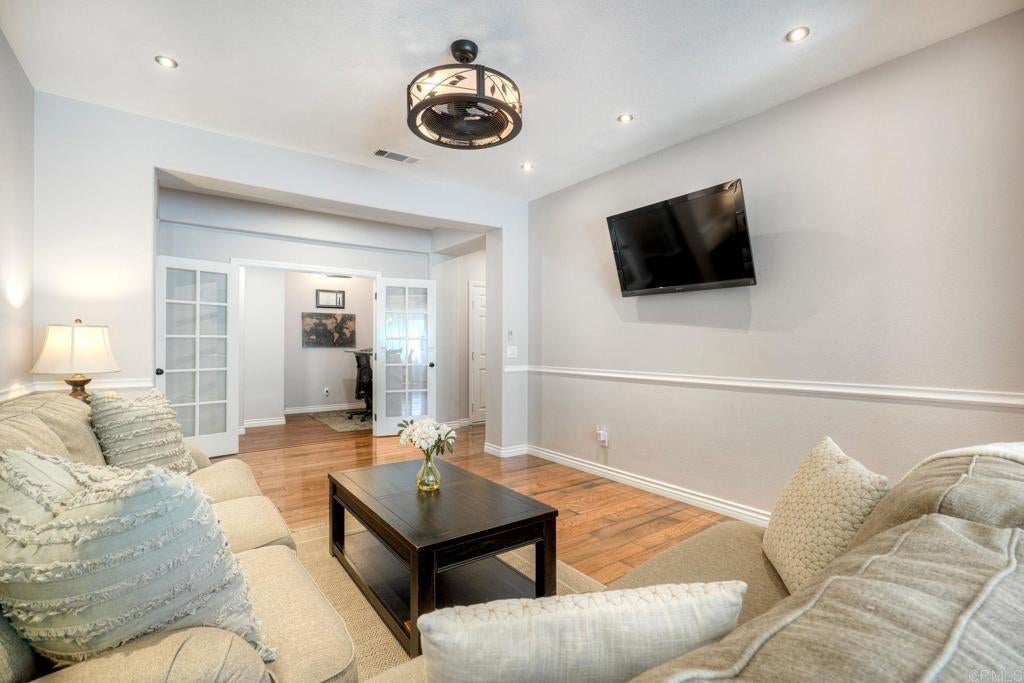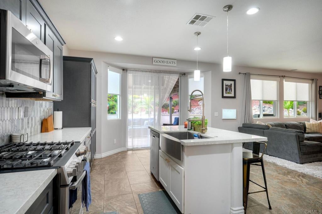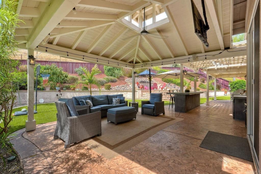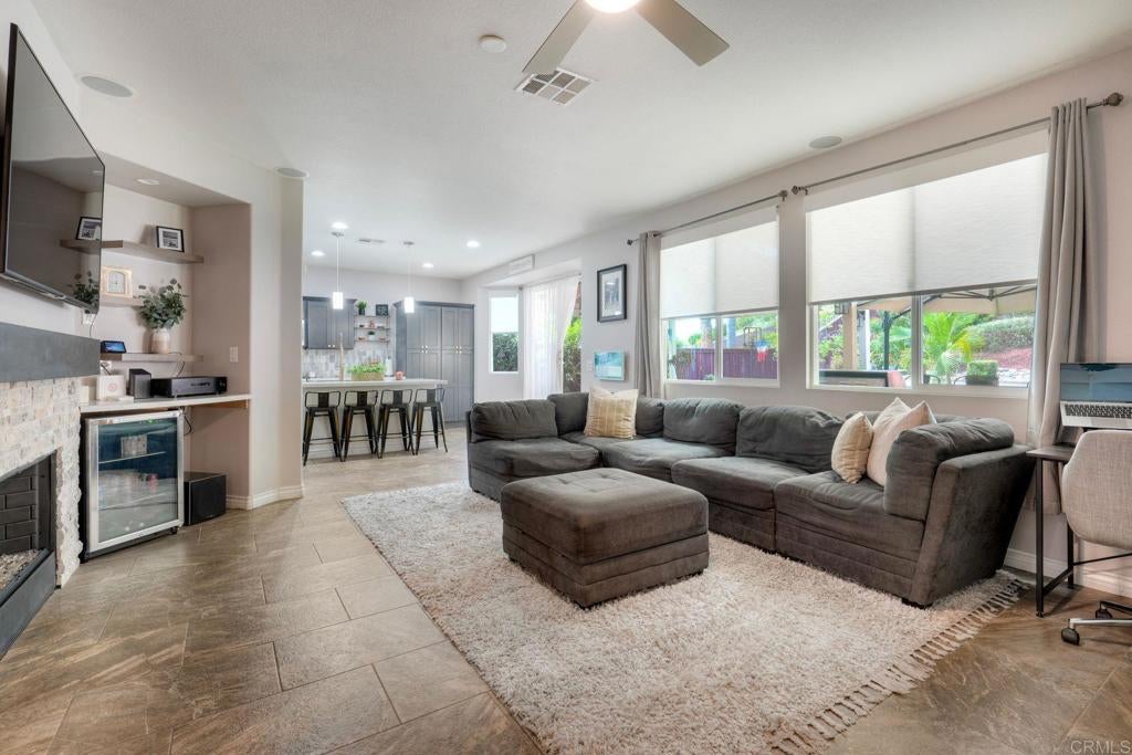 Welcome to this beautifully upgraded single-story home, ideally located on a quiet cul-de-sac and set on an expansive 10,000 sq ft lot. A protected nature preserve is directly across the street, offering a rare blend of privacy and tranquility. This 4 bedroom, 2.5 bath residence has been thoughtfully enhanced to meet today’s modern lifestyle. A permitted office addition and powder room create flexible living options perfect for remote work, guests, or multigenerational needs. At the heart of the home, the remodeled kitchen impresses with a large center island, quartz countertops, custom cabinetry, and GE appliances, opening seamlessly to the main living areas. Wood and Italian tile flooring, newer interior paint, and blinds add warmth and style throughout. Sunlight fills every room thanks to the contractor-installed new windows (not retrofit replacements), while the updated fireplace anchors the great room with comfort and character. Built-in surround sound enhances everyday living and entertaining. Step outside to your private entertainer’s retreat. An outdoor oasis complete with a fully equipped outdoor kitchen and bar, covered patio, TV, surround sound, and upgraded lighting, perfect for hosting friends or relaxing year-round. Low maintenance artificial turf in both the front and backyard keeps the home beautiful with minimal upkeep, while mature fruit trees add charm and functionality. Additional highlights include a paid-off solar system, low HOA, and a location that offers peace, space, and long term value. This is single-story living at its finest. The added powder room and office space total approximately 210 sq. ft. but not included in the tax record sq.ft
