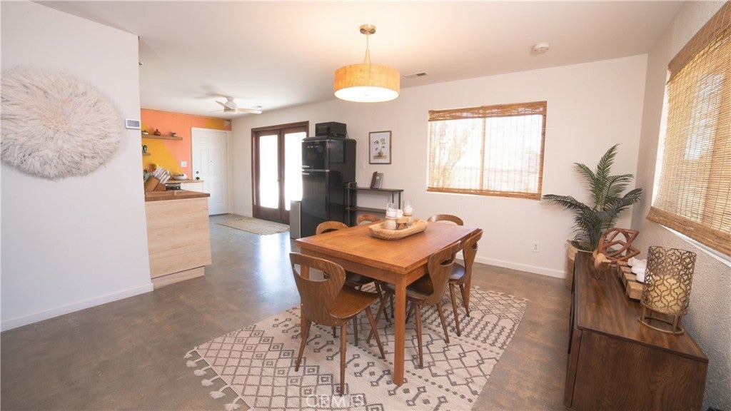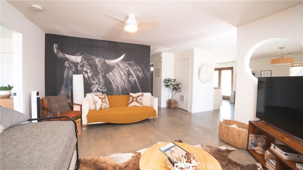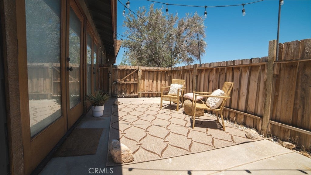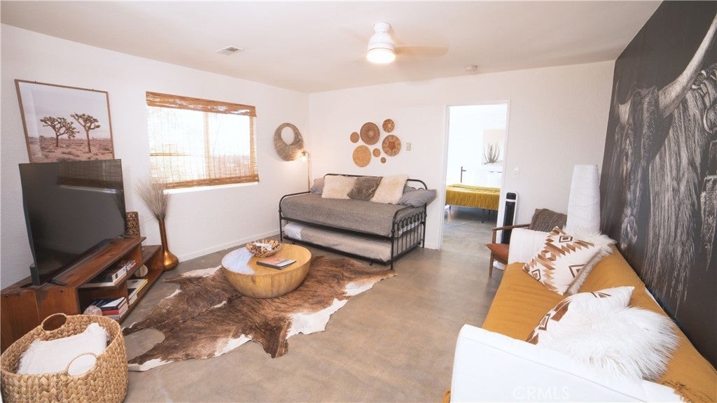 A true desert gem! This beautifully reimagined Joshua Tree retreat blends high-desert charm with modern upgrades, offering breathtaking panoramic views. Just minutes from the village and Joshua Tree National Park, this two-bedroom, two-bath main house is thoughtfully designed with unique details, from stunning wallpaper murals to stylish finishes throughout. Every detail has been carefully considered: brand-new bathrooms and kitchen, all-new windows and French doors, updated appliances, and a tankless water heater for the cowboy pool. A finished shed provides a cozy bonus space, perfect for a creative retreat or guest quarters. Step outside to a fully fenced, low-maintenance yard with multiple lounging areas, a stylish pergola draped with shade sails and Italian string lights, and a new cowboy plunge pool with a surrounding wooden deck. The property also features a standalone garage, additional storage shed, and a dedicated laundry room. Whether you’re looking for the perfect Airbnb investment or a private desert escape, this charming compound is ready to be your next adventure.
