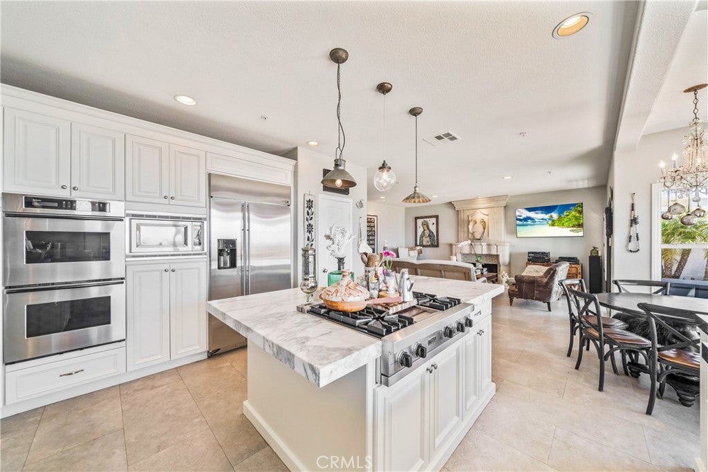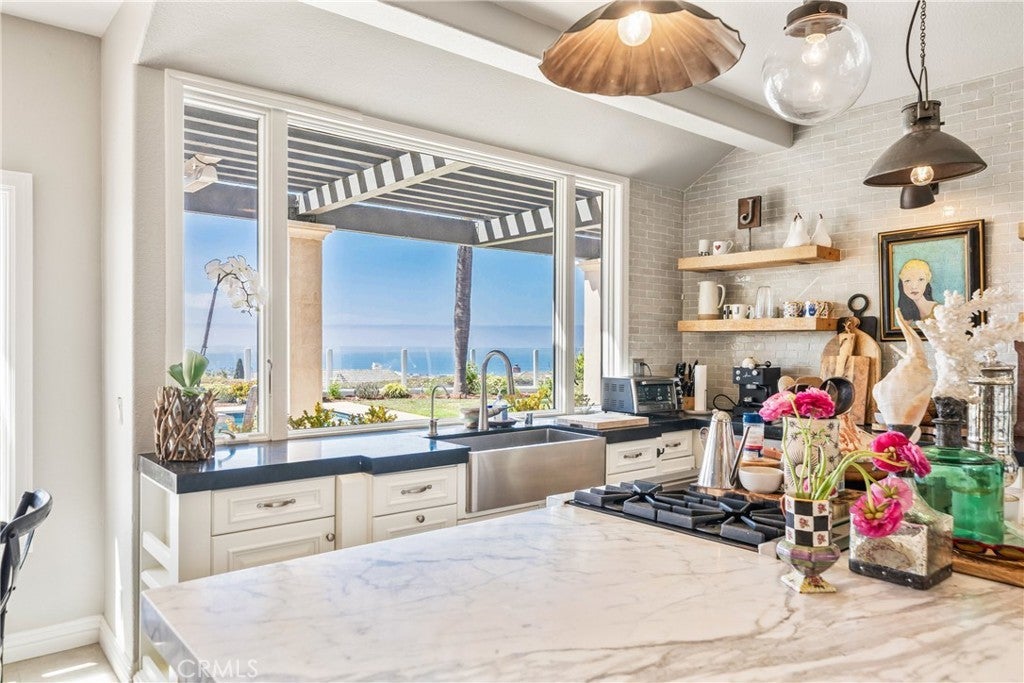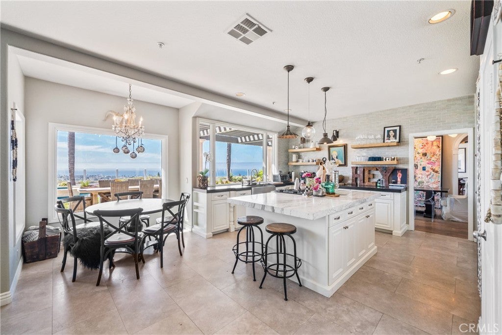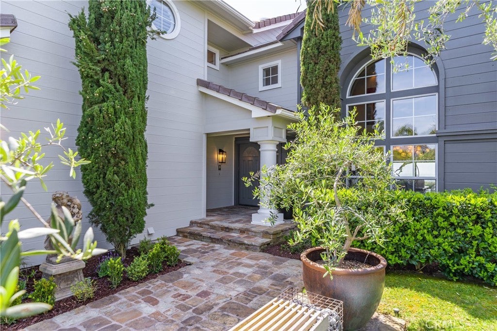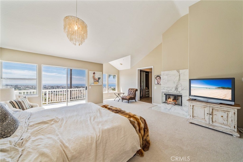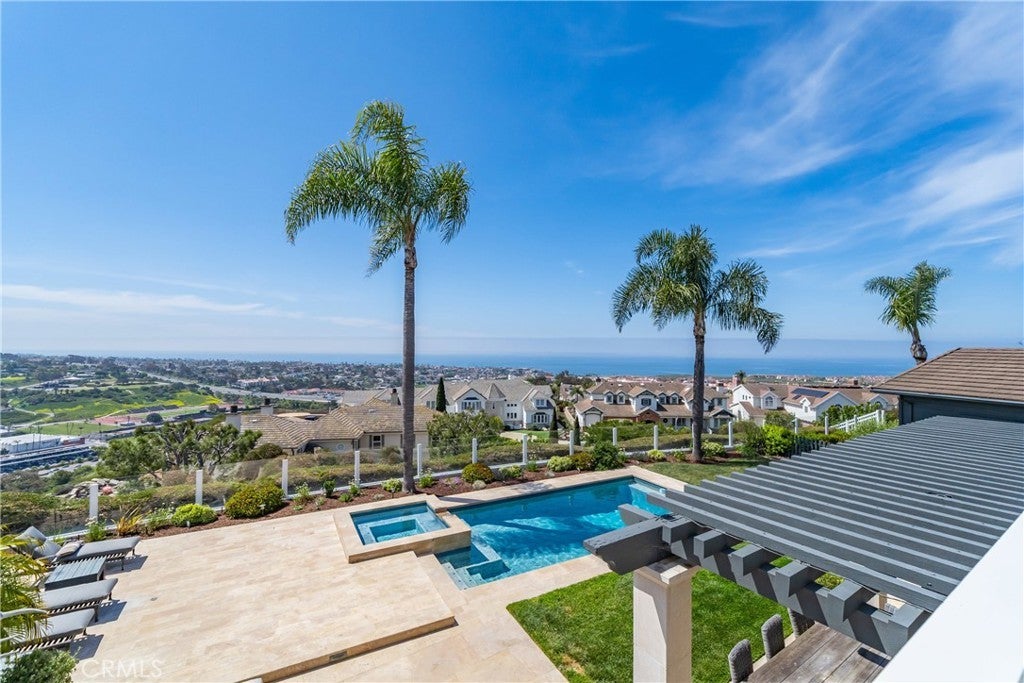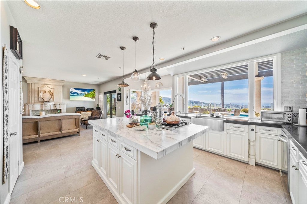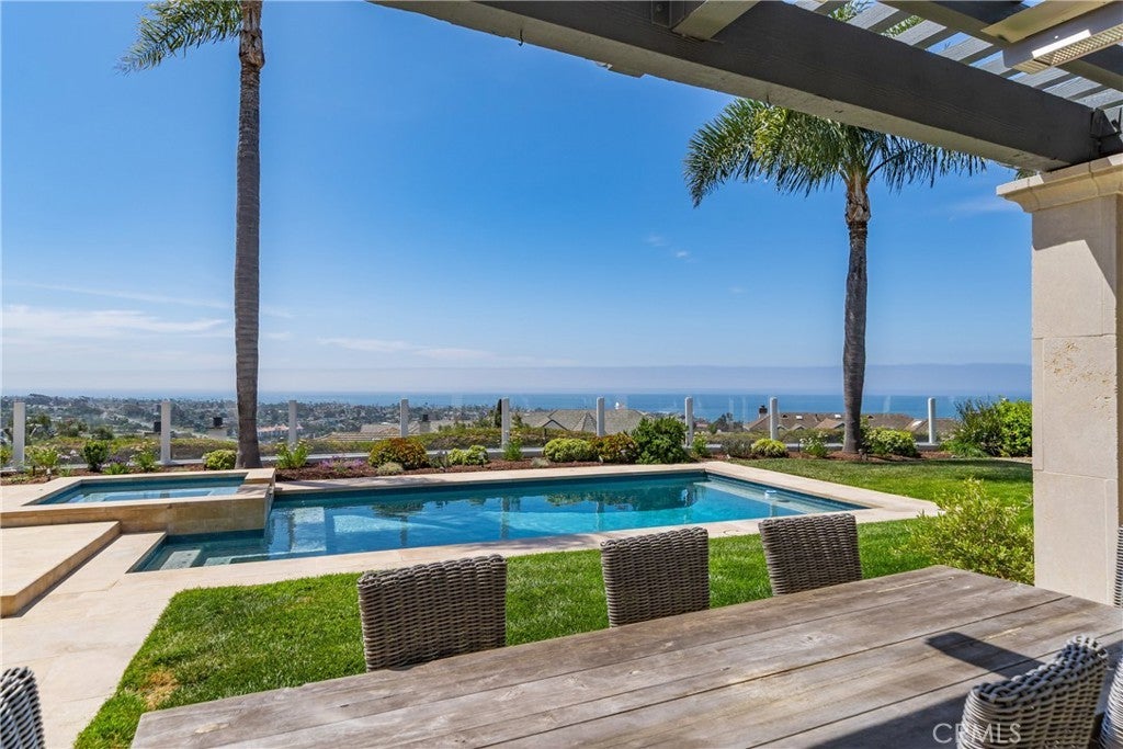 This light-filled home is set on a premier San Clemente terrace, with sweeping 180-degree ocean, Catalina, and city light views in a refined coastal setting. This private enclave is a thoughtfully designed 4409 sq ft estate, featuring 5+ bedrooms and 6 bathrooms. A Dakota stone pathway leads past Cypress and a majestic olive tree, setting the tone of timeless European influences with quintessential Southern California style. Inside, a voluminous entryway with Versailles-pattern limestone and custom ironwork handrail, leads to vaulted ceilings, carved stone fireplaces, and generous living spaces with seamless indoor-outdoor flow. The sunny attached casita, with ADU possibilities, has a private entrance, full bath, and temperature-controlled wine room that is ideal for guests, creative use, wine pairing, or a wellness studio. The panoramic ocean views are on full display from most every room. The eat-in family kitchen is cooking, showcasing top-tier appliances, a statuary marble island, honed black marble countertops, a large pantry and open wood shelving. Even the kitchen sink has amazing views. Off of the kitchen is a den/tv room with an amazing hand carved fireplace, wine fridge and more sit down ocean views. A second, main-level guest suite with full bath adds flexibility for all. The formal living room soars with 22 foot ceilings, walls of glass, and another amazing hand carved stone fireplace. The dining room has perfect ocean views. The primary suite is a true retreat with commanding ocean views a custom built walk-in closet, and glass doors that open to a breathtaking sundrenched deck with panoramic ocean views. The primary bath is a luxurious retreat with custom stonework, and a soaking tub with an ocean view. Outside, enjoy an expansive French limestone patio with French limestone columns under a huge trellis. Towering palms frame the solar heated French blue pool with waterfall spa and the custom Dakota stone and limestone finished fireplace. A sleek glass back fence offers unobstructed views. The teak outdoor shower adds a luxurious resort touch. Located at the end of a quiet cul-de-sac within the prestigious guard-gated community of Marbelhead, this home offers a 3-car garage and 3 additional parking spaces in the driveway. Moments from world-class beaches, restaurants, shopping, schools, and recreation. This is a rare coastal-soul offering combining elegant craftsmanship, ocean view serenity, and resort-caliber amenities.