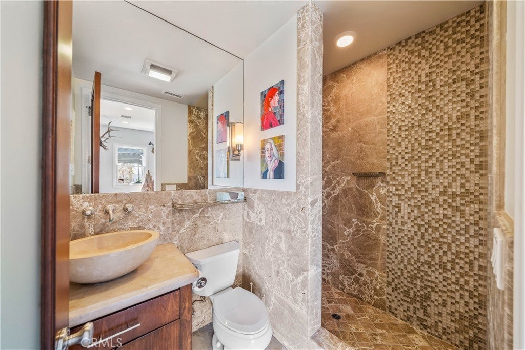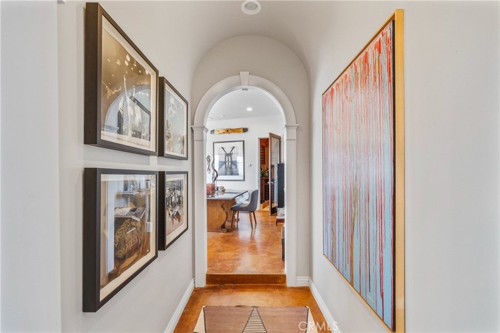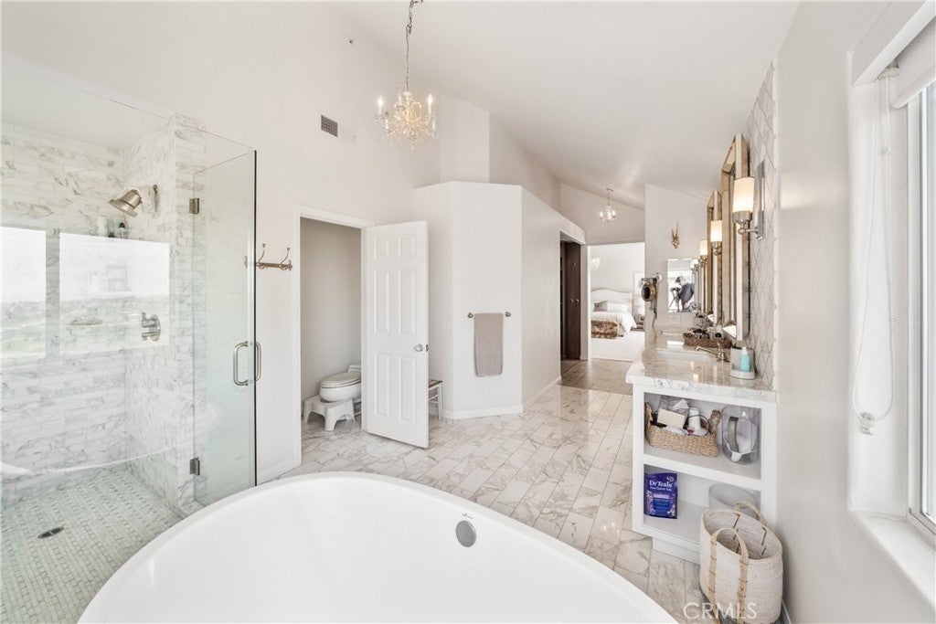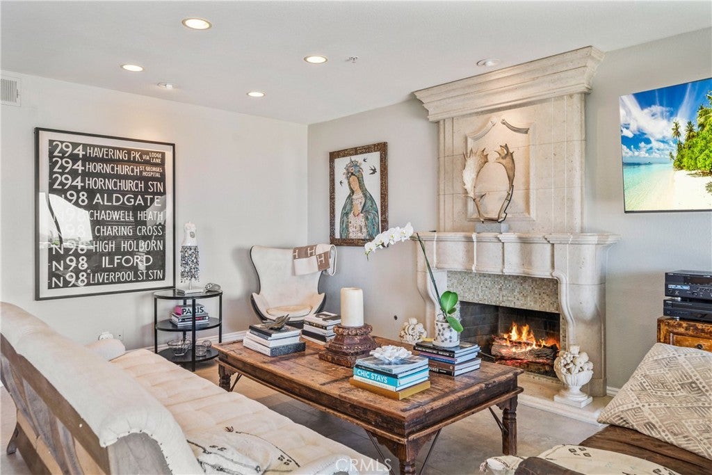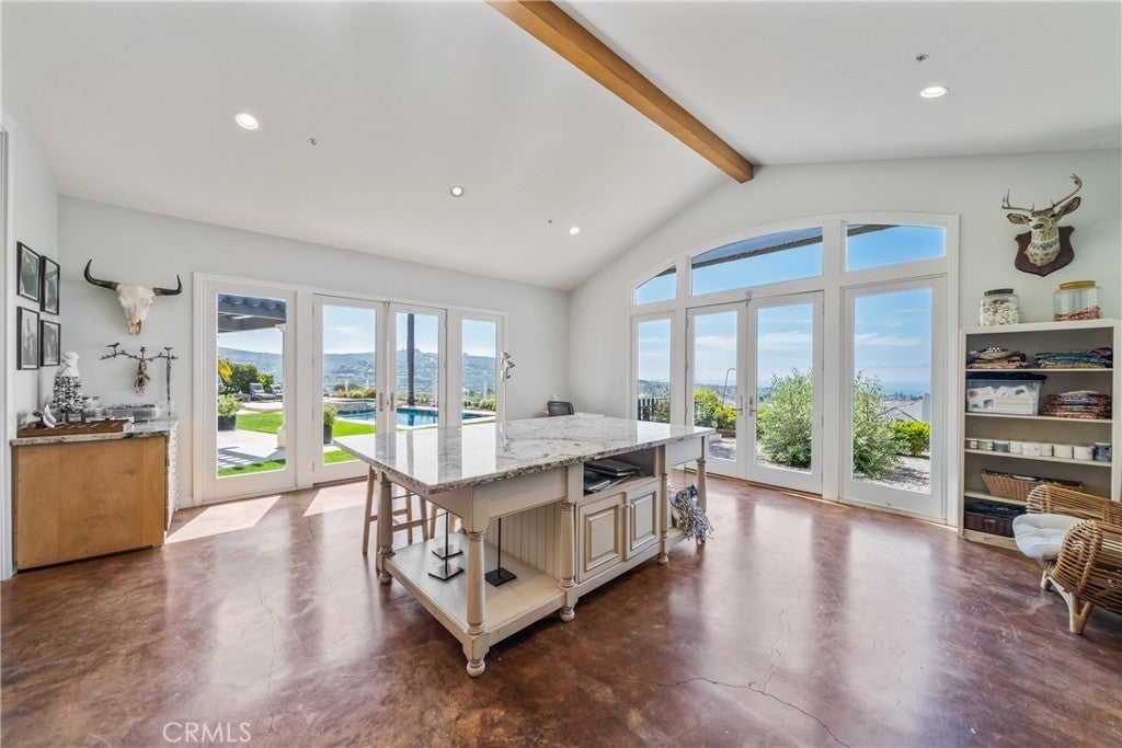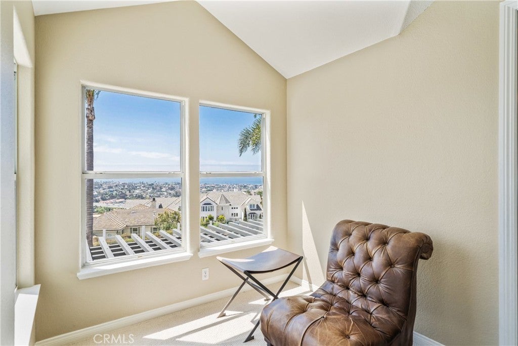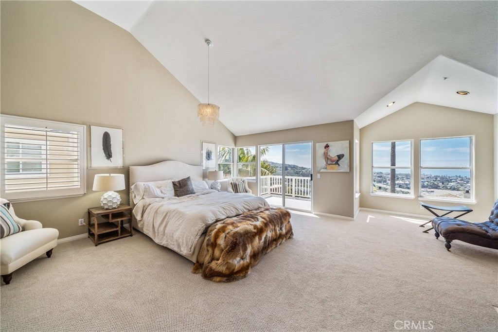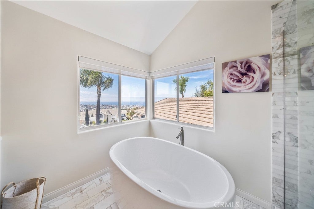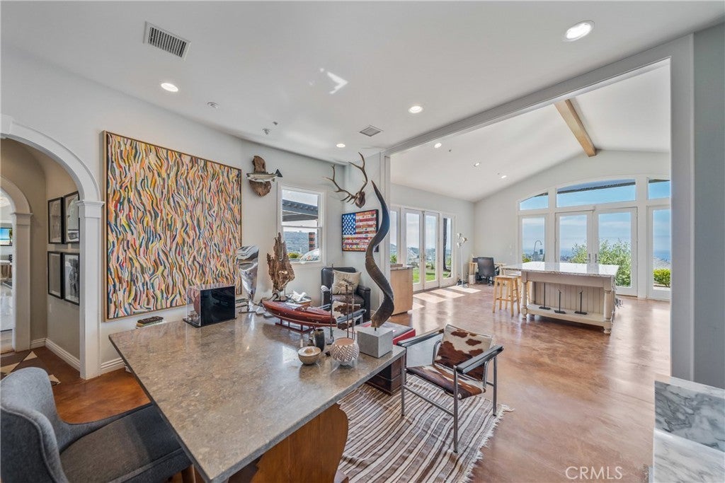 This light-filled home is set on a premier San Clemente terrace, with sweeping 180-degree ocean, Catalina, and city light views in a refined coastal setting. This private enclave is a thoughtfully designed 4409 sq ft estate, featuring 5+ bedrooms and 6 bathrooms. A Dakota stone pathway leads past Cypress and a majestic olive tree, setting the tone of timeless European influences with quintessential Southern California style. Inside, a voluminous entryway with Versailles-pattern limestone and custom ironwork handrail, leads to vaulted ceilings, carved stone fireplaces, and generous living spaces with seamless indoor-outdoor flow. The sunny attached casita, with ADU possibilities, has a private entrance, full bath, and temperature-controlled wine room that is ideal for guests, creative use, wine pairing, or a wellness studio. The panoramic ocean views are on full display from most every room. The eat-in family kitchen is cooking, showcasing top-tier appliances, a statuary marble island, honed black marble countertops, a large pantry and open wood shelving. Even the kitchen sink has amazing views. Off of the kitchen is a den/tv room with an amazing hand carved fireplace, wine fridge and more sit down ocean views. A second, main-level guest suite with full bath adds flexibility for all. The formal living room soars with 22 foot ceilings, walls of glass, and another amazing hand carved stone fireplace. The dining room has perfect ocean views. The primary suite is a true retreat with commanding ocean views a custom built walk-in closet, and glass doors that open to a breathtaking sundrenched deck with panoramic ocean views. The primary bath is a luxurious retreat with custom stonework, and a soaking tub with an ocean view. Outside, enjoy an expansive French limestone patio with French limestone columns under a huge trellis. Towering palms frame the solar heated French blue pool with waterfall spa and the custom Dakota stone and limestone finished fireplace. A sleek glass back fence offers unobstructed views. The teak outdoor shower adds a luxurious resort touch. Located at the end of a quiet cul-de-sac within the prestigious guard-gated community of Marbelhead, this home offers a 3-car garage and 3 additional parking spaces in the driveway. Moments from world-class beaches, restaurants, shopping, schools, and recreation. This is a rare coastal-soul offering combining elegant craftsmanship, ocean view serenity, and resort-caliber amenities.