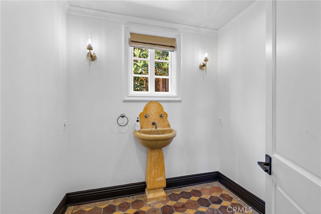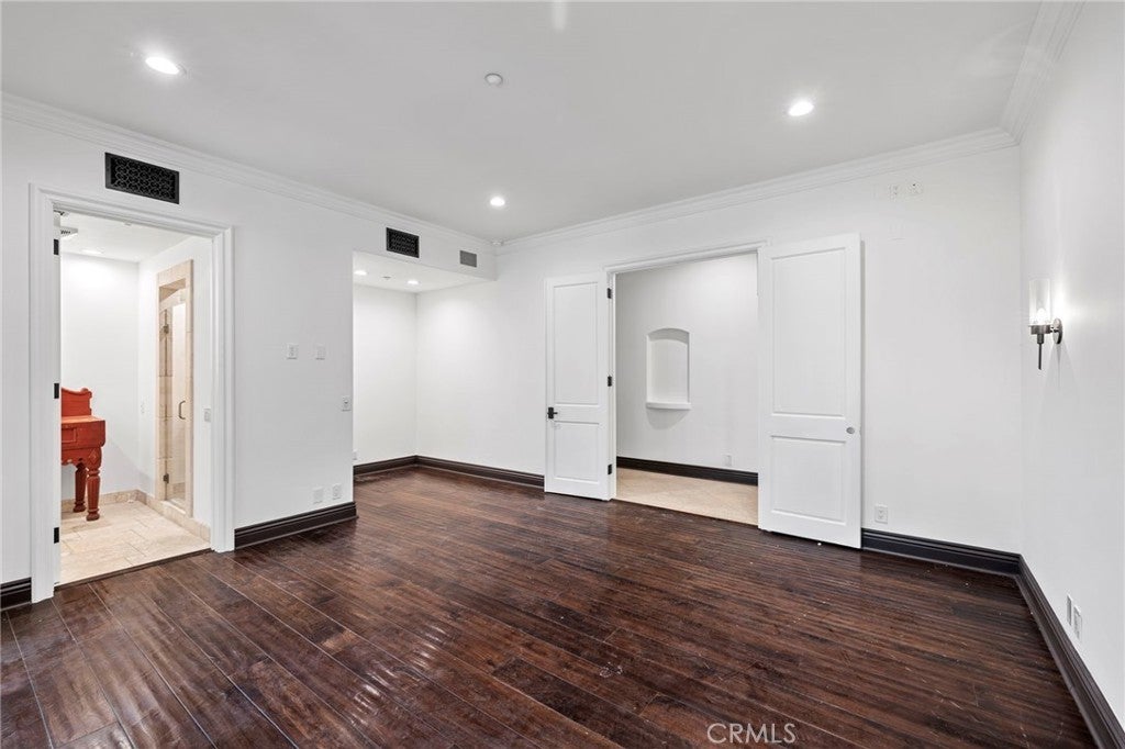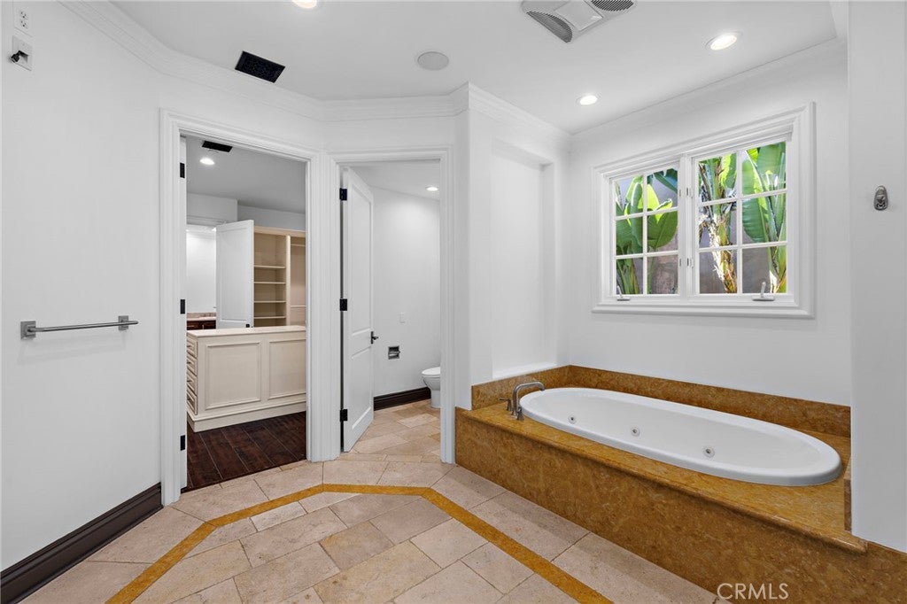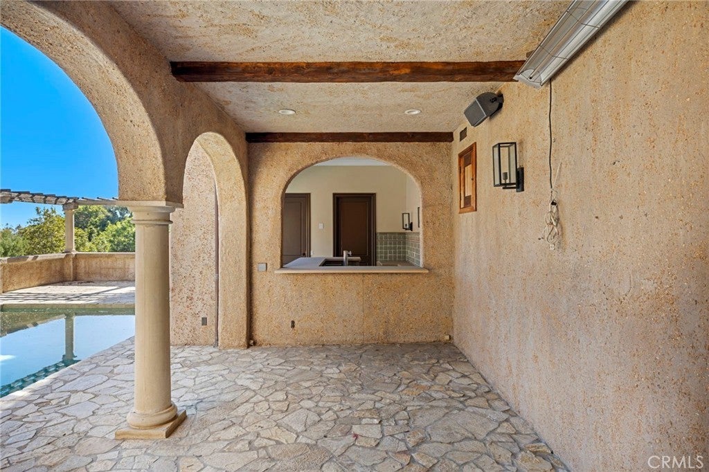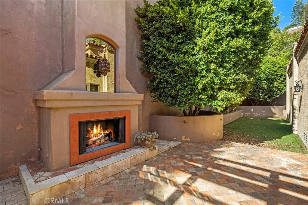 Great value and priced for IMMEDIATE occupancy! Impressive private gate leads you to this Mediterranean VIEW Estate on a quiet cul-de-sac. 5 bedrooms with desirable and hard to find PRIMARY BEDROOM ON THE MAIN LEVEL!, 8 bathrooms, 4 fireplaces, pool/spa and city light view. Gourmet granite kitchen features Viking appliances, large island and walk-in pantry. Very bright with 17 sets of French doors, soaring 9 1/2 foot and 10 foot ceilings, quality wood and stone flooring throughout. The spacious primary bedroom has a large walk-in closet with custom built-ins, fireplace, and French doors leading to a large balcony. The lower level has a HUGE great room plus three and a half baths. All three downstairs bedrooms have their own bathrooms with access to balconies. The rear yard overlooks treetops and city light views, pool/spa, outdoor bar, and full bathroom. The side yard has a lawn area, two fountains, cozy fireplace and seating area. Property is directly across the street from the new LeBron James Estate. Perfect floor plan for multi-generation family! Can be offered furnished for $35k/mo with one month deposit. Will consider shorter term furnished or unfurnished. Prices vary by month and length of stay. PERFECT FOR VACATIONS, REMODELING, OR FIRE/FLOOD SITUATIONS.