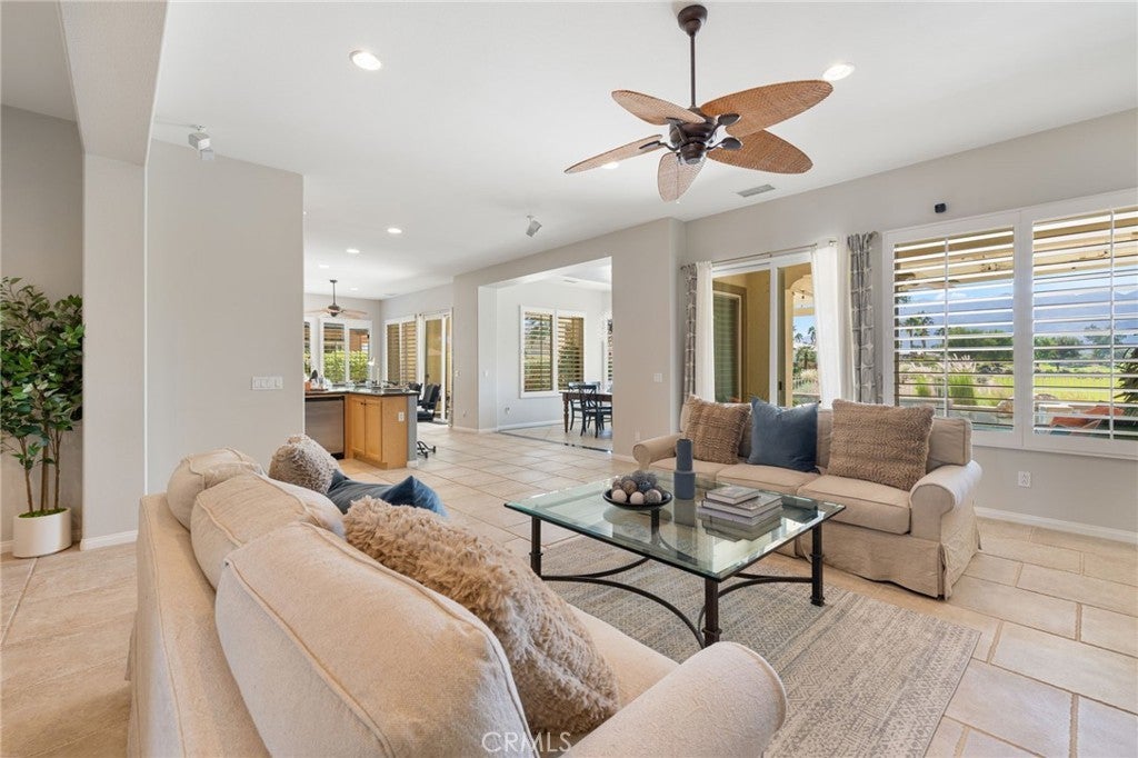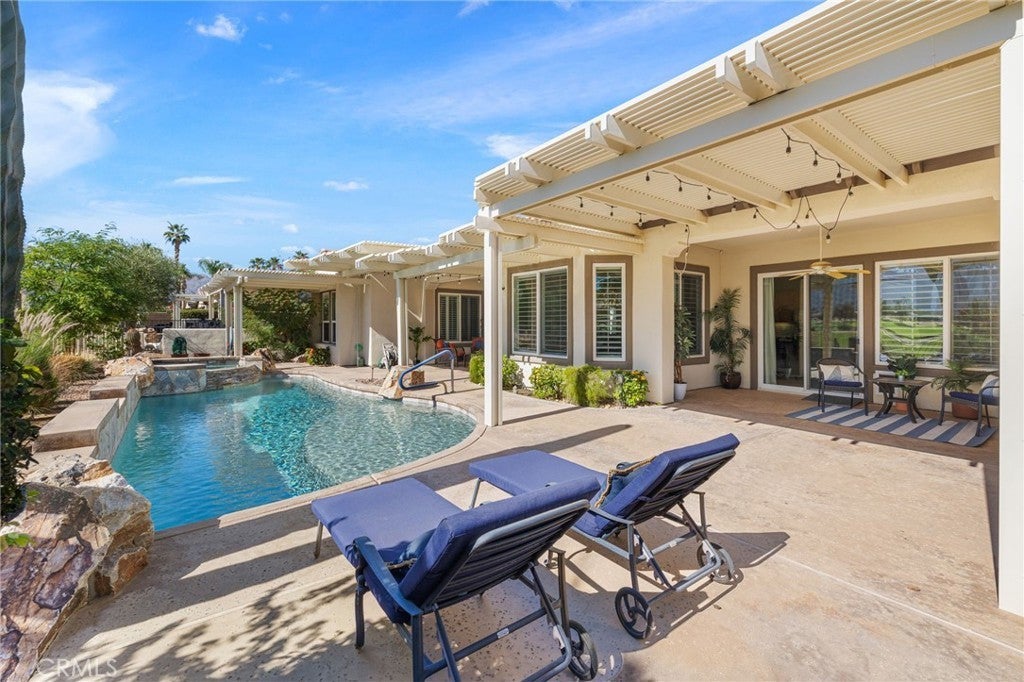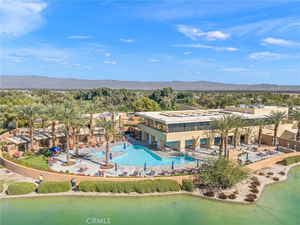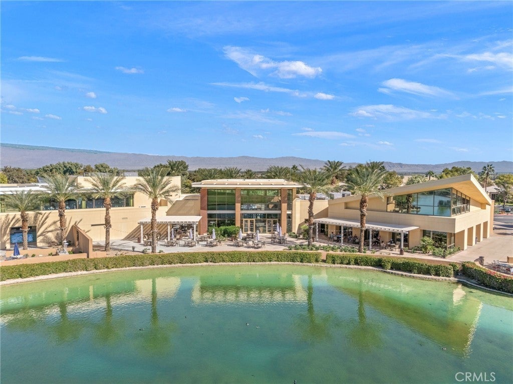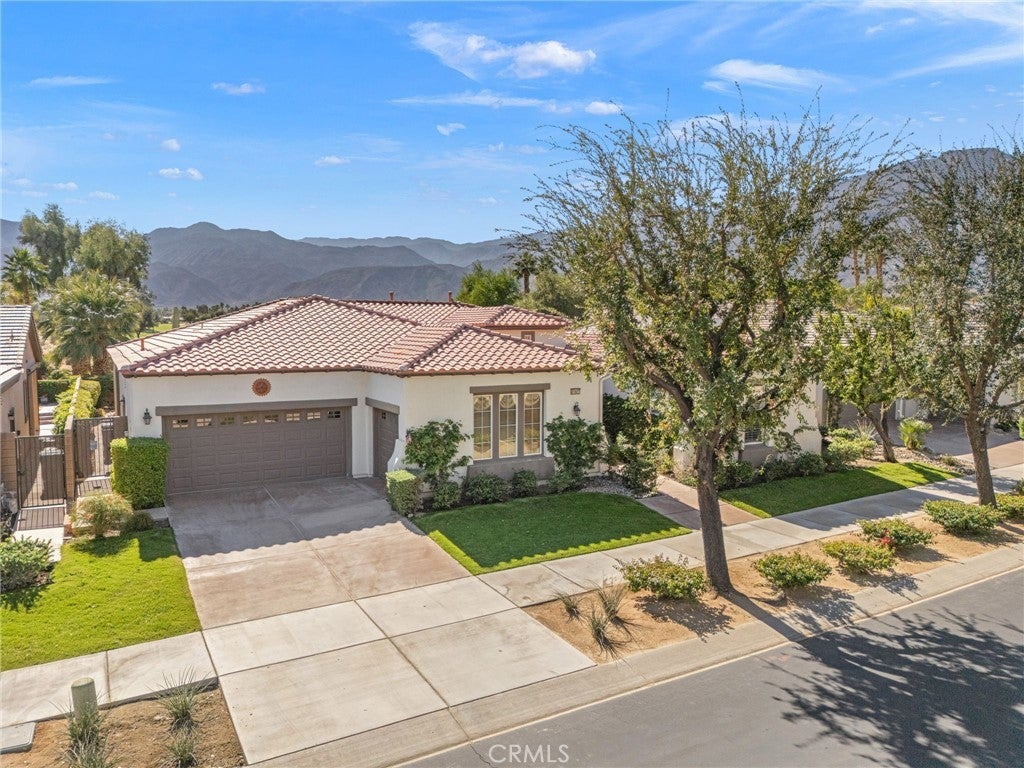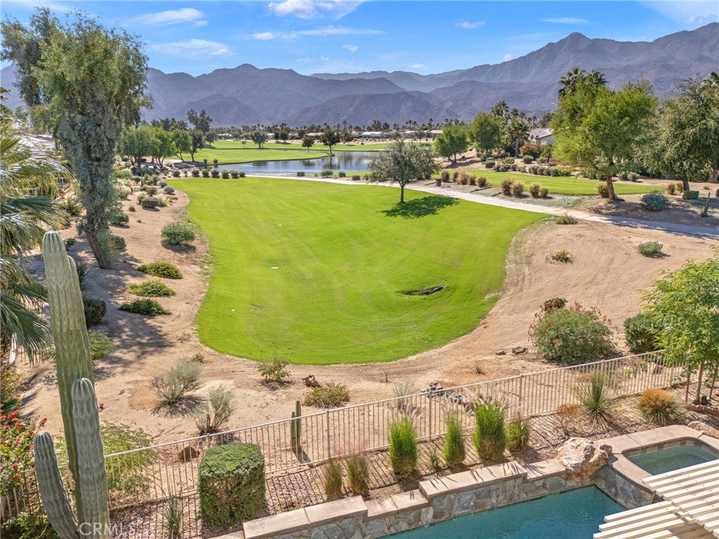 Discover one of the finest views in Trilogy La Quinta’s 55+ resort community. This exceptional Tamarisk model—with over 2,700 sq. ft., 3 bedrooms, 4 baths, and a private casita—overlooks two fairways and a serene lake, offering a truly breathtaking backdrop. Inside, the gourmet kitchen shines with stainless steel appliances, slab granite countertops, a large center island, trash compactor, custom stone backsplash, pantry, ceiling fans, and a cozy breakfast nook. The formal dining room captures beautiful views of the mountains and pool, perfect for elegant gatherings. The spacious great room is designed for comfort, featuring an entertainment niche, surround sound, ceramic tile flooring, and custom window treatments. A separate den can easily function as an additional sleeping space, and the powder room serves as a three-quarter bath for added convenience. The primary suite offers upgraded recently remodeled dual vanities, a large beautiful shower, and a walk-in closet. All bedrooms are upgraded with new carpet, custom drapes, insulating drop-down shades, ceiling fans, and updated fixtures. The casita is perfect for caretaker, guests or extended stays. Outdoors, enjoy beautiful dual paved patios with patio roof shade structures, framing a sparkling saltwater pool with waterfalls and rockwork, and spa ideal for relaxation or entertaining. The three-car garage comes fully outfitted with built-in cabinets, a workbench, and an evaporative cooler. A rare combination of luxury, comfort, all with one of Trilogy’s most remarkable views.