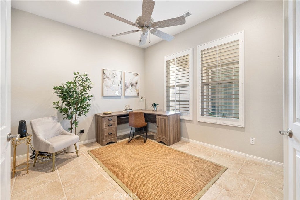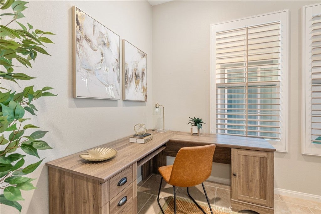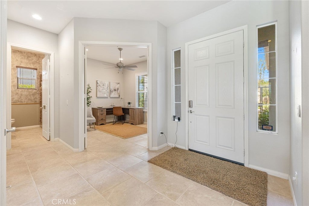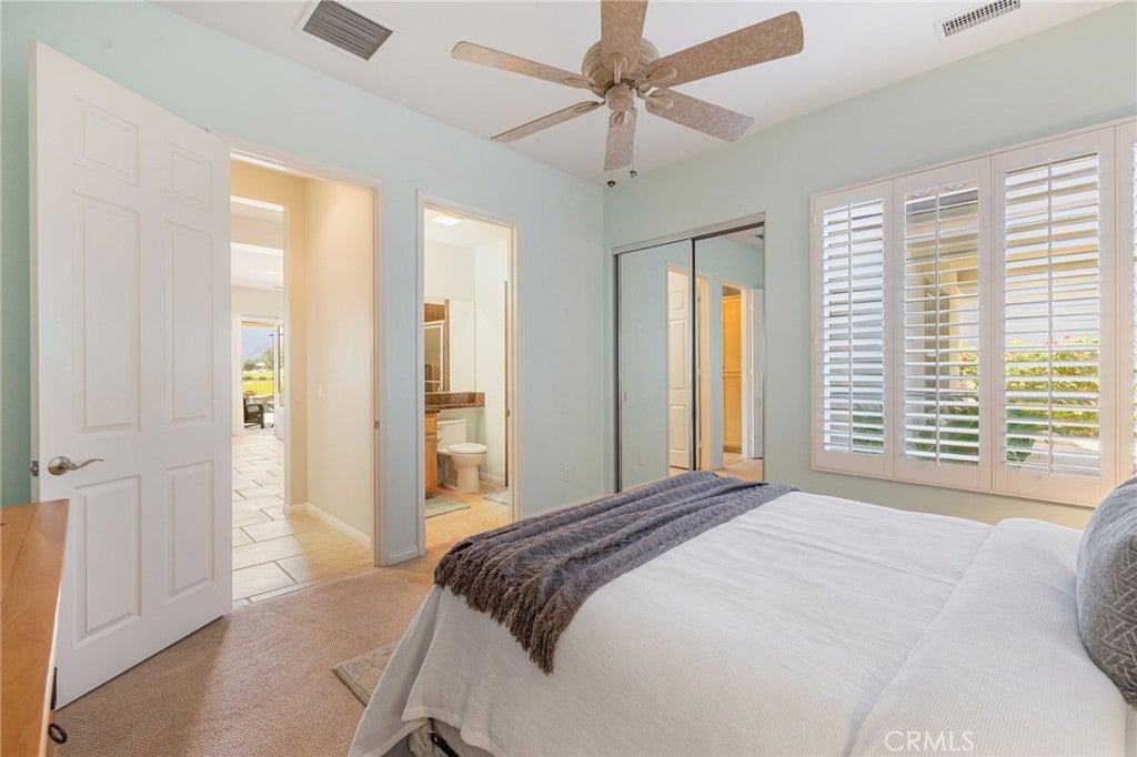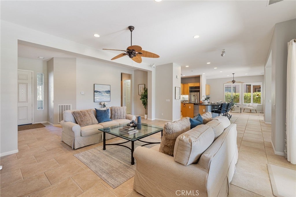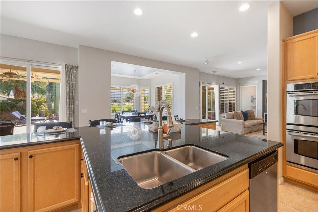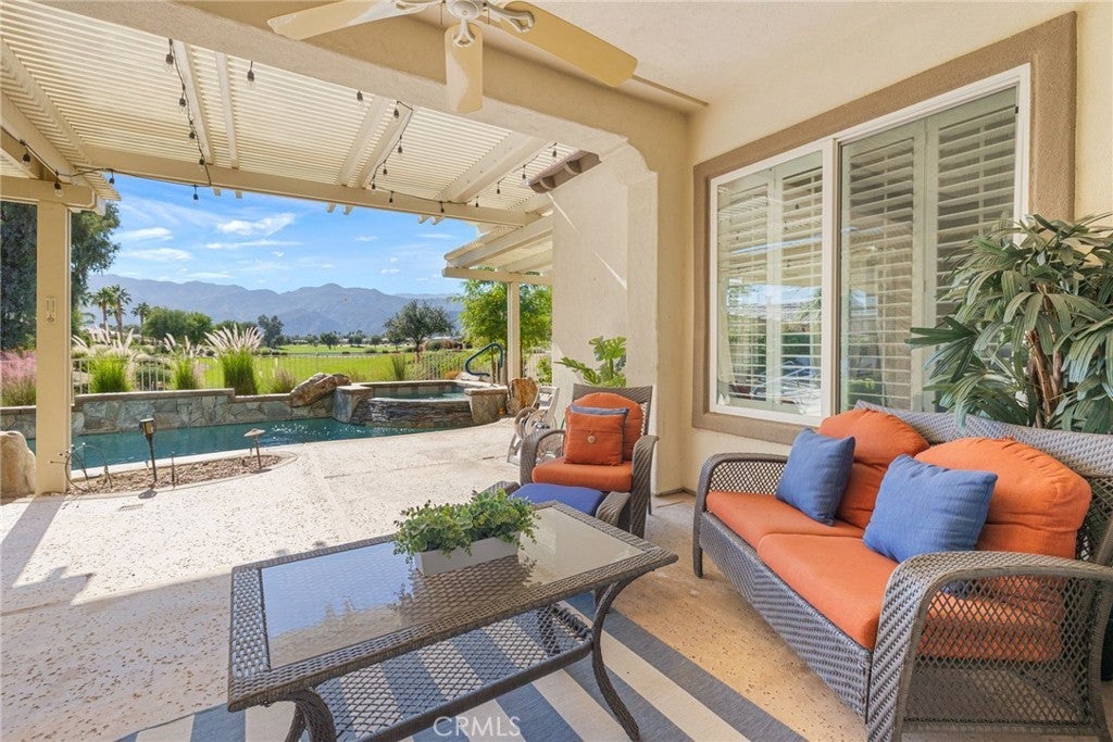 Discover one of the finest views in Trilogy La Quinta’s 55+ resort community. This exceptional Tamarisk model—with over 2,700 sq. ft., 3 bedrooms, 4 baths, and a private casita—overlooks two fairways and a serene lake, offering a truly breathtaking backdrop. Inside, the gourmet kitchen shines with stainless steel appliances, slab granite countertops, a large center island, trash compactor, custom stone backsplash, pantry, ceiling fans, and a cozy breakfast nook. The formal dining room captures beautiful views of the mountains and pool, perfect for elegant gatherings. The spacious great room is designed for comfort, featuring an entertainment niche, surround sound, ceramic tile flooring, and custom window treatments. A separate den can easily function as an additional sleeping space, and the powder room serves as a three-quarter bath for added convenience. The primary suite offers upgraded recently remodeled dual vanities, a large beautiful shower, and a walk-in closet. All bedrooms are upgraded with new carpet, custom drapes, insulating drop-down shades, ceiling fans, and updated fixtures. The casita is perfect for caretaker, guests or extended stays. Outdoors, enjoy beautiful dual paved patios with patio roof shade structures, framing a sparkling saltwater pool with waterfalls and rockwork, and spa ideal for relaxation or entertaining. The three-car garage comes fully outfitted with built-in cabinets, a workbench, and an evaporative cooler. A rare combination of luxury, comfort, all with one of Trilogy’s most remarkable views.