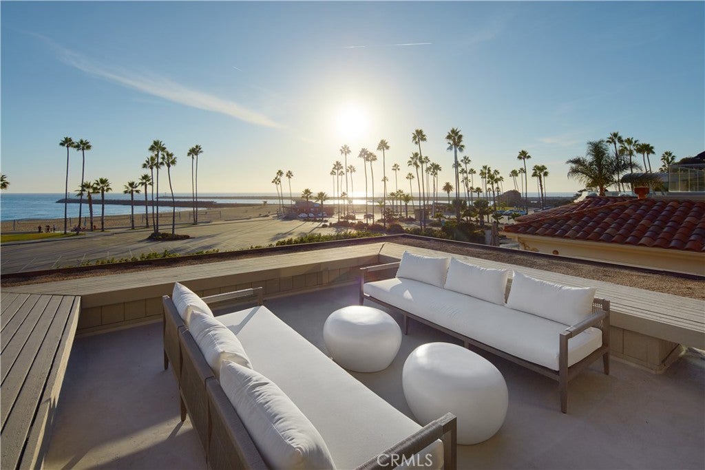 Just feet from the sand in Corona del Mar, behind the gates of the exclusive Breakers Drive enclave and on the market for the first time since its construction, this once-in-a-lifetime residence overlooks Big Corona Beach, the stone jetties that line Newport Harbor’s entrance channel, Catalina Island, breaking waves, and dramatic coastline bluffs. Virtually hidden from the street above and exceptionally private on every level, this coastal gem of approximately 5,084 square feet consists of a 5-bedroom, 3.5-bath main residence, and a separate 2-bedroom, 2-bath ADU with front-row ocean views which is currently leased and offers outstanding income potential. The home’s private entry introduces the lowest floor and hosts an office or bedroom with ensuite bath and a wet bar. Offering separate outside access, a media lounge with tray ceiling and wet bar can easily become a studio or home gym. Floating stairs lead to the main level of the residence, which impresses with stunning ocean and beach views, a towering double-height vaulted ceiling with floor-to-ceiling windows, access to a spacious ocean-view terrace, a fireplace with bookmatched stone surrounds, a wet bar, and a dining room with built-in buffet. An island kitchen shines with granite countertops, Thermador and Sub-Zero appliances, and a fireplace-warmed breakfast room opening to a private rear patio with automated sprinklers. Locking gates lead from the patio to the street behind and a short stroll to Corona del Mar’s village shops and restaurants. The patio can also be reached by a wood-paneled guest room. On the top floor, an open landing overlooks the living room below and leads to two ocean-view guest rooms, with one leading to a beach-view balcony, and another offering access to a private rear balcony. Separate from the guest bedrooms, the primary suite is fully appointed with a balcony overlooking the ocean, a cedar-lined walk-in closet and a sauna with door to the rear balcony. Mid-Century style is complemented by clerestory windows, vaulted open-beam ceilings, custom built-ins, and a period-perfect intercom system. Enjoy easy access to Big Corona’s broad beach, tide pools, Fashion Island, Pelican Hill, and John Wayne Airport.