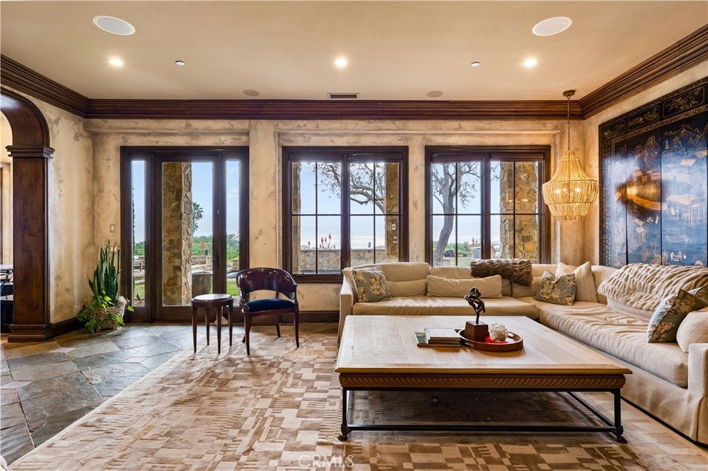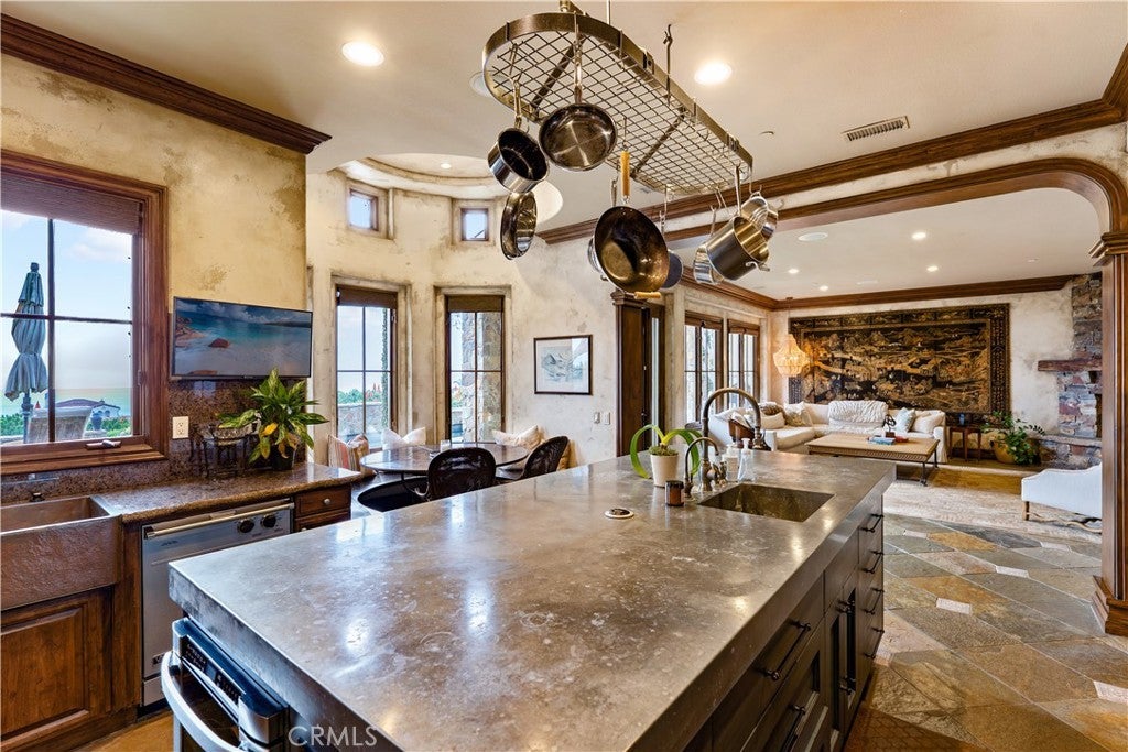 This exquisite single level estate is available for lease! Located in the coveted Crystal Cove neighborhood, the home offers panoramic ocean views from Laguna Beach to Palos Verdes. The Customized and Expanded floorpan has 4 bedrooms, 6 bathrooms, plus a home office with custom built-ins. The Piano sits within the formal living and dining room area complete with French doors and a fireplace. The Chefs kitchen includes a 6 burner Professional Viking range and griddle, Viking dishwasher, 2 sub zero refrigerators and freezers, wine cooler and an elaborate butler's pantry. The large zinc counter top island includes a new sink and fixtures. The expanded family room with fireplace offers ocean views, along with the primary suite with fireplace. The primary bathroom includes a steam shower/built-in tv, dual custom walk-in closets with built-ins. There is a 5 car heated garage with commercial grade 9'2" door, indoor basketball hoop, private bath, sub zero refrigerator, wired for electric car and a gym set up. The oversized secluded lot is nestled in the end of a private cul de sac, and includes succulent gardens, a private saltwater pool/spa, built in BBQ, retractable awnings and an outdoor fireplace.The home is just a short leisurely walk to the incredible shops and restaurants located in the Crystal Cove Shopping Center. The Crystal Cove Canyon Club private recreation center for residents serves as a social hub with resort-style amenities; a Junior Olympic pool, fitness center, sports courts, and event spaces within. 58 Timor Sea is Available for lease December 2025 - May 2026.