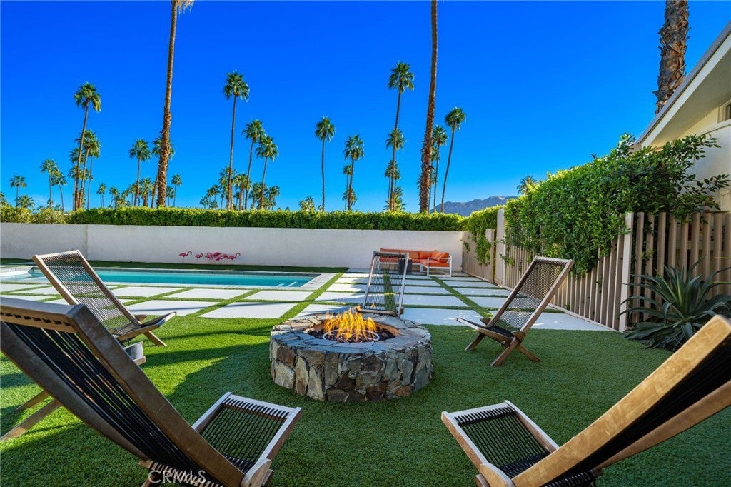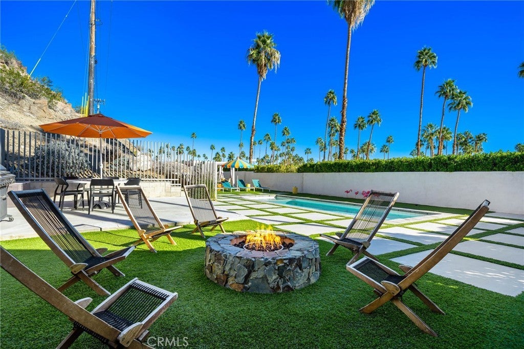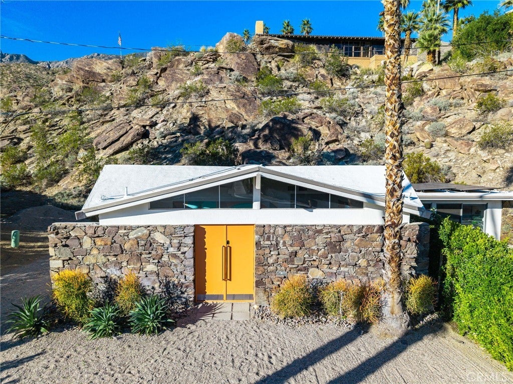 Welcome to a unique and notable Indian Canyons' Mid-Century modern retreat with a notable AirBnb history. This fully furnished desert escape offers privacy, history, and undeniable Palm Springs style. Rumored to be the original clubhouse for Canyon View Estates, this architectural gem sits on an approximately 18,000 sq ft lot at the base of the mountain, delivering breathtaking hillside and mountain views with true resort vibes. The home’s dramatic 8-beamed umbrella ceiling and clerestory windows flood the great room with natural light, creating a striking yet relaxed atmosphere, perfect for entertaining or unwinding. The updated kitchen and dining area open to a impressive private backyard oasis tucked against the hillside, complete with pool, spa, shaded gazebo, gas firepit, and lush palms—ideal for sunset gatherings and starry nights. The primary suite is a peaceful retreat with hillside views, a walk-in closet, and ensuite bath, while the guest bedroom enjoys access to a spa-inspired bathroom featuring a substantial walk-in shower and picture window capturing the surrounding desert landscape. Offered fully furnished and turnkey, this home is thoughtfully equipped with luxury-comfort beds, smart TVs, in-house laundry, a fully stocked kitchen flexible workspace options, solar blinds, blackout curtains, and abundant private parking. Energy-efficient living is enhanced by 32 OWNED solar panels and a 10kWh battery, significantly offsetting electricity costs. The land lease has been renewed and does not expire until 2080! Just minutes from downtown Palm Springs, Murray Canyon hiking trails, and the new Palm Springs Surf Club, this one-of-a-kind residence blends architectural significance with modern comfort—offering a lifestyle as unforgettable as the setting.