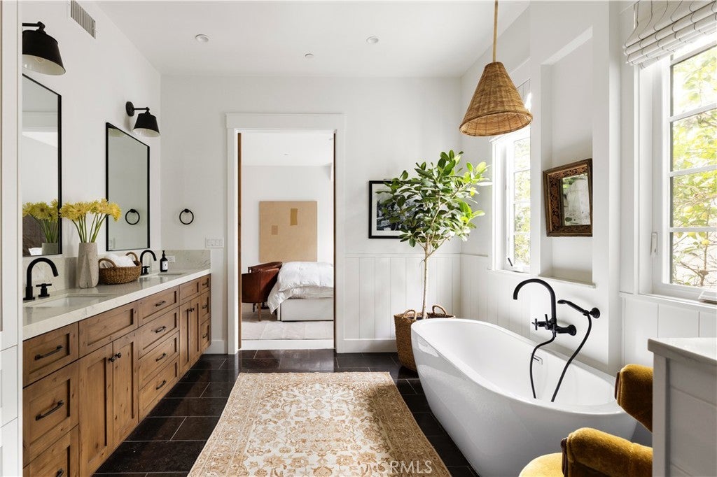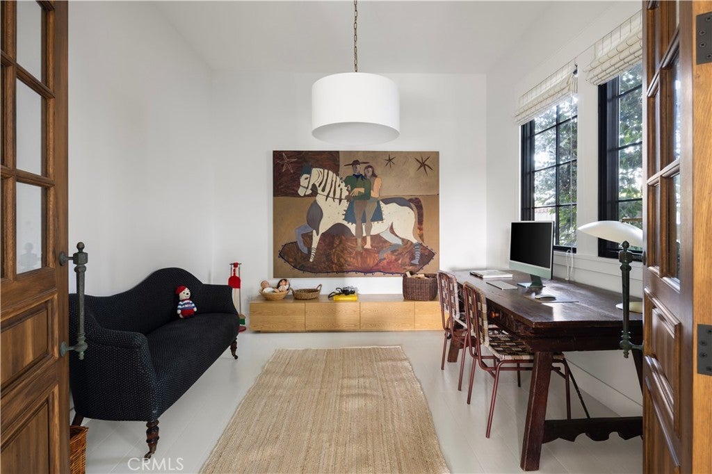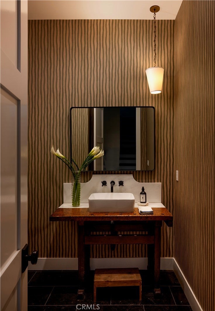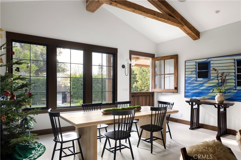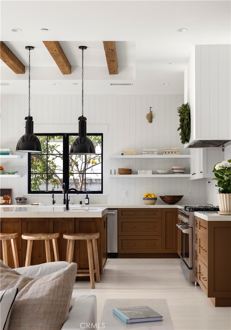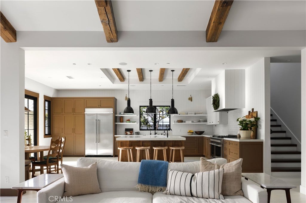 Tucked behind privacy hedges on a coveted block in Eastside Costa Mesa, 224 Flower Street is a thoughtfully designed custom residence blending timeless architecture with refined, modern-traditional interiors. Set within a generous enclosed front yard, the home features an inviting front porch with outdoor fireplace and brick detailing ideal for al fresco dining, offering a rare sense of privacy and an immediate feeling of retreat. The personal residence of a notable interior designer, the interiors reflect a collected, intentional design philosophy with custom fit and finishes throughout. Vaulted ceilings with reclaimed oak beams, a white brick fireplace, and abundant natural light anchor the main living spaces, while the chef’s kitchen features a generous center island, London Quartz countertops, custom cabinetry, open shelving, and a built-in breakfast nook. Open sightlines connect seamlessly to the dining area, family room, and a flexible adjoining space suitable for a playroom, office, or gym. The main-level primary suite includes a spa-inspired en suite bath with soaking tub, dual-head shower, and walk-in closet. A guest powder bath, spacious laundry room, and built-in mudroom complete the main level. Upstairs offers a secondary family room, three additional bedrooms, and two bathrooms, including a reconfigured layout where a former walk-in closet has been transformed into an en suite bathroom. Additional highlights include zoned air conditioning, a second-floor laundry chute, a tankless water heater, built-in speakers, and an oversized two-car garage with EV charging. Ideally located near award-winning schools, 17th Street shops and restaurants, and the beach, 224 Flower Street offers effortless Eastside living. *Seller may consider buyer concessions if requested in an offer*
