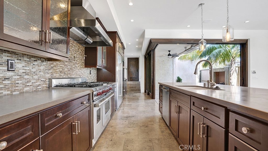 Coveted corner positioning just moments from Little Corona Beach defines this custom coastal residence offering four bedrooms and three-and-one-half baths across approximately 3,004 square feet. Soft Mediterranean architecture merges with refined transitional interiors, creating a home that feels both timeless and distinctly coastal. An inviting front patio with built-in seating and fire feature sets an elegant tone before entry. Hand-carved wood doors open to a dramatic great room framed by textured limestone, curated natural finishes, and abundant light. Expansive sliding glass panels dissolve the boundary between interior living and ocean air, creating effortless continuity across living, dining, and kitchen spaces. Designed for elevated everyday living, the kitchen centers around an oversized cement-topped island with generous preparation space, premium integrated appliances, a full-size wine refrigerator, and a professional-grade range complemented by a pot filler for added convenience. Primary suite offers a private coastal sanctuary with ocean views, fireplace, and a spa-caliber bath appointed with soaking tub, steam shower, and dual vanities. Rear patio extends the living experience with a statement fireplace and tranquil water wall feature, creating a serene backdrop for evening gatherings. Above, a rooftop deck captures sweeping Pacific vistas and cinematic sunsets, offering a rare vantage point above the Village. Additional enhancements include dual Gen 4 Nest Pro thermostats and a dedicated mini-split system within the primary suite for refined climate control. Positioned in the heart of Corona del Mar’s Village, moments from Little Corona, tide pools, Ocean Boulevard, and boutique dining along Pacific Coast Highway, this residence offers an exceptional level of walkability and coastal access within one of Orange County’s most sought-after enclaves.