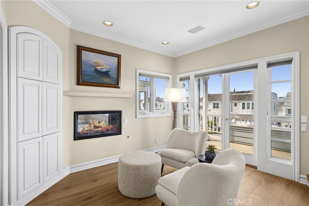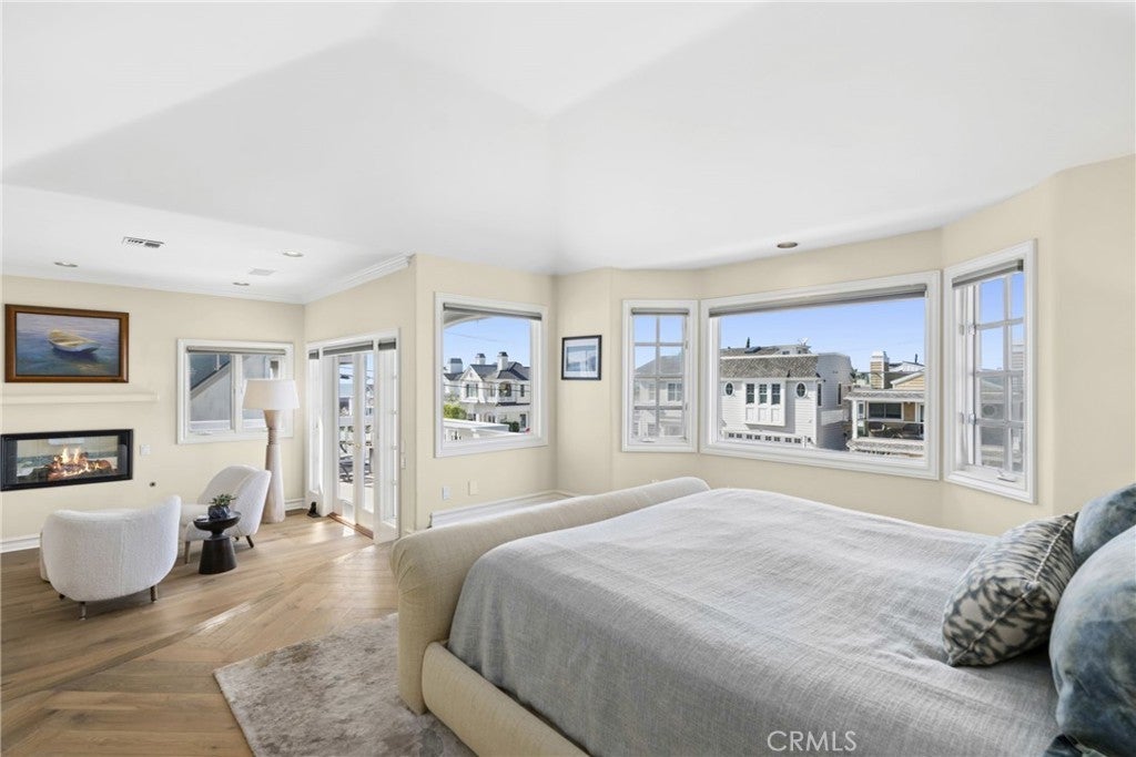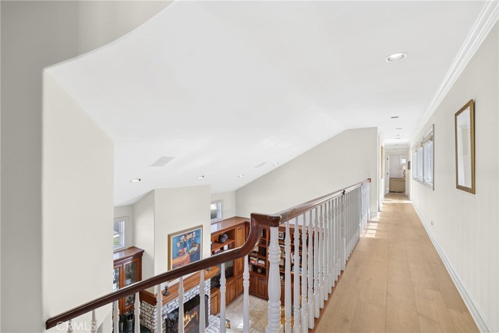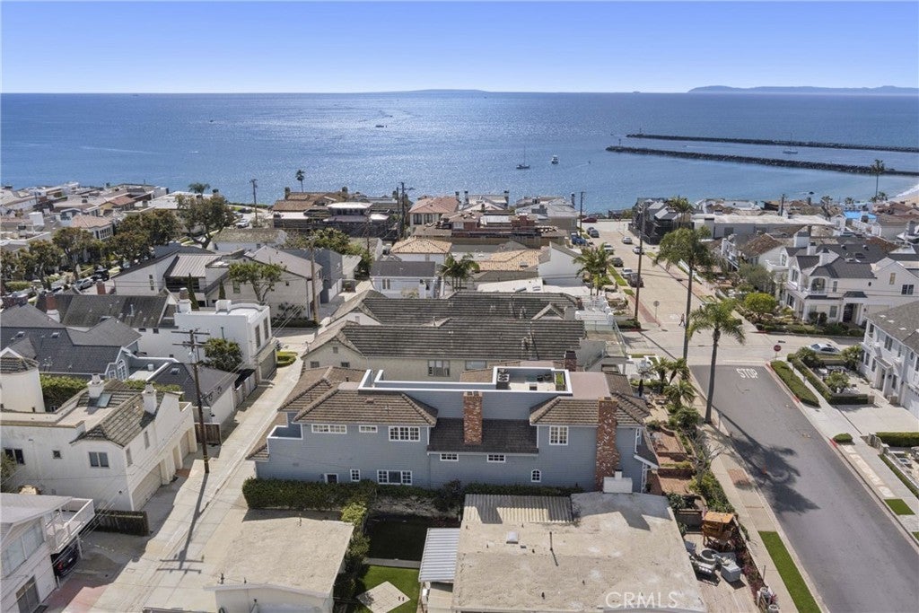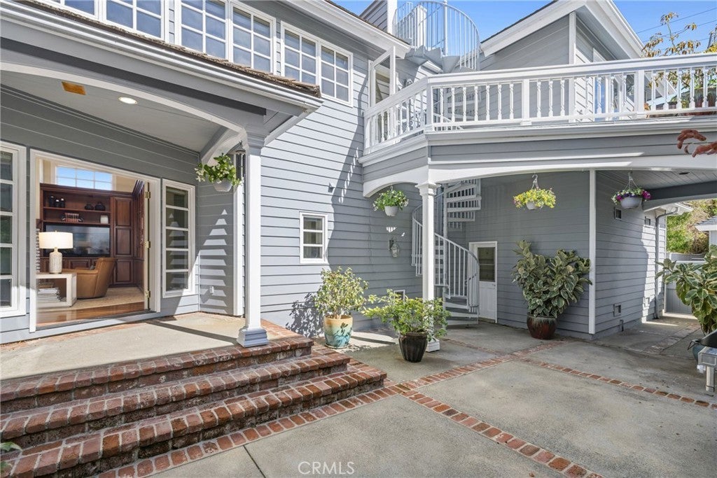 Set on an expansive 45 foot wide lot at the highest point of the street, this exceptional coastal residence captures sweeping ocean views and effortless indoor-outdoor living. A sprawling brick front patio serves as a quintessential seaside welcome framed by ocean vistas and seamlessly connected to the living room and formal dining room through walls of glass. Inside, the living room showcases coffered ceilings, a statement fireplace with classic mantel, custom built-ins. Thoughtfully appointed, the entertainer's kitchen supplies a Wolf oven, microwave, and six-burner range, reverse osmosis, granite countertops, a center island, appliance garage, walk-in pantry, and built-in desk. A sunlit breakfast nook is surrounded by windows overlooking the private backyard, complete with a built-in BBQ, outdoor shower, and spa plumbing, creating a natural extension of the home’s entertaining spaces. The adjacent family room offers another fireplace, custom built-ins, and a wet bar, while a dedicated wine room accommodates 500+ bottles for the discerning collector and entertainer. Additional main-level amenities include a spacious powder room, a private ensuite bedroom with tub and shower, and a well equipped laundry room with sink and abundant storage. The three car garage features soaring ceilings and storage, while whole home conveniences such as central vacuum, hot water circulation, and dual A/C systems enhance everyday comfort. A dramatic spiral staircase rises to a central gallery hall, introducing the home’s private bedroom level. The primary wing offers ocean views, a viewing balcony, a cozy seating area with a double-sided fireplace shared with the spa-inspired bath, and a morning coffee bar designed to savor the scenery without ever leaving the suite. Dual closets, including a generous walk-in, provide ample wardrobe storage. The primary bath features a jetted soaking tub, walk-in shower, dual vanities, makeup station, and a discreet TV cabinet. Three additional bedrooms complete the upper level: two connected by a Jack-and-Jill bath, and a fifth bedroom suite with its own tub and shower and private deck. For sunset gatherings and elevated coastal living, the spectacular rooftop deck delivers panoramic vistas spanning the Pacific Ocean, Fashion Island, the golf course, and shimmering city lights.