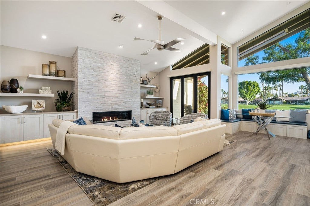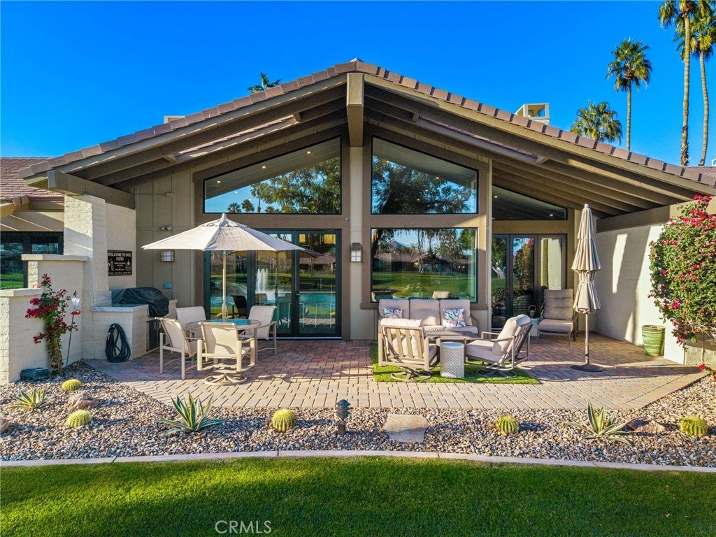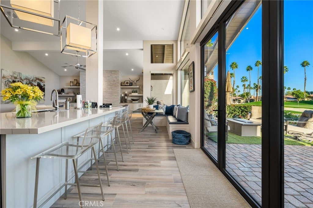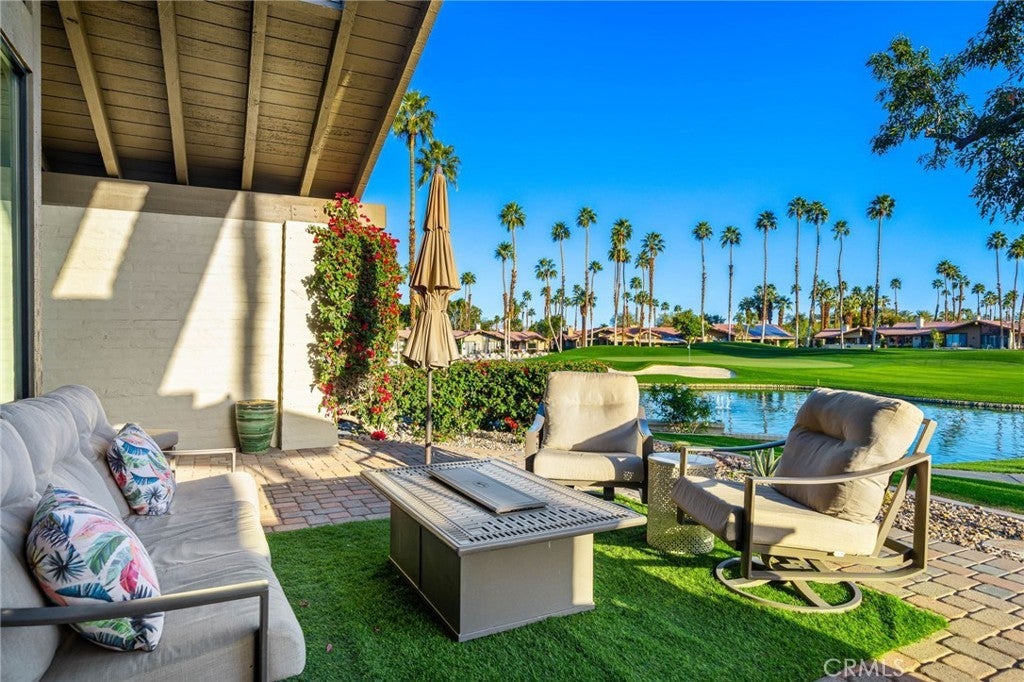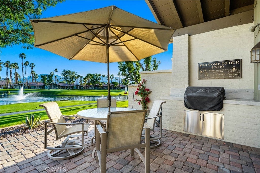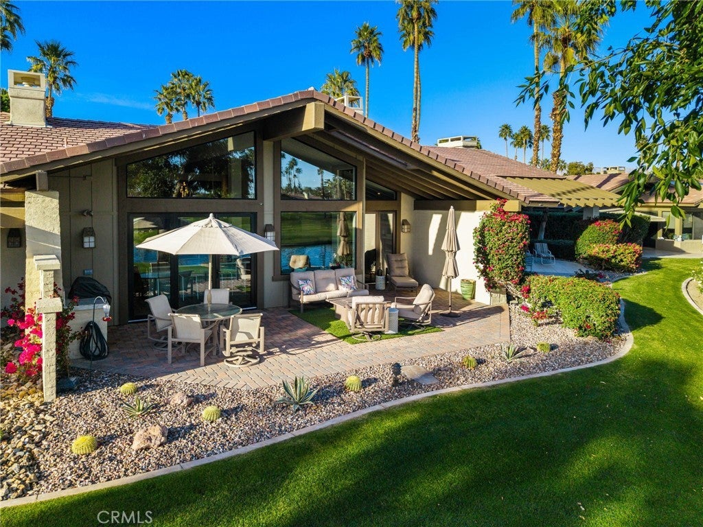 Welcome to resort living at its finest in The Lakes Country Club. This reimagined Taos floorplan offers 2,829 square feet of refined desert living with breathtaking views of the Santa Rosa Mountains, lake, water feature, and championship golf course. Homes of this caliber, rarely become available! A private gated courtyard leads to a fully redesigned open layout, ideal for everyday living and entertaining. The great room features a creamy stone fireplace and panoramic views, flowing into a breakfast banquette and chef’s kitchen with GE Monogram double ovens, gas cooktop, quartz countertops, and a large island with seating. Panoramic doors open to an oversized patio with built-in grill, stone counters, and stunning lake, mountain, and fairway views — perfect for indoor-outdoor living. The home includes two spacious ensuite bedrooms, a versatile den with built-in desk and king Murphy bed, and a stylish powder room. Professionally furnished and move-in ready, every detail has been thoughtfully curated. Additional features include an expanded golf cart garage, epoxy garage floors, and paver driveway. Exceptional in every way, this is a rare opportunity to enjoy the Lakes lifestyle at its best. Schedule your private showing today. The Lakes Country Club offers a robust schedule of social and fitness activities at the exquisite Clubhouse and Health and Wellness Center. Enjoy Tennis, Pickleball or Pop Tennis, Bocce or the 44 community pools and spas. For golfers, the Club offers membership options for the 27 hole championship golf course.