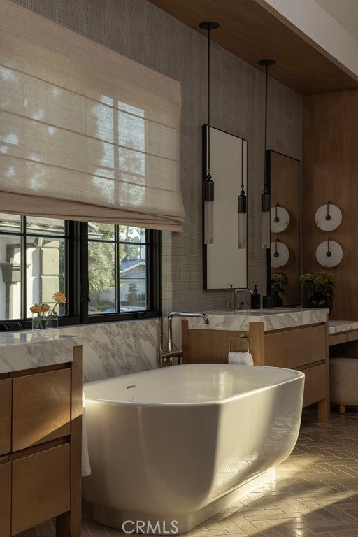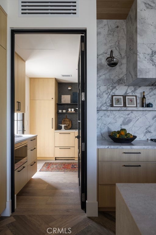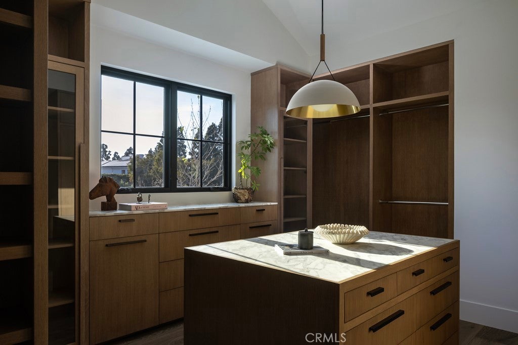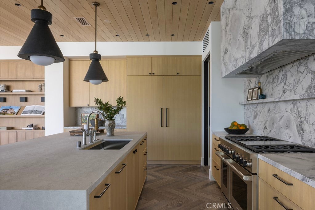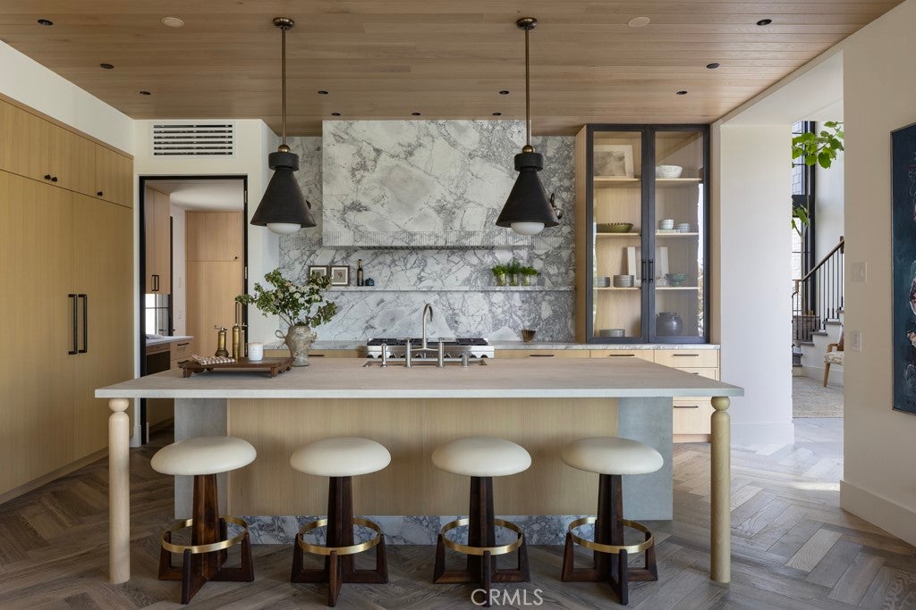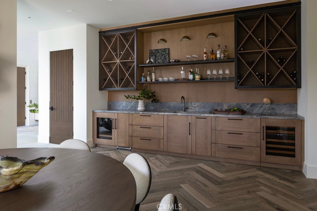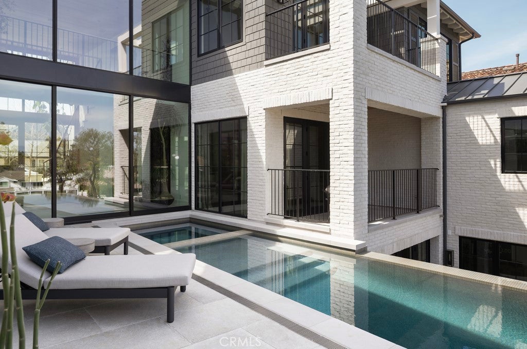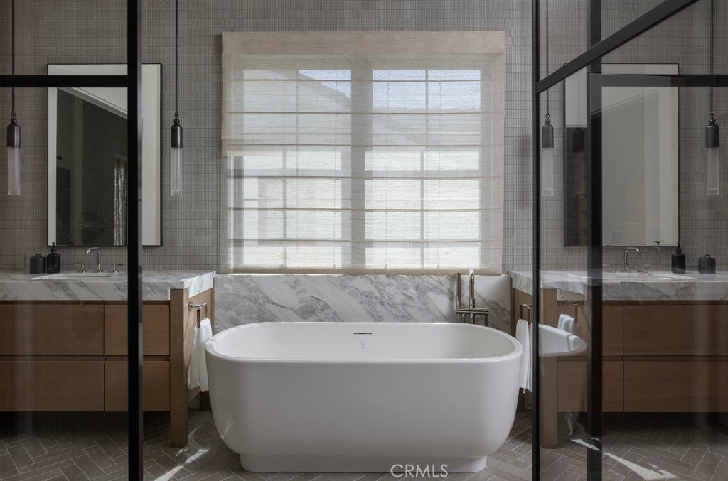 Set within the guard-gated enclave of Big Canyon in Newport Beach, this newly completed residence by JFB Custom Homes, designed by Aust Architects with interiors by Morrison Interiors, reflects a quiet sophistication where natural materials, refined craftsmanship, and thoughtful proportions create a home of enduring serenity. A dramatic double-height entry with approximately 20-foot ceilings introduces the home, where bespoke lighting, rich herringbone wood flooring, and beautifully crafted custom cabinetry establish a quiet sense of luxury. From the foyer, a dramatic sightline extends through the home, across the infinity-edge pool to sweeping vistas of Big Canyon Country Club and the mountains beyond. Interiors are shaped by a palette of warm oak, honed stone, and soft natural textures, creating an atmosphere of effortless harmony throughout. Light filters through carefully framed openings, illuminating spaces that feel generous yet intimately scaled. At the heart of the home, the kitchen serves as both gathering space and sculptural focal point. An elegant stone island anchors the room beneath custom pendant lighting, while warm wood cabinetry and dramatic veined stone create a layered interplay of texture and tone. A fully appointed butler’s pantry with its own suite of appliances provides seamless support for both everyday living and entertaining. The great room opens fully through expansive pocketing walls of glass, dissolving the boundary between indoors and out and embracing the essence of Southern California living. Beyond, a dramatic infinity-edge pool and spa overlook panoramic views of Big Canyon Country Club, accompanied by a firepit terrace and heated outdoor loggia designed for elegant alfresco dining and year-round entertaining. The home includes 5 bedroom suites, a private office, gym, multiple bonus spaces, and 7.5 bathrooms, all connected by an elevator for effortless access between levels. The primary suite serves as a private retreat with vaulted ceilings, fireplace, and a serene balcony overlooking the fairways. Its spa-inspired bath features a Kallista soaking tub, Apparatus lighting, and exquisitely designed custom dual wardrobes. Positioned within the guard-gated enclave of Big Canyon, the residence represents a rare convergence of architecture, craftsmanship, and setting—an elevated coastal sanctuary designed for both grand entertaining and quiet everyday living.
