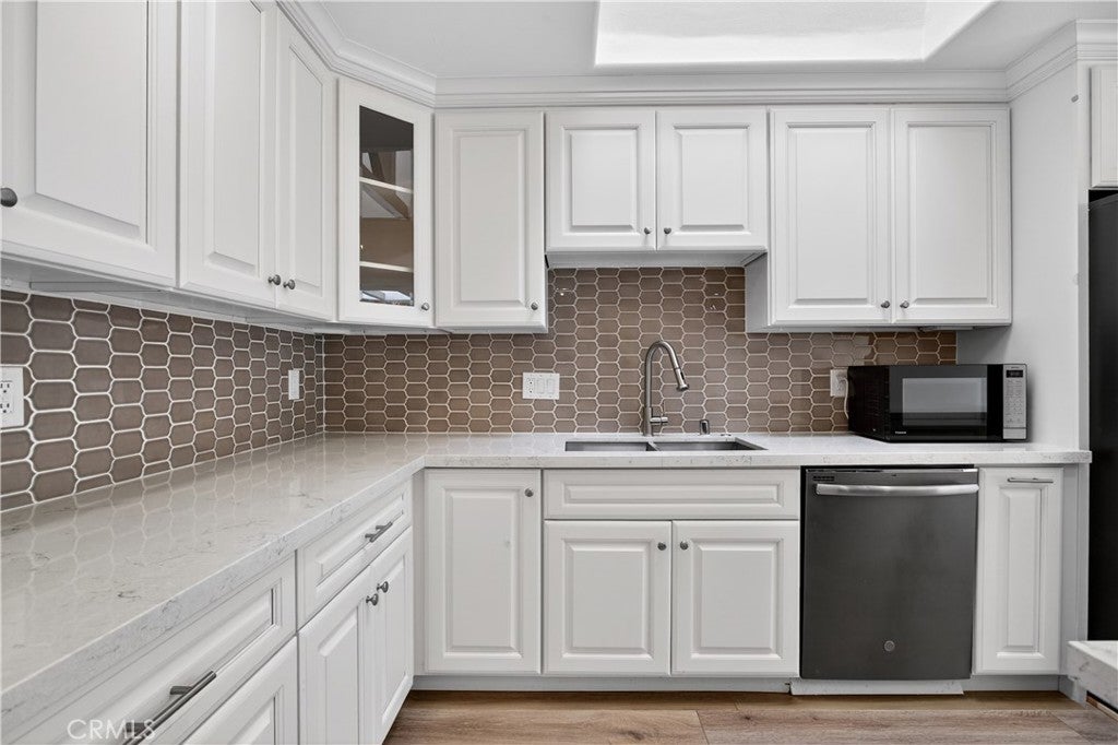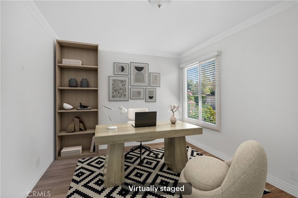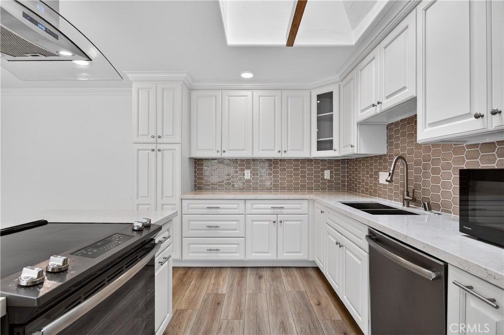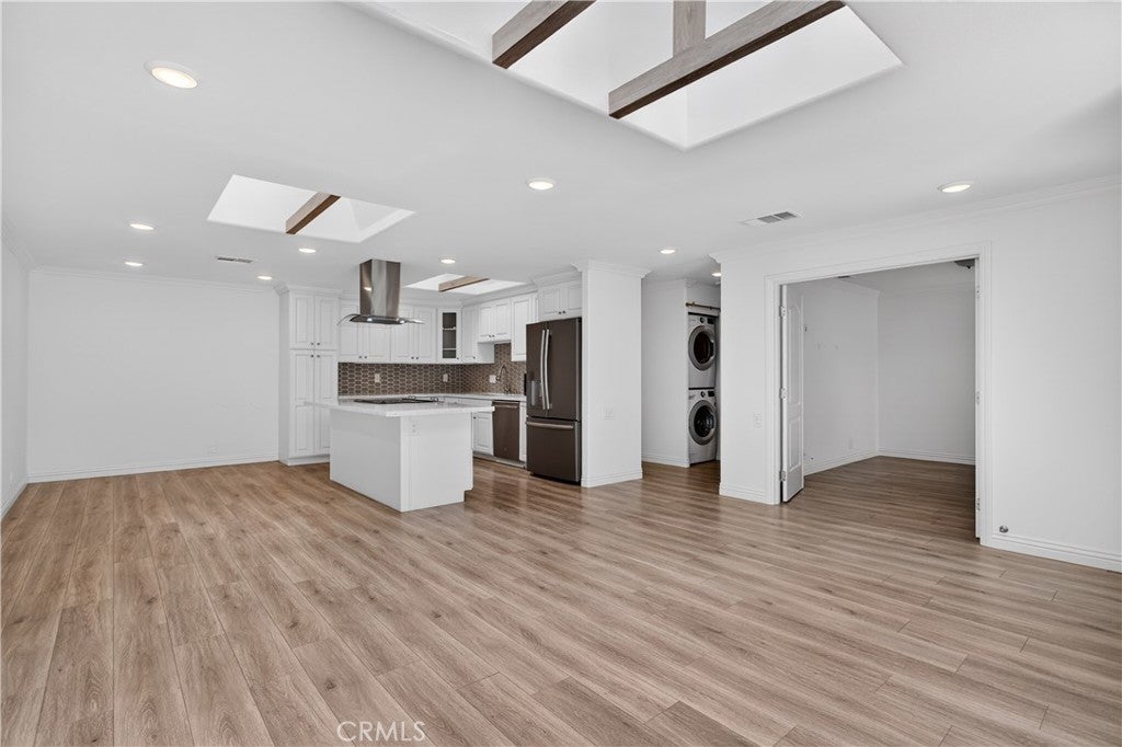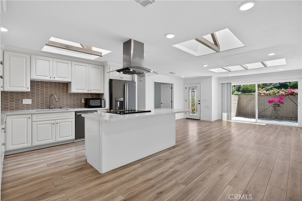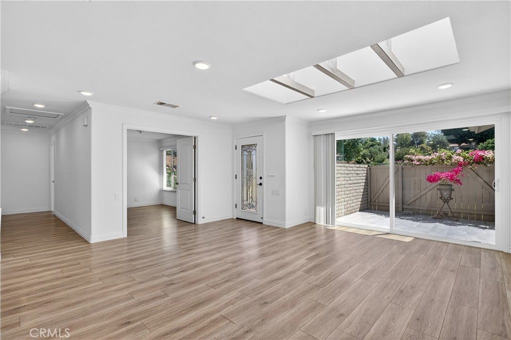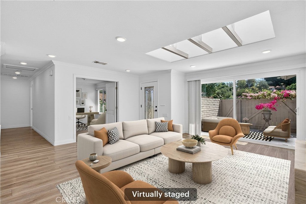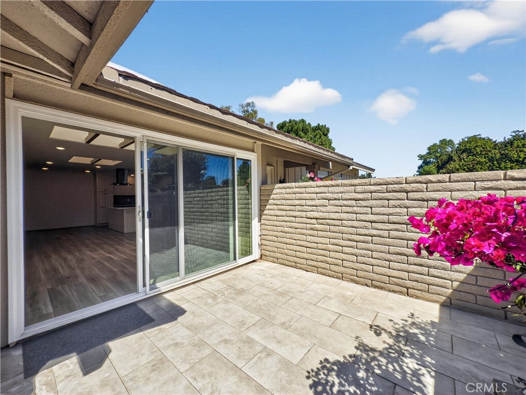 Set in a quiet, private location, this thoughtfully updated Hermosa model offers a rare combination of comfort, natural light, and effortless single-level living. With no stairs and no neighbors above or below, the home provides both ease and privacy in a serene, park-like setting surrounded by mature trees, rose garden and greenbelt views. Its desirable south-eastern exposure fills the home with soft morning light, creating a bright and uplifting atmosphere throughout the day. The interior features approximately 1,181 square feet, offering 3 bedrooms and 2 bathrooms with a flexible layout designed to suit a variety of needs. A charming set of French doors opens to the third bedroom, creating an ideal space for a guest room, home office, or den. Three skylights further enhance the home, bringing in abundant natural light and highlighting the open, connected living spaces. The kitchen has been tastefully upgraded with a quartz surface,, custom cabinetry, stainless steel appliances, and ample storage, including a pantry. Adjacent living and dining areas flow seamlessly to a private patio—an inviting setting to relax in the fresh coastal air. This home is truly move-in ready, complete with a refrigerator, washer and dryer included for added convenience. Throughout the home, you’ll find quality finishes including plank flooring, crown molding, recessed lighting, dual-pane windows, ceiling fans, and central heating and air conditioning. Both bathrooms have been remodeled with stylish tile work and updated fixtures. Located within the gated 55+ community of Laguna Woods Village, residents enjoy access to an exceptional array of amenities, including two golf courses, multiple clubhouses, 5 swimming pools, 2 fitness centers, gardening center, tennis and pickleball courts, an equestrian center, performing arts theater, and over 250 clubs.. A nearby covered carport with additional guest parking adds to the home’s everyday ease. Nearby beaches, shopping, dining, and medical facilities are just a short drive away.This is a standout opportunity for those seeking a move-in ready home with privacy, upgrades, and a vibrant community life.