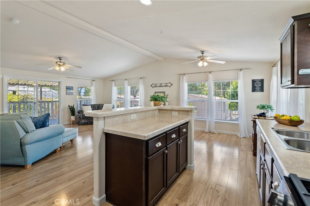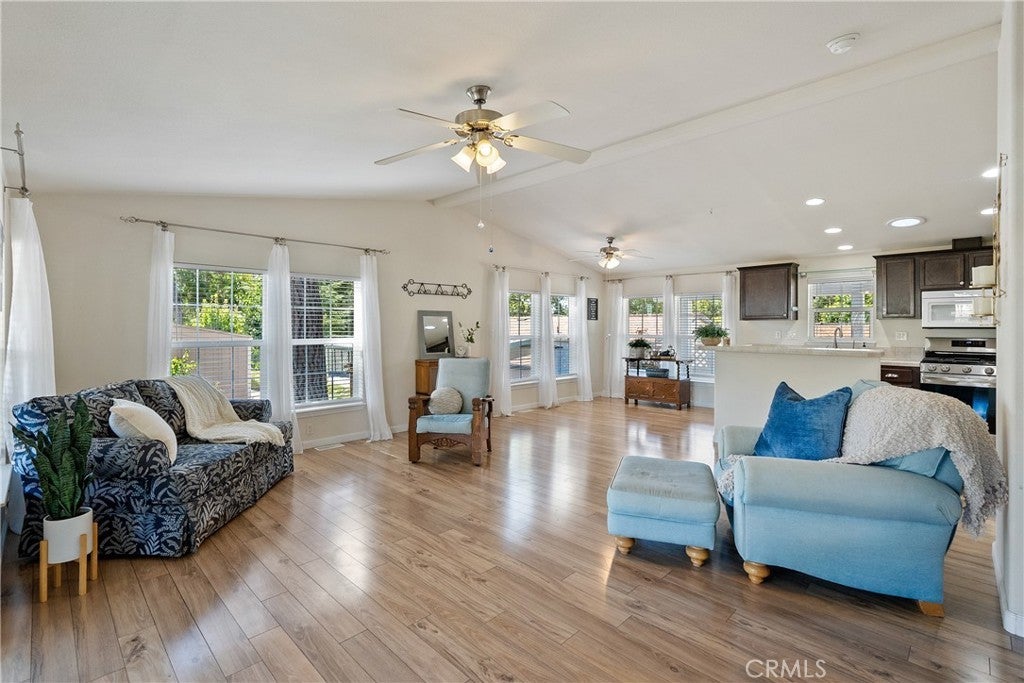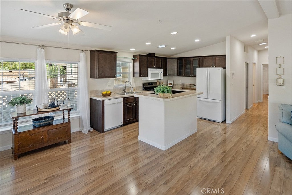Welcome to this beautifully maintained 2-bedroom, 2-bath home with an office, offering comfort, style, and convenience in the desirable Rancho Paso 55+ community. Step inside to find abundant natural light streaming through windows and skytubes, highlighting the stunning white oak floors that flow throughout. The upgraded kitchen features rich coffee-colored cabinets, blending functionality with warmth. Enjoy the outdoors on the spacious deck nestled beneath a mature oak tree, or relax in the fenced yard enhanced by elegant gray cobblestone pavers and thoughtfully placed landscaping. A covered two-car carport adds everyday convenience. Rancho Paso offers a welcoming lifestyle with community amenities including a swimming pool and clubhouse. Move-in ready, this home combines modern upgrades with serene surroundings—perfect for those seeking comfort and community.