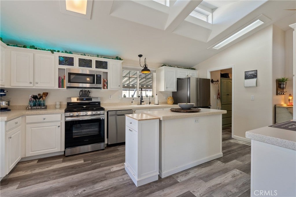 Located in Laguna Lake Mobile Estates, an all-age community with a pool, hot tub, library, two community rooms including one with a full kitchen, and a gym. This updated three bedroom, two bath home offers approximately 1,575 square feet of bright, open living space. The kitchen features an island and space for a breakfast table, opening to a separate dining area. Cathedral ceilings, high windows, and skylights fill the home with natural light. Relax by the wood-burning fireplace or soak in the indulgent tub. Recent updates include laminate flooring, fresh paint, and stove. Additional highlights include a deep two car carport, custom storage shed, indoor laundry, and a welcoming front porch. Come take a look today.