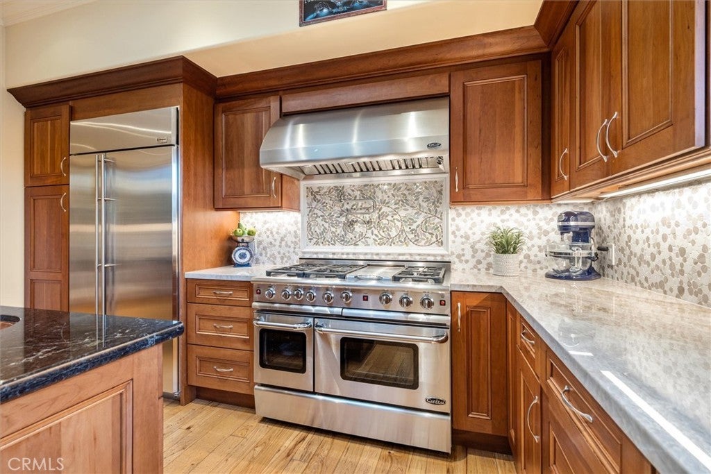 Welcome to 295 Mar Vista, a modern Craftsman offering four bedrooms and four full baths on an oversized corner lot with desirable northern and westerly exposure. Ocean breezes and layered privacy define the arrival, with custom paver walkways, concrete patios, sculpted garden walls, and an oversized stamped driveway leading to a three-car garage with wood-grain doors. Professionally designed grounds feature stone walls with integrated lighting and a fully water-efficient landscape with smart irrigation. Inside, soaring ceilings and abundant natural light highlight wide plank hickory wood flooring, skylights, crown molding, and custom Windsor windows with handcrafted casings. Hand-poured concrete fireplaces with embedded seaglass tile anchor the living spaces, while a central atrium with natural plantings and operable upper windows brings in ocean air. The kitchen is designed for daily living and entertaining, featuring quartzite countertops, custom cabinetry, skylights, an eight-burner Capital range with pot filler, built-in refrigerator, walk-in pantry with roll-outs, and an adjacent bar with glass cabinetry and beverage refrigerator. Nearby laundry includes generous cabinetry, multiple counters, and a built-in sink. The main level includes a private office and three bedrooms. The office is exceptionally light-filled, framed by French doors and windows that open directly outdoors, creating an ideal work-from-home or creative space. The primary suite offers a fireplace, French doors to a tropical outdoor setting, dual oversized custom closets, and a spa-inspired bath with travertine floors and a custom steam shower. Two additional main-level bedrooms feature French doors with private outdoor access, creating a seamless indoor-outdoor flow. Upstairs, a bonus space with wrap-around windows, skylights, barn wood ceiling, stone fireplace, and full bath provides flexible use as a guest suite, media room, or studio. Additional features include 44 owned solar panels, two Tesla wall batteries, Tesla EV charging, a whole-house LifeSource water filtration system, and a new 50-gallon high-efficiency water heater. Mature native and tropical landscaping, fruit trees, and multiple outdoor living areas complete this thoughtfully designed home.
