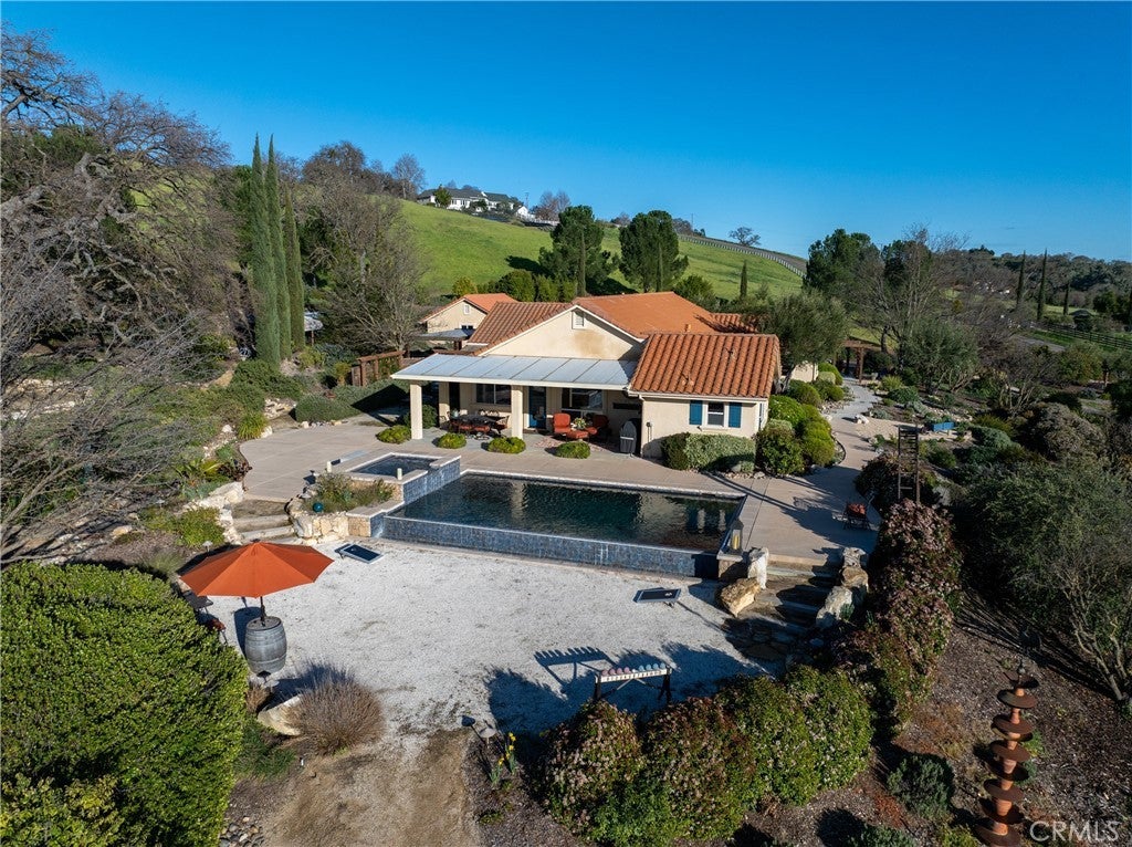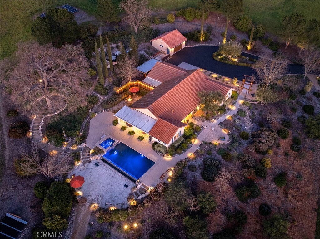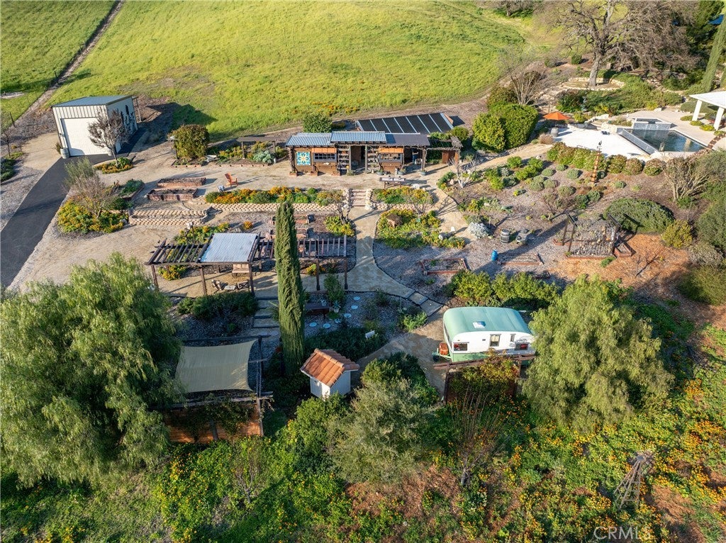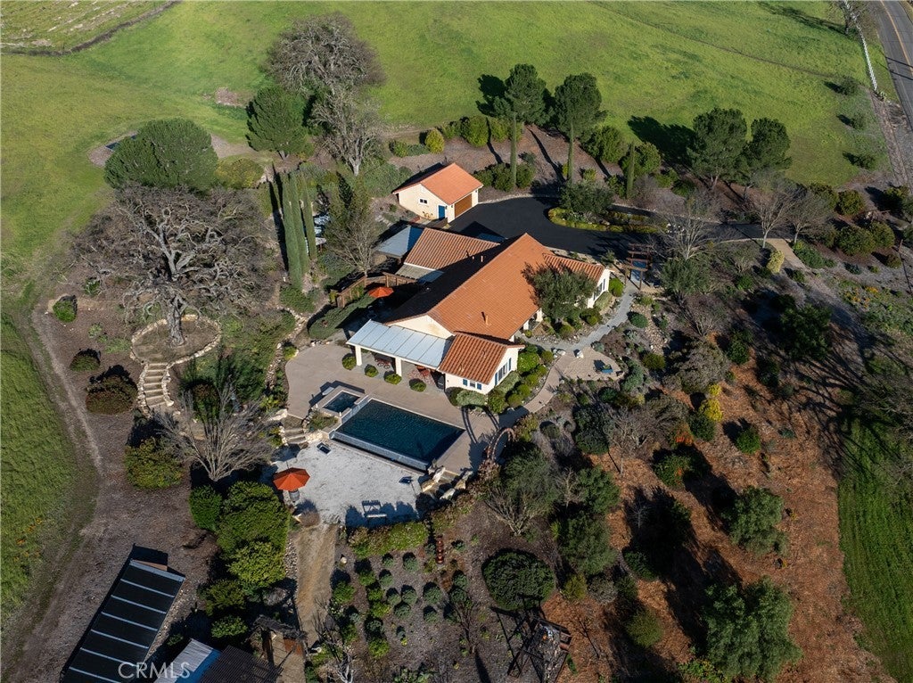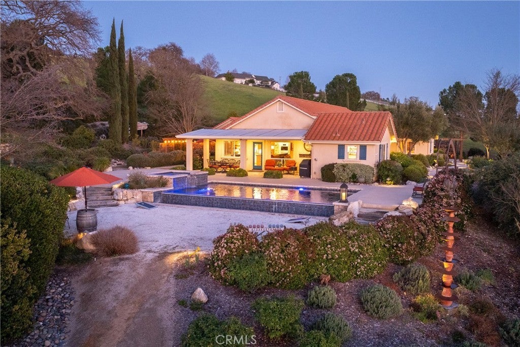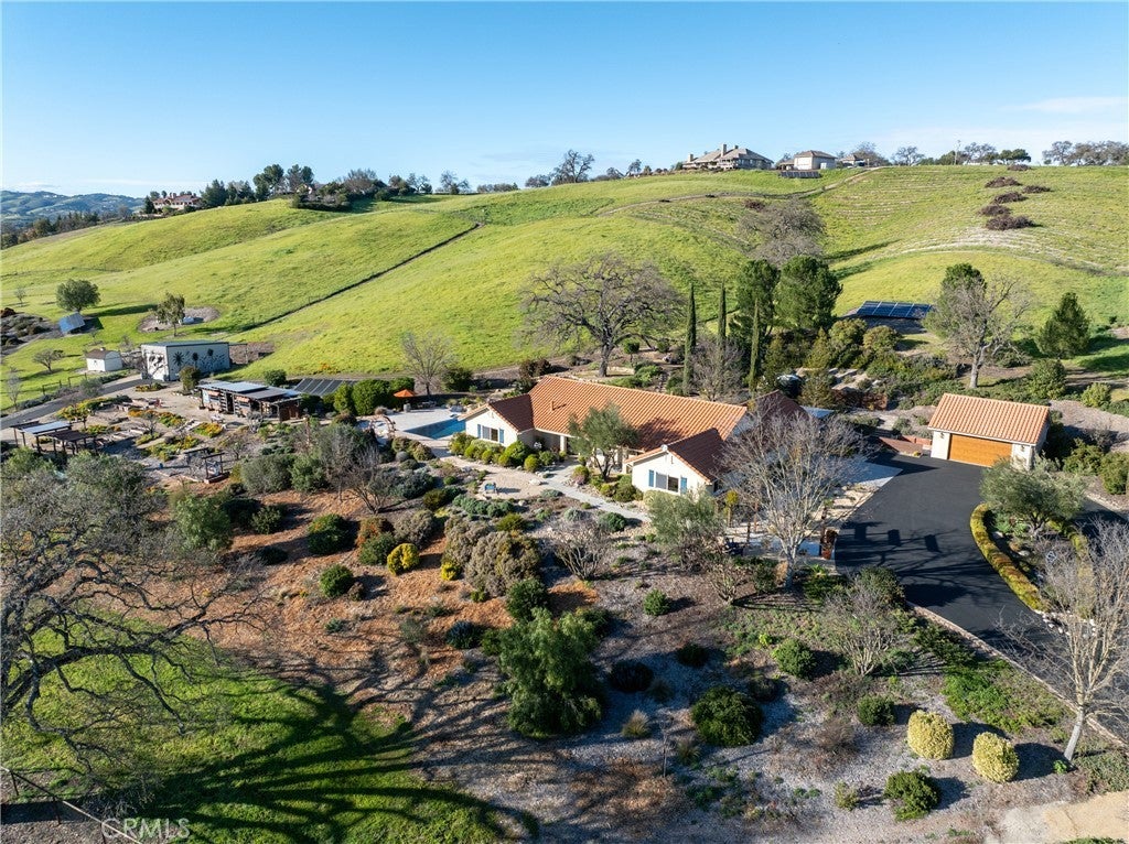 Welcome to Casa de Robles in the highly desirable Spanish Camp area of Paso Robles, an extraordinary private retreat set on seven gently rolling, fully deer-fenced acres behind an electronic gate with a circular driveway. This beautifully remodeled estate, which is just minutes to charming downtown, blends modern efficiency with refined luxury and offers unforgettable sweeping views. Entering this single-level home you will love the vaulted exposed wood ceilings, tile floors, a custom barn door which artfully hides the included TV, and a custom Mendota fireplace with real Adelaida stone. Notably there are no stairs or steps into or out of the home. A fully owned solar system, newer HVAC, high production well, and cleared septic and pest inspections offer true peace of mind. The stunning chef kitchen features live-edge stone countertops, double oven, open shelving, a walk-in pantry, dedicated coffee station, and an impressive 132-bottle Sub-Zero wine refrigerator, creating the perfect space for entertaining. The spacious primary suite is a serene escape with a spa-inspired bath and expansive walk-in closet, while a whole-house Hague water filtration system enhances everyday living. Each bedroom has a dedicated bathroom. Outdoors, the infinity-edge PebbleTec pool with spa spillover takes center stage, complete with electronic child safety barrier and both gas and passive solar heating options and situated perfectly to take in the stunning view and is just steps away from the covered patio with electronic awning and fans. Ideal for hobbyists or collectors, the property which has covered parking for 5 vehicles plus RV, includes a 2½-car attached garage with polyaspartic flooring and custom storage, a detached two-car shop with heat and air and a dust collection system, and a substantial steel RV building with its own private access road and gated entry. Garden enthusiasts will appreciate ten raised beds, pergola, fire bowl, low-v landscape lighting, bocce ball area, a massive garden shed with sink and work stations, and the thoughtfully designed landscaping with auto-drip along with majestic oak trees, while charming touches like a vintage 1960 Shasta trailer playhouse and landscape art adds character and warmth to this truly one-of-a-kind Paso Robles estate. No HOA.