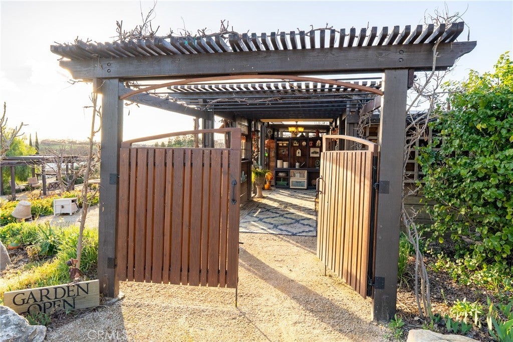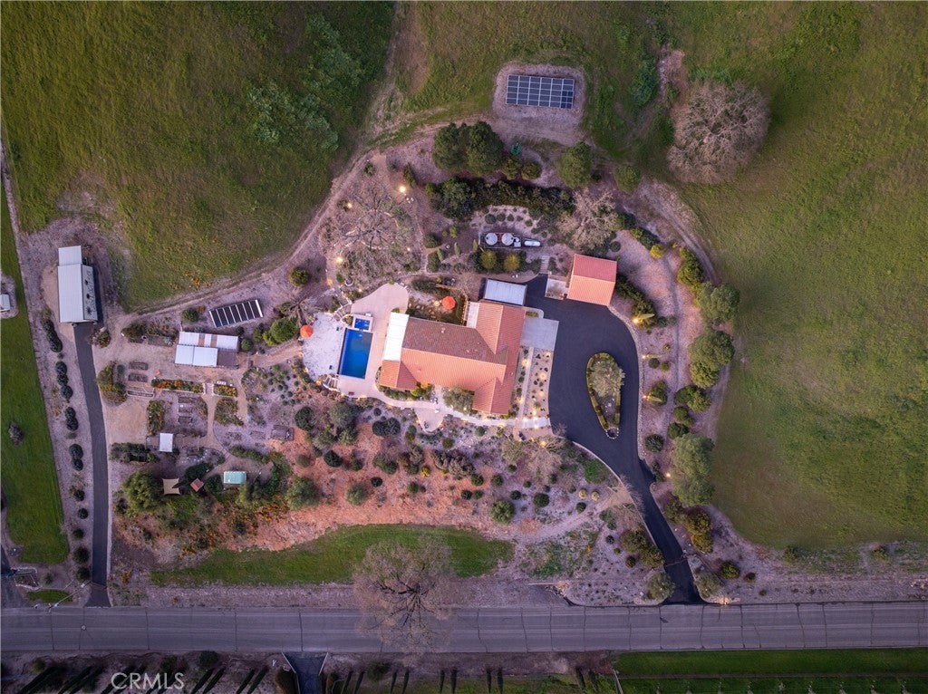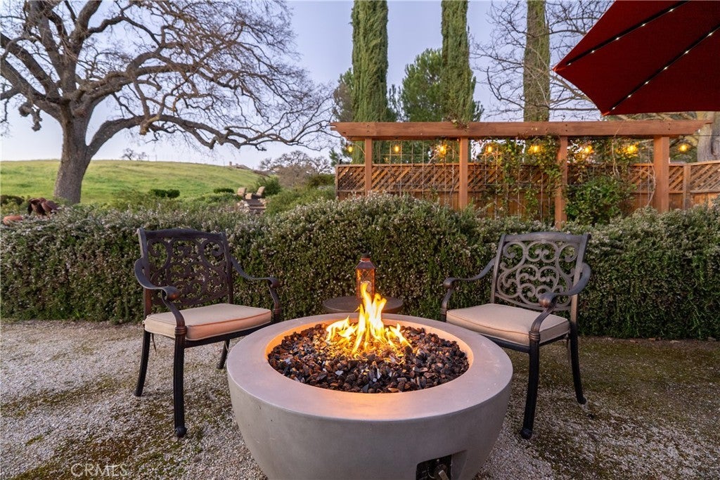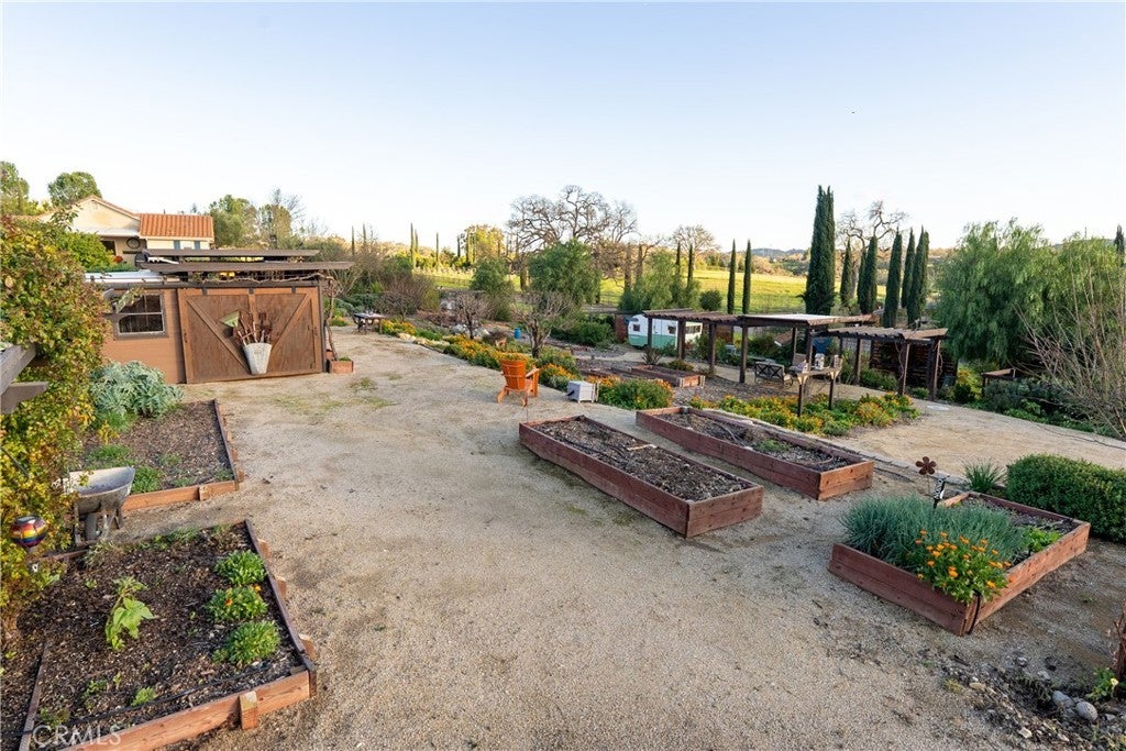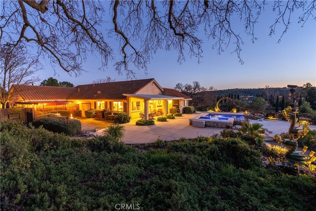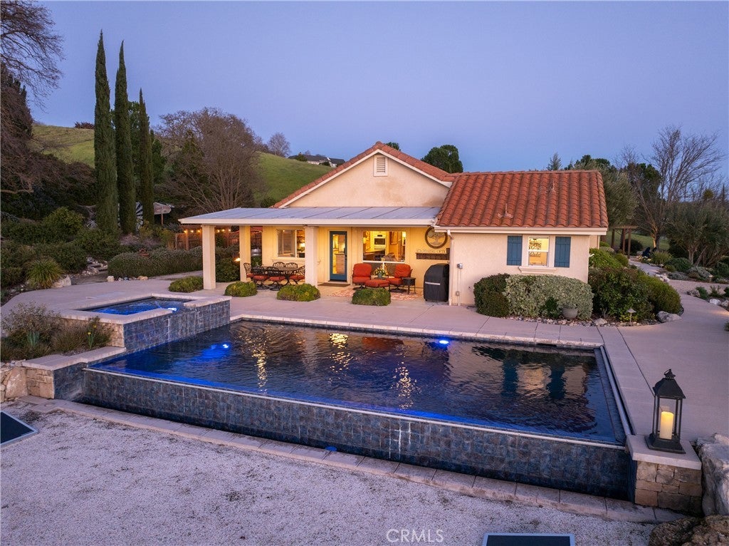 Welcome to Casa de Robles in the highly desirable Spanish Camp area of Paso Robles, an extraordinary private retreat set on seven gently rolling, fully deer-fenced acres behind an electronic gate with a circular driveway. This beautifully remodeled estate, which is just minutes to charming downtown, blends modern efficiency with refined luxury and offers unforgettable sweeping views. Entering this single-level home you will love the vaulted exposed wood ceilings, tile floors, a custom barn door which artfully hides the included TV, and a custom Mendota fireplace with real Adelaida stone. Notably there are no stairs or steps into or out of the home. A fully owned solar system, newer HVAC, high production well, and cleared septic and pest inspections offer true peace of mind. The stunning chef kitchen features live-edge stone countertops, double oven, open shelving, a walk-in pantry, dedicated coffee station, and an impressive 132-bottle Sub-Zero wine refrigerator, creating the perfect space for entertaining. The spacious primary suite is a serene escape with a spa-inspired bath and expansive walk-in closet, while a whole-house Hague water filtration system enhances everyday living. Each bedroom has a dedicated bathroom. Outdoors, the infinity-edge PebbleTec pool with spa spillover takes center stage, complete with electronic child safety barrier and both gas and passive solar heating options and situated perfectly to take in the stunning view and is just steps away from the covered patio with electronic awning and fans. Ideal for hobbyists or collectors, the property which has covered parking for 5 vehicles plus RV, includes a 2½-car attached garage with polyaspartic flooring and custom storage, a detached two-car shop with heat and air and a dust collection system, and a substantial steel RV building with its own private access road and gated entry. Garden enthusiasts will appreciate ten raised beds, pergola, fire bowl, low-v landscape lighting, bocce ball area, a massive garden shed with sink and work stations, and the thoughtfully designed landscaping with auto-drip along with majestic oak trees, while charming touches like a vintage 1960 Shasta trailer playhouse and landscape art adds character and warmth to this truly one-of-a-kind Paso Robles estate. No HOA.
