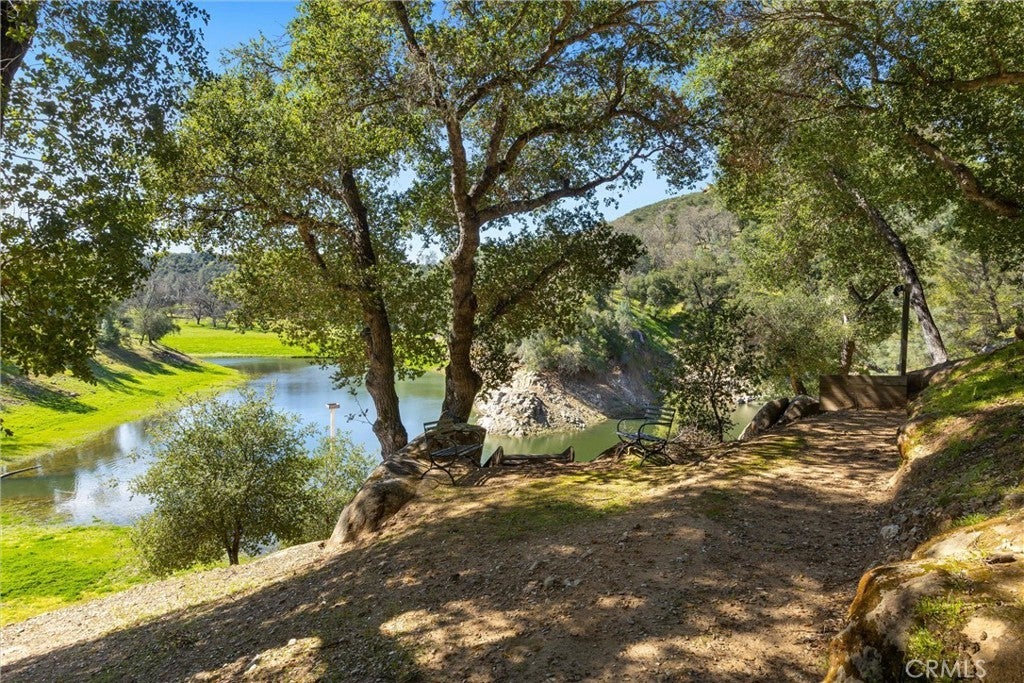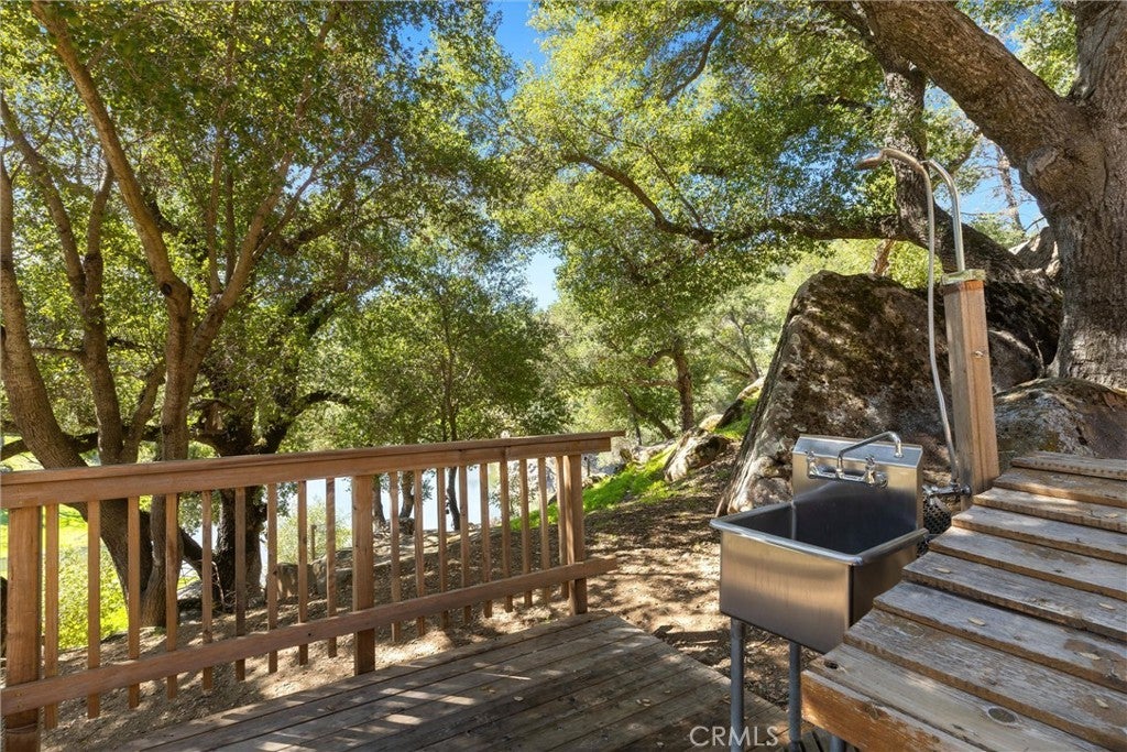 Experience the privacy, character, and natural beauty of this furnished retreat fronting the Towne Creek branch of Lake Nacimiento. The 1 bedroom, 1 bath home features an open floor plan with a warm, lodge-like interior. Vaulted ceilings, stone-tile flooring, a spacious loft and a classic rock fireplace complete the classic rustic feeling. A spiral staircase leads to the loft overlooking the living room with room for several, while the bonus room tucked beneath the main floor and accessed via the lower deck provides additional options for sleeping, yoga or hobbies Surrounded by beautiful oak trees and dramatic rock outcroppings along the hillside, the property offers a peaceful nature-rich setting as emphasized by the trees growing through the decks and shading the home. A detached bunkhouse with its own bath sits on the lower driveway level, conveniently adjacent to the parking area with its accommodations for RVs. After entering the gated property (driveway is shared), you pass the steel garage building with room for boats, vehicles & additional recreational gear. With its creek-front location, rustic charm and a variety of spaces for enjoying the outdoors this privately sited property is a unique opportunity within the gated Running Deer Ranch community. And, best of all, a purchaser can obtain membership in the Dragon Dock LLC with slip #2 for your exclusive use! This is perso0nal property of one of the owners and will be handled separately and outside of escrow.