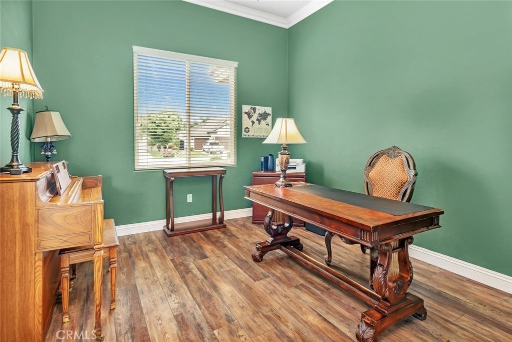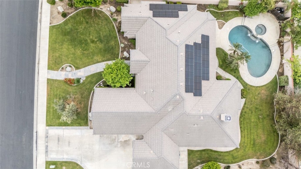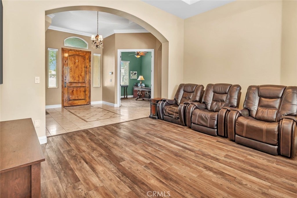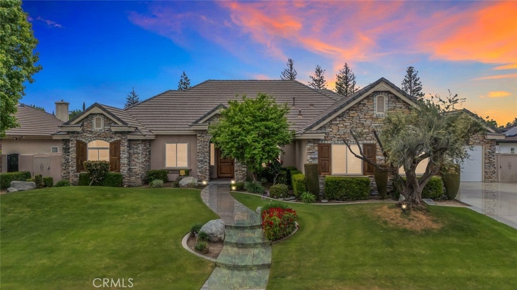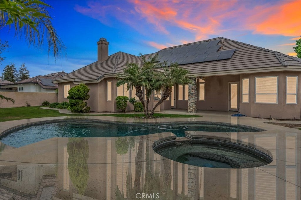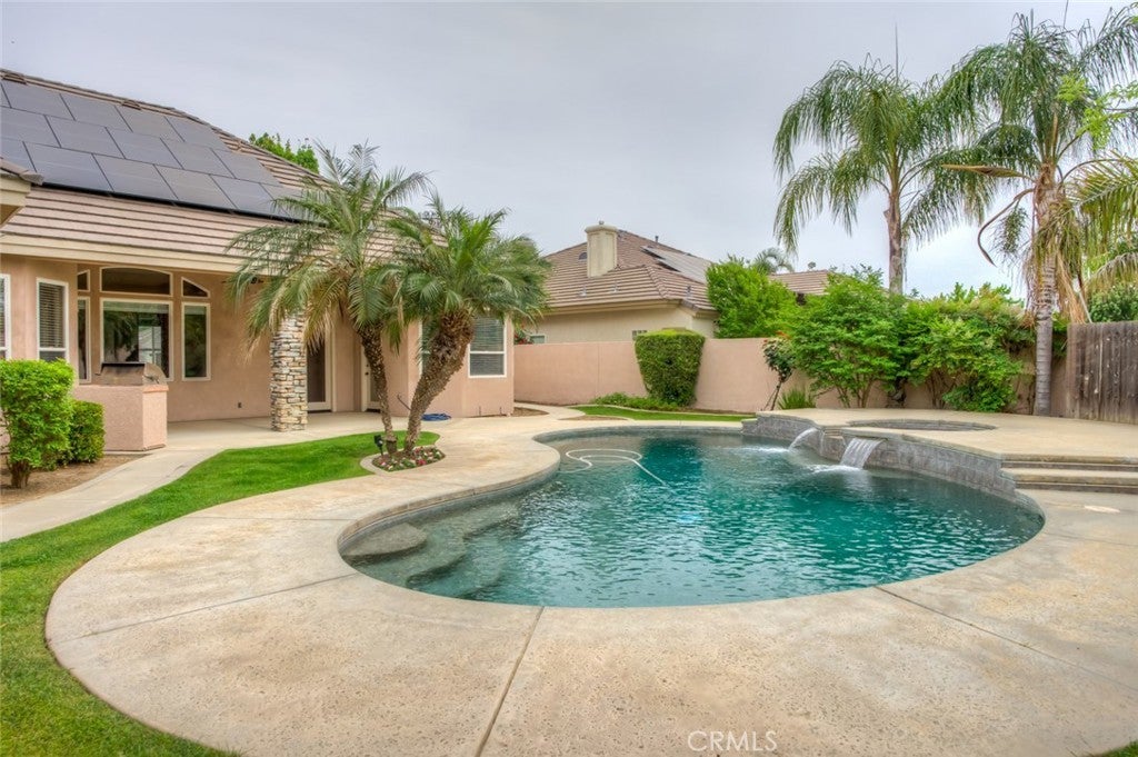 Warm and luxurious gated Seven Oaks Regency home featuring a split-wing, 5-bedroom plan, 2.5-bath layout and 3-car garage. Enjoy a formal living room with pool views, formal dining, and an open-concept great room with fireplace and built-ins perfect for relaxing or entertaining. The kitchen offers granite countertops, island, pantry, and abundant custom cabinetry. Elegant touches include crown molding, tray ceilings, recessed lighting, and ample natural light. The 5th bedroom is used as an office (no closet). The spacious primary suite includes a sitting area and spa-like bath with dual sinks, jetted tub, and separate shower. Three additional bedrooms are on the opposite wing. The backyard features a covered patio, built-in BBQ, mature landscaping, and a sparkling pool and spa.