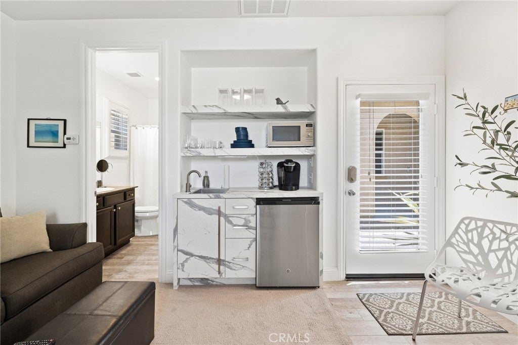 It feels like vacation with every amenity of home, step into the gorgeous backyard with a sparkling salt water pool and covered outdoor dining and entertaining space. Enjoy grilling by the pool and on those cooler desert nights the outdoor covered space includes mounted gas heaters or on the hot days a misting system, ready for those warm or cool desert nights. Well located in central Palm Desert only a few minutes of the 10 surrounded by world class golf courses and nearby shopping and dining at El Paseo. The garage includes an EV charging station for your electric vehicle. An open floorplan with custom designed chef's kitchen with plenty modern amenities. Walk-in pantry with wine rack wall, quartz countertops and full height backsplash. Custom built-in walnut and bronze glass dining table. Custom white oak modern built-in entertainment wall with wrap-around millwork with integrated primary bedroom interior door. Surround sound Sonos speakers in ceiling throughout main living area as well as out in the backyard. Porcelain wood grain flooring, new baseboards, new door casing, entire home recently painted. The casita includes a kitchenette and separate entrance with its own AC. Main home also has own AC unit as well as a newer mini split system in the garage, washer and dryer in home. The pool heat is on-demand, meaning we do not heat it when it's not in use or when no guests are staying. It heats up about 3 degrees per hour, and it can get down into the 60s during the winter, so if you want it heated upon your arrival, please keep that in mind and notify us. For long-term stays, $500 of gas and electricity is included, and the renter pays for utilities above $500/month. For short-term stays, the charge is $100/day if pool heating is paid upfront for every day of the stay or $125/day if not. Most resorts heat pools into the low 80's we allow guests that pay for pool heat to heat the pool to the mid-80s. Please keep in mind in mid-winter, larger pools will have a hard time even reaching the mid-80s, and pool temperature is not guaranteed. However, low to mid 80's is generally common, even mid-winter.
