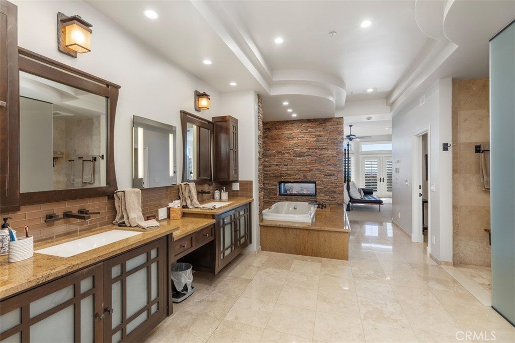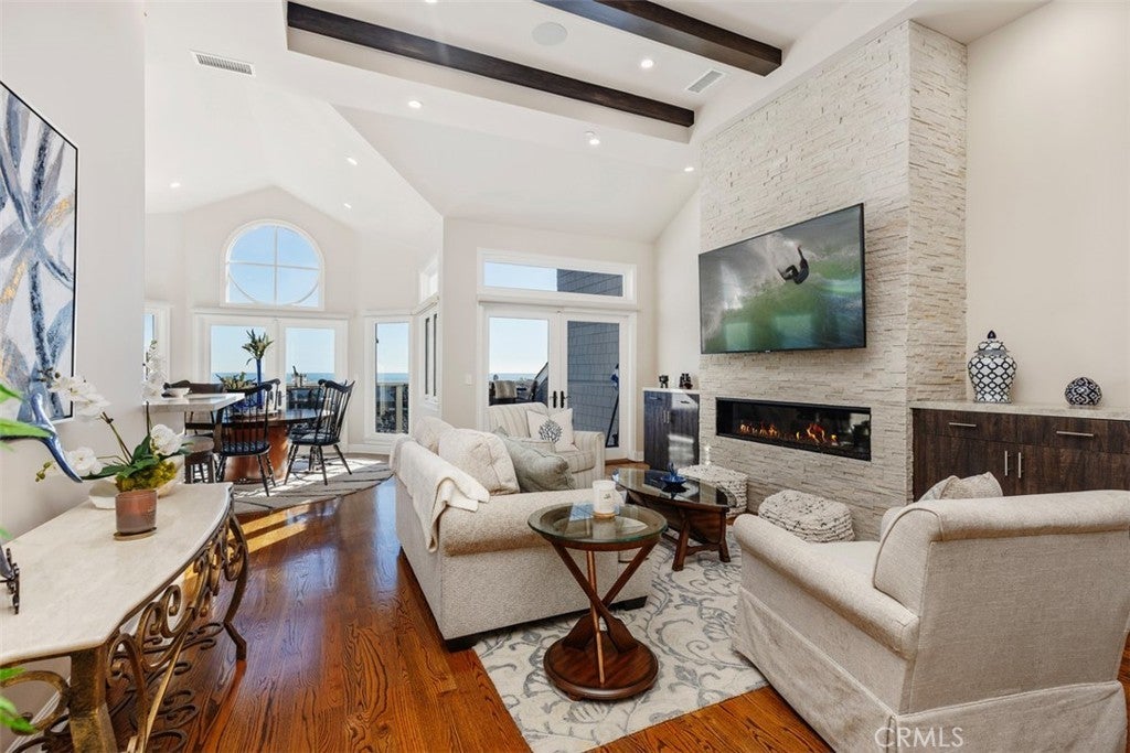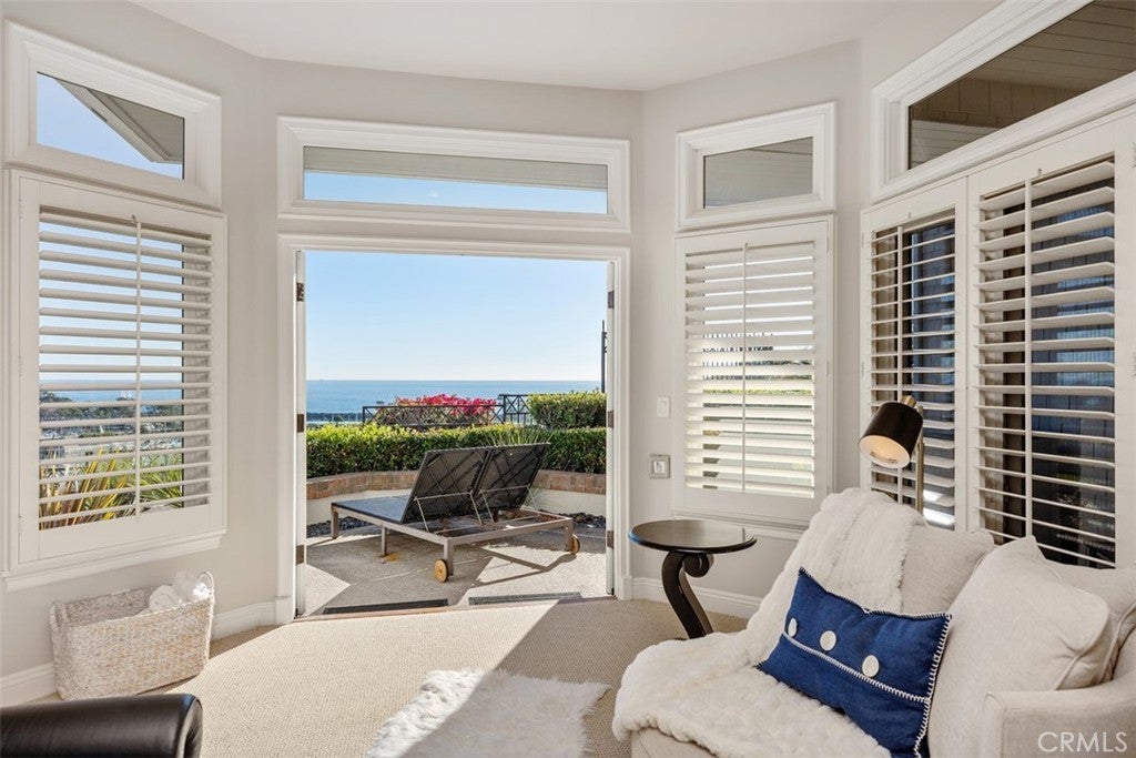 Available March 18th! Set high above Dana Point Harbor, this rare residence offers an unparalleled lifestyle in the exclusive Admiralty community. With breathtaking panoramic views of the ocean, harbor, and whitewater waves, this beautifully upgraded 2-bedroom, 3-bathroom home spans 2,765 square feet, with an optional third sleeping area or den. Upon entry through double doors, the main floor opens to a wall of windows and doors showcasing sweeping ocean vistas, framed by a striking stacked stone fireplace that reaches up to vaulted, beamed ceilings. The open layout connects the living area to a chef’s kitchen, equipped with top-tier appliances like a Thermador double oven and cooktop, plus Subzero fridge and freezer—ideal for culinary pursuits. An oceanfront terrace extends from the kitchen and living area, complete with a firepit for outdoor dining and taking in the cool coastal breeze. The main level also hosts a secondary suite with a walk-in closet and a luxurious bathroom featuring a dual-sink vanity and walk-in shower. Descending to the lower level, you'll find the primary suite, a private sanctuary with its own terrace and sweeping harbor views. This spacious retreat includes a dual-sided fireplace, perfect for enjoying from both the bed and the jacuzzi tub. The ensuite bathroom boasts dual vanities, an oversized shower with a dressing area, a jacuzzi tub, and a generous walk-in closet with a secure safe. A private sauna adds an extra layer of indulgence. The lower level also includes a flexible den area, ideal as a third bedroom for guests or additional lounging space. This property is only moments away from downtown Dana Point’s shops, dining, harbor, scenic coastal trails, and world-renowned beaches. Available for both short and long-term rental, this home epitomizes Southern California’s luxurious coastal lifestyle.