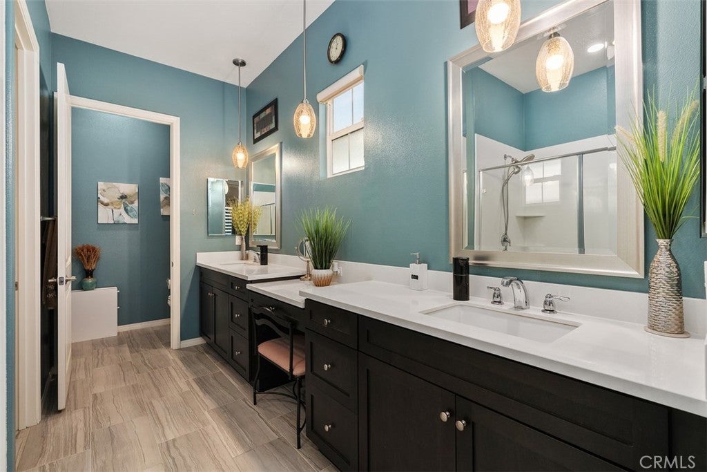 The sellers are offering you an incredible home below market value! This is the one you've been waiting for, a rare find, one of only 20 homes, thoughtfully designed with a private NEXT GEN SUITE for multigenerational living in the distinctive Modena collection within the exclusive gated Esperanza 55+ Senior Community. Lennar only built 20 of these exceptional homes, and this is the first one to become available on the resale market. This is the most extensive floor plan of 2135 square feet and features two separate living spaces under one roof, individual entrances, laundry rooms, great rooms, kitchens, and two primary suites. You'll find quality upgrades throughout, including remote-controlled silhouette window coverings and custom draperies, flooring, an extended covered patio, 18 solar panels, a water softener, and maintenance-free turf. Smart features include an app-controlled garage door opener, keypad, thermostat, and Ring security doorbell. The great room offers an easy lifestyle for entertaining with the open concept, allowing the chef to be a part of the activity in the adjacent dining and living space. No slamming doors here! The upgraded kitchen features soft-close cabinets & drawers, quartz countertops, an exceptional walk-in pantry, and top-of-the-line appliances. The main primary suite is a sanctuary with private access to the covered patio and a generously sized walk-in closet. The primary ensuite bath is luxuriously appointed with quartz countertops on the dual vanity and a large walk-in shower. When you get to the front door, you'll have a choice. Either enter the primary residence or the NEXT GEN SUITE's private entrance. This is 2 homes in one! The La Jolla Clubhouse is the 9000 sq ft Community Centerpiece loaded with amenities that include pickleball, a well-appointed fitness center, pool, bar-b-que area, and ample outdoor pet-friendly space. The home and community inspire a modern living space ideal for active adults with low-maintenance designs, style, and luxury. Don't miss this rare opportunity to live in this quiet, safe, 55+ community that friendly "seniors" call home!