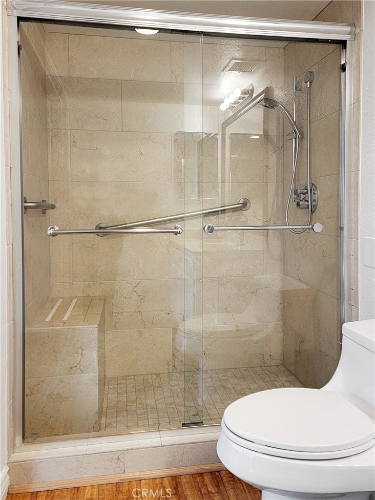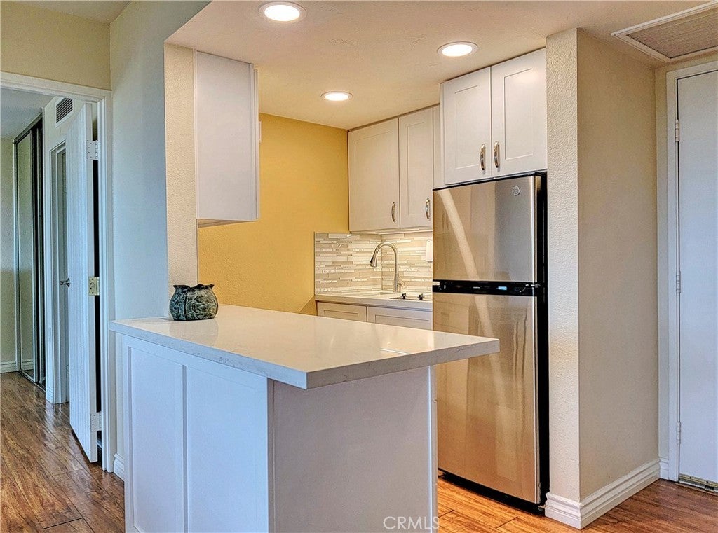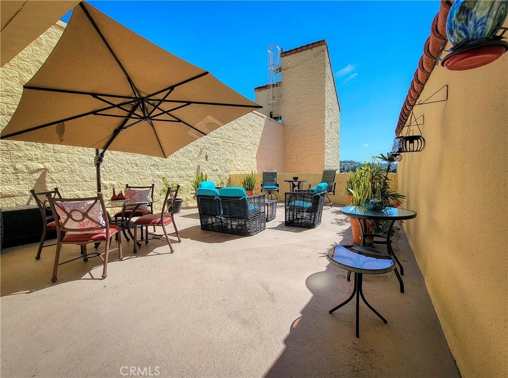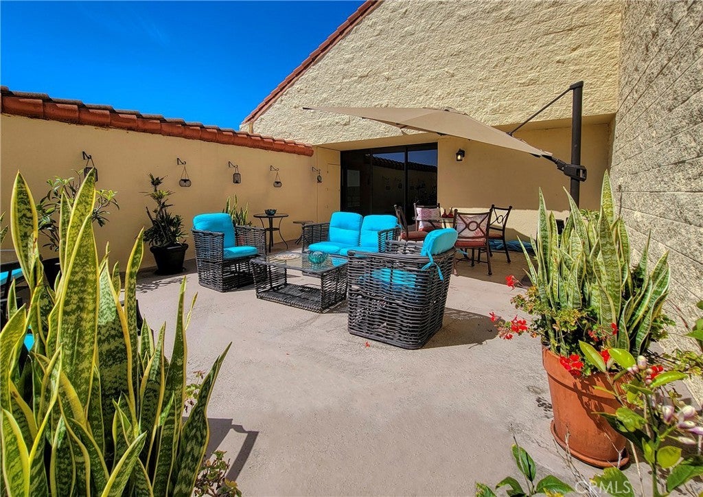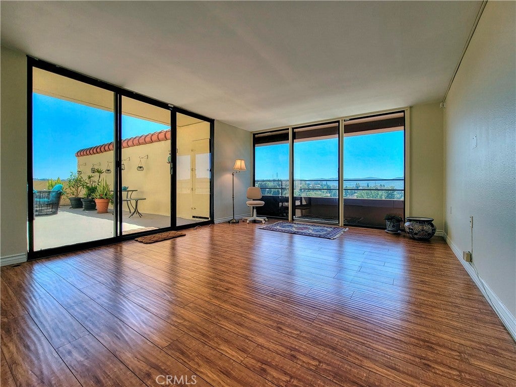 Rare top floor Condo on the 14th floor with a stunning view of the city and hills leading to Laguna Beach from your own large private patio and seller offers a $15,000 flooring and home improvement allowance to the buyer(s) upon close of escrow! This home has a darling remodeled kitchen with a two burner cooktop and built in microwave. Quartz countertops and a decorative tiled backsplash in neutral tones compliment the stainless steel refrigerator and white cabinets. The living room has large windows with a southwest view of the city. Laminate flooring is throughout the home and the home has two bedrooms with their own bathrooms. The master bath has been redesigned with safety and elegance in mind with a large step in shower surrounded in ceramic tilework and grab bars and double doors ad easy access. The master bedroom leads out to the expansive patio and could also be used as a study or art studio. The patio is such a surprise and rarely comes on the market. This one could host a large party and all the furniture, storage bin and umbrella are included in the price of the home. It s party ready and even has a storage closet. The Towers offers many amenities including a $500 a month dining credit, housekeeping every other week, electricity, water, trash and basic cable. Bingo is big here. There are card rooms, a library, movies, and exercise classes and social events and you also have access to all the amenities the city has to offer.