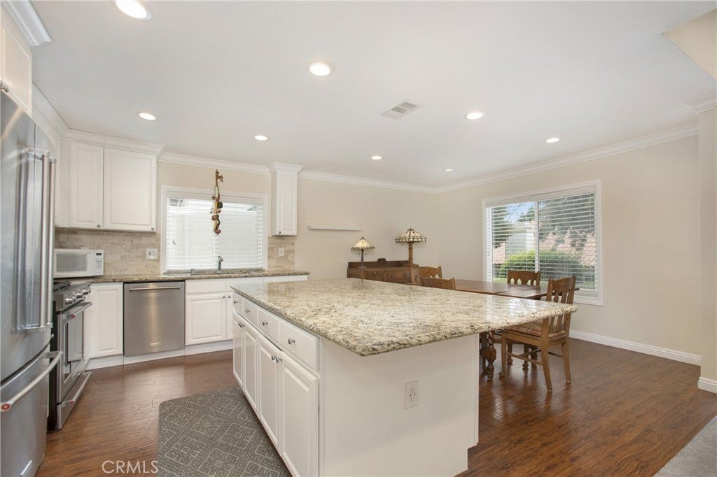 Well maintained, updated and ready to go, is a 1,492 sq ft gem in Mission Viejo! Located on a corner lot, these 2 bedrooms/2 baths home brings additional yard space and privacy adding to the already outstanding curb appeal. An open floor plan yields high visibility and excellent traffic flow between kitchen, dining, and family rooms. A stunning floor to ceiling fireplace along with French door access to the back patio contribute ambience, comfort, style, and convenience. The beautiful kitchen features sought-after white soft close cabinets, brushed nickel hardware, and granite countertops. Additionally, is a large island with good sized overhang for seating. Stainless steel appliances, backsplash, even a window over the sink also help make this an inviting and user-friendly space. Likewise, tastefully upgraded are the two baths with the primary ensuite providing dual sinks, lots of granite counter space, and a gorgeous completely tiled walk-in shower. Indoor and outdoor, this house doesn’t disappoint. Nature activities, shopping, restaurants, and attractions are nearby with Disneyland only 30 minutes away.