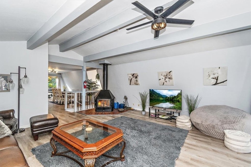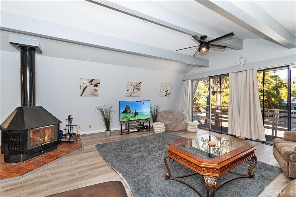 A rare opportunity—this is one of the only homes at this price point in Green Valley Lake with an attached two-car garage and private driveway. Embrace the tranquility of your charming mountain retreat, nestled in the heart of the peaceful and picturesque Green Valley Lake. This cozy 2 bedroom, 2 bathroom home boasts 1275 sq ft of living space perfect for a weekend getaway or full-time residence. The open concept floor plan is filled with natural light and features a spacious kitchen, a wood burning stove, and stunning views of the surrounding forest. Outside, you'll find multiple decks perfect for enjoying the fresh mountain air and entertaining guests. Located just minutes from hiking trails, fishing spots, and the picturesque lake, this home offers the ultimate escape from city life. Don't miss your chance to own this hidden gem in Green Valley Lake! Property currently has a short term lodging permit. And the Bonus, a basement that can be transformed into additional living space and or a massive primary bedroom.