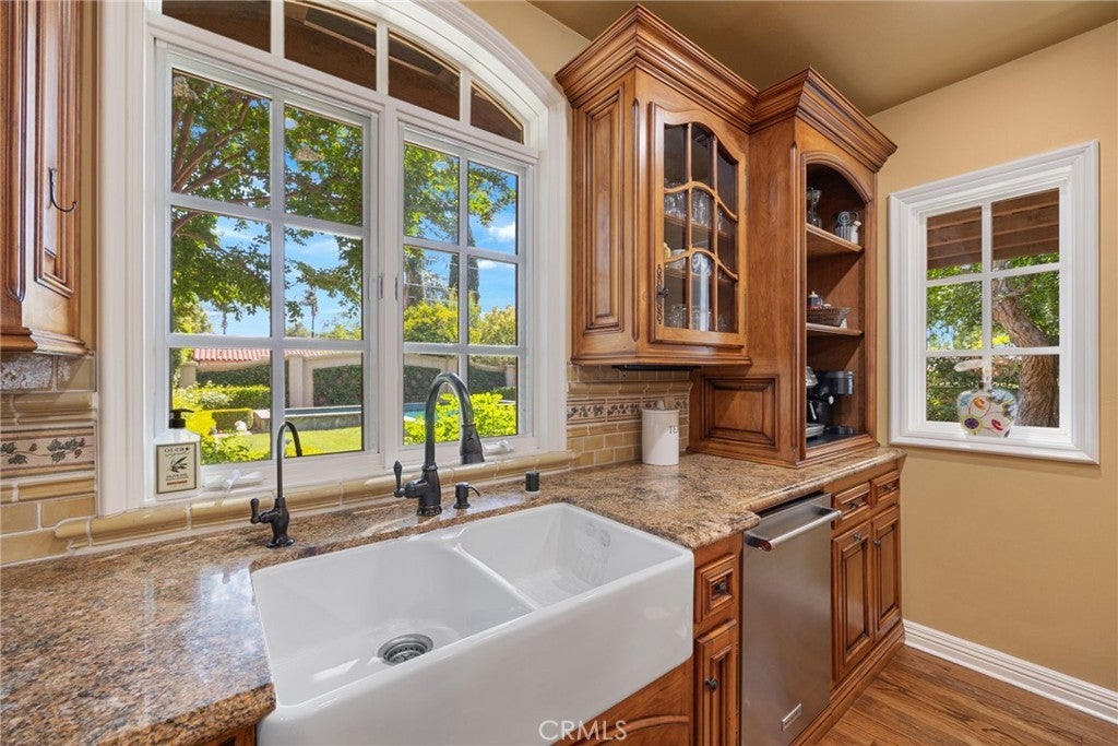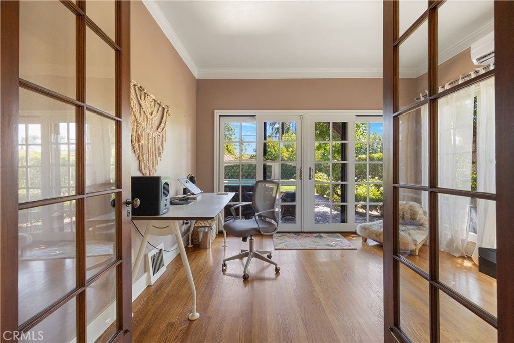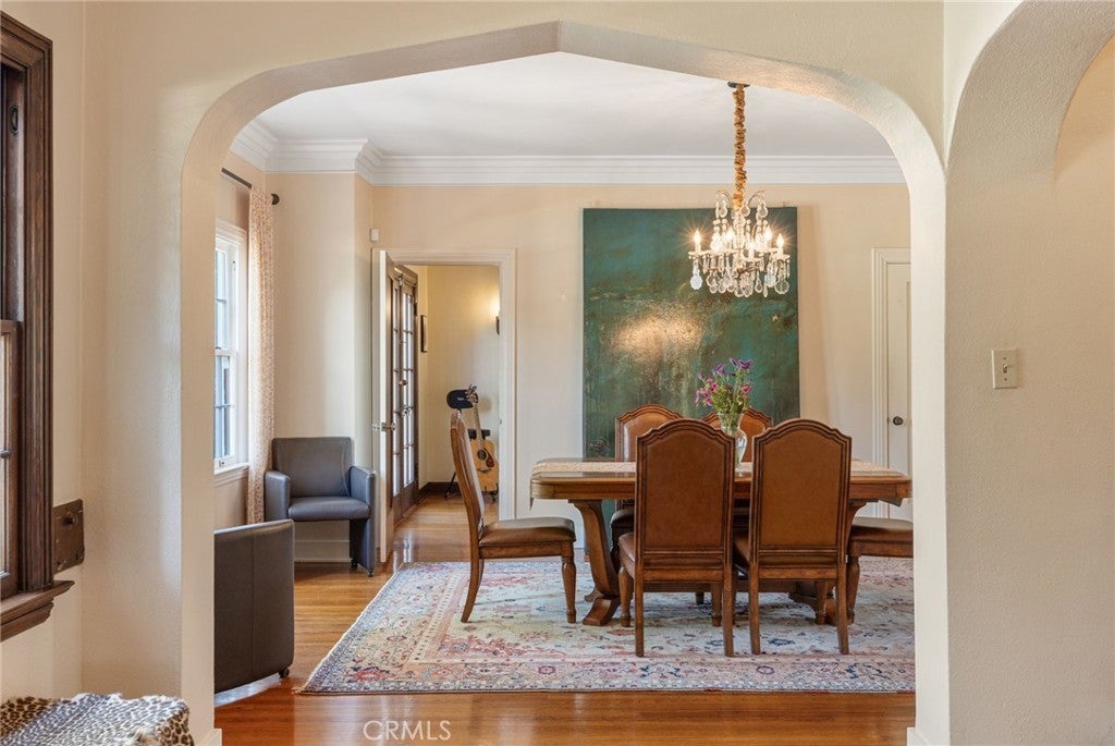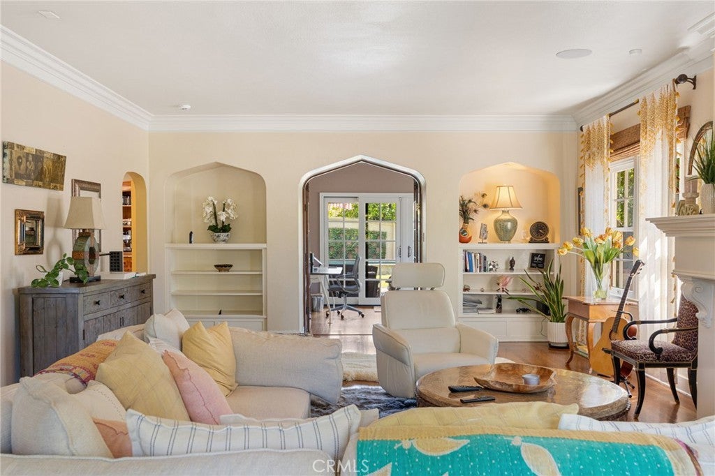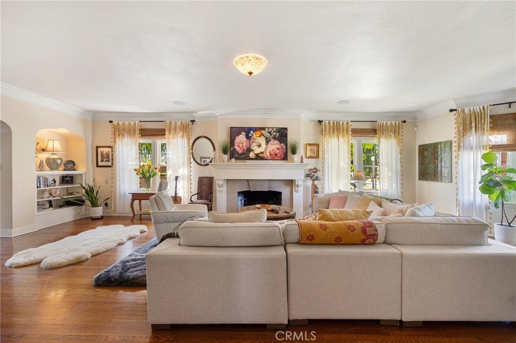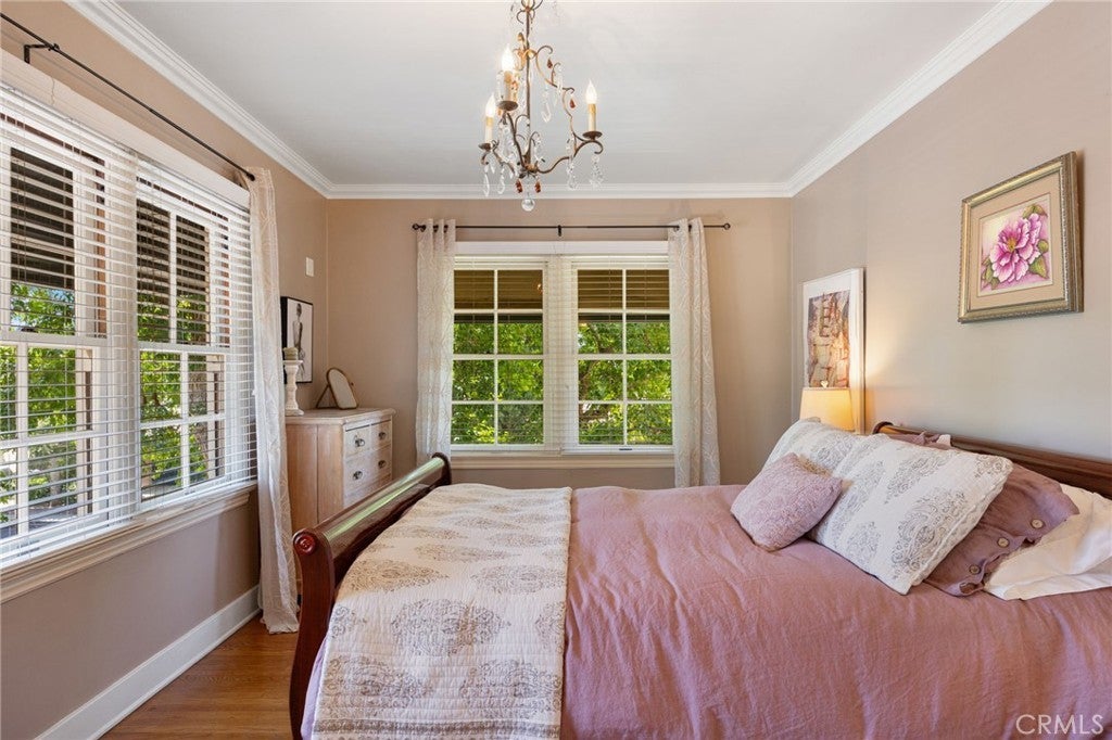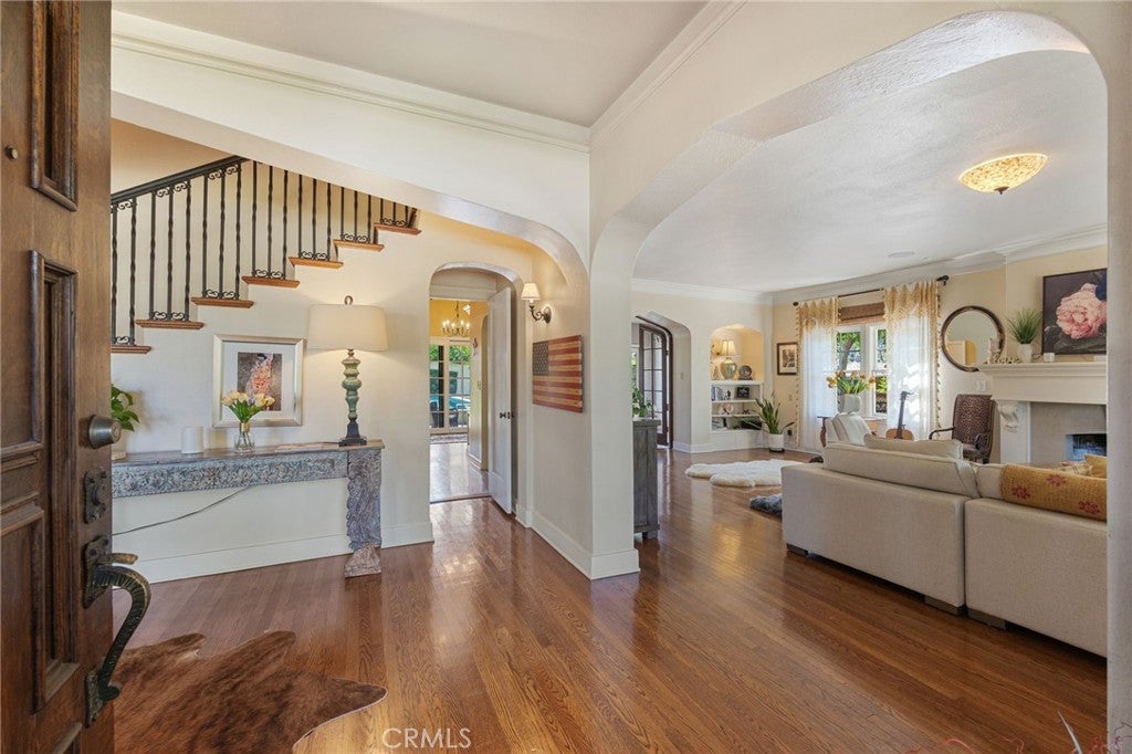 Step inside this magnificent 100 YEAR OLD gated Tudor Revival home located inside of Riverside's historic Wood Streets and experience a timeless blend of classic architecture and modern amenities. The BEAUTIFULLY LANDSCAPED exterior boasts quintessential elements of the style, including a steeply pitched roof, a stucco façade with brick accents. Inside, the grandeur continues. The living room is anchored by a stunning Gothic stone fireplace, flanked by built-in bookshelves that add both function and elegance. Adjacent to the living room is a spacious office with its own AC unit, ensuring comfort and privacy. The oversized dining room exudes warmth and sophistication, while the custom iron railings on the staircase add a touch of artistry to the home’s design. This residence offers four bedrooms and two full bathrooms, plus a small office nook upstairs for added convenience. The downstairs features a cozy bedroom, located off the dining room. UPSTAIRS IS GRACED WITH FOUR LARGE BEDROOMS. The primary bedroom is particularly impressive, with expansive views of the landscaped lot and the mature trees that surround it. The en-suite bathroom is a luxurious retreat, complete with a spa jacuzzi tub, walk-in shower, and dual sinks. The walk-in closet in the primary bedroom is spacious and thoughtfully designed. The updated kitchen is a chef’s dream, offering plenty of space with granite countertops, double sinks, and a built-in refrigerator. The large island features a wine refrigerator, and there's an abundance of storage cabinets. A PROFESSIONAL Viking 6-burner gas range WITH TWO OVENS will inspire any home cook, while the adjoining breakfast nook adds a cozy spot to start the day. The laundry room is located just off the kitchen. The home is set on a large walled lot, beautifully landscaped in the style of an English garden. The brick pavers in the garden comes from a historic brickyard in Chicago, adding a rich, vintage touch. A luxurious European-inspired pool and spa are the focal points of the backyard, with a delightful patio area that overlooks the water. A second patio close to the kitchen on the side of the house with BBQ hookups is perfect for entertaining. Modern upgrades include efficient split AC units in the bedrooms and the large downstairs office, ensuring optimal cooling throughout the home. OWNED SOLAR! A three-car garage with 240V EV power is located at the rear of the property, and a basement for additional storage.