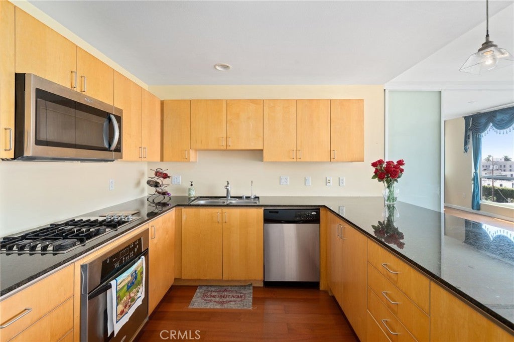 DAY VIEWS, NIGHT VIEWS & WATERFRONT VIEWS! PRICED TO SELL FAST & MOVE-IN READY! Welcome to Unit #527 — a clean, sophisticated TOP FLOOR (no neighbor above)/CORNER (no neighbor to the north) Condo featuring breathtaking panoramic views of the ocean, waterfront, Port of L.A., city skylines, rooftops & San Pedro Hills, WHICH SETS THIS APART FROM OTHER CONDOS. These stunning vistas create a sense of serenity and tranquility the moment you enter either day or nighttime. This unit is located in CENTRAL SAN PEDRO, 1&1/2 blocks walking distance to the PORT. The cosmopolitan 2-bdrm, 2-full-bathroom unit boasts 3-large ceiling to floor windows that invite in abundant natural light and refreshing ocean breezes. One bedroom includes a cat door for pet convenience, and both bedrooms offer walk-in closets with built-in shelving and rods for ample storage. An obscure-glass sliding door separates one of the bedrooms from the living/family area for added privacy. The gourmet kitchen is equipped with dark granite countertops, clean wood cabinetry, a gas stove ideal for gourmet cooking, a new built-in microwave, dishwasher, refrigerator/freezer, pull-out faucet hose, and washer & dryer. Beautiful laminate flooring throughout enhances the modern feel of the space. Additional features include central A/C and heating, a laundry room, a coat/broom closet and fire sprinklers. A 2nd building entrance is located next to this unit via locked-door stairway, which exits to the garage for easy entry to and from the outside (ideal for owners with a pet). HOA amenities include: water; trash; (2) secured, designated parking spots (located next to the lobby door for easy entry); guest parking area; bike corral; 3rd-floor outdoor garden lounge with (2) BBQ pits, tables and chairs – perfect for entertaining; 1st-floor mailbox with convenient shelving for package deliveries; pet-friendly & pet run; (2) elevators for easy lifting from the street-level lobby to all (5) floors; & (3) stairways. The building also has a SUBWAY at the S/W corner—great for quick, on-the-go meals. Location Highlights: Enjoy the first Thursday Art Walk, local art galleries, breweries, eateries, and more. Whether you're searching for a chic urban retreat or a smart INVESTMENT FOR THE ANTICIPATED LA WATERFRONT LOS ANGELES PROJECT & THE 2028 LA OLYMPICS SAILING EVENTS in a thriving and growing neighborhood, this property delivers modern luxury and exceptional convenience.