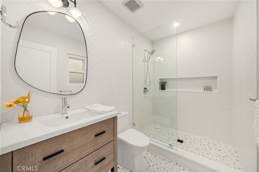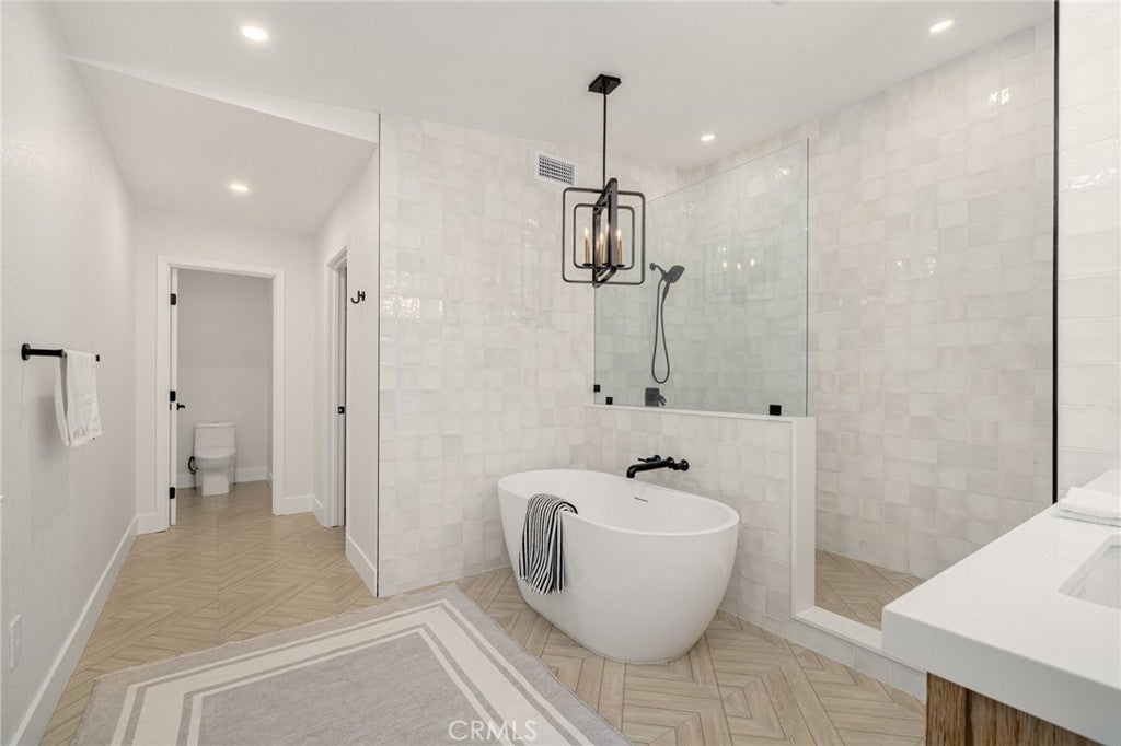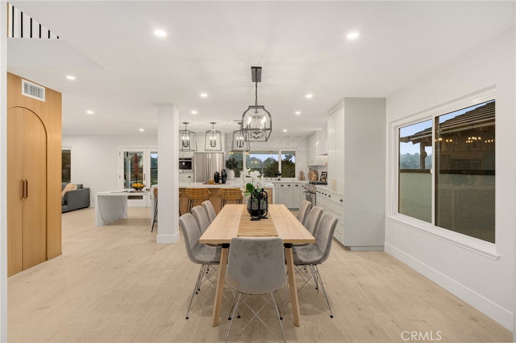 Close to the Mission Viejo Aquatics Complex and Tennis Pavilion, this reimagined, modern-function floor plan offers 4 bedrooms and 3.5 baths on a quiet street backing to open space and the Oso Creek Trail—with mountain and city-light views. Bright, open-concept living features soaring ceilings, luxury vinyl plank flooring, recessed lighting, and matte-black accents. The chef’s kitchen includes a 13' quartz island, custom cabinetry, polished-brass hardware, a 36" professional 6-burner range, and a built-in JennAir coffee system. Convenient upgrades include: electrical with USB-C/dimmers, smart thermostat, hardwired smoke/CO alarms, exterior camera, and smart doorbell. Double wood entry doors open to a statement staircase with LED wall lighting. The upstairs primary suite enjoys expansive views; a secondary ensuite provides flexible guest or office use. Spanish-tile curb appeal, roof certification (per seller), manicured landscaping, and a 3-car garage complete the exterior. The backyard, framed by white roses, offers generous space with potential for a pool/spa or outdoor kitchen (buyer to verify). Convenient to shopping and dining.