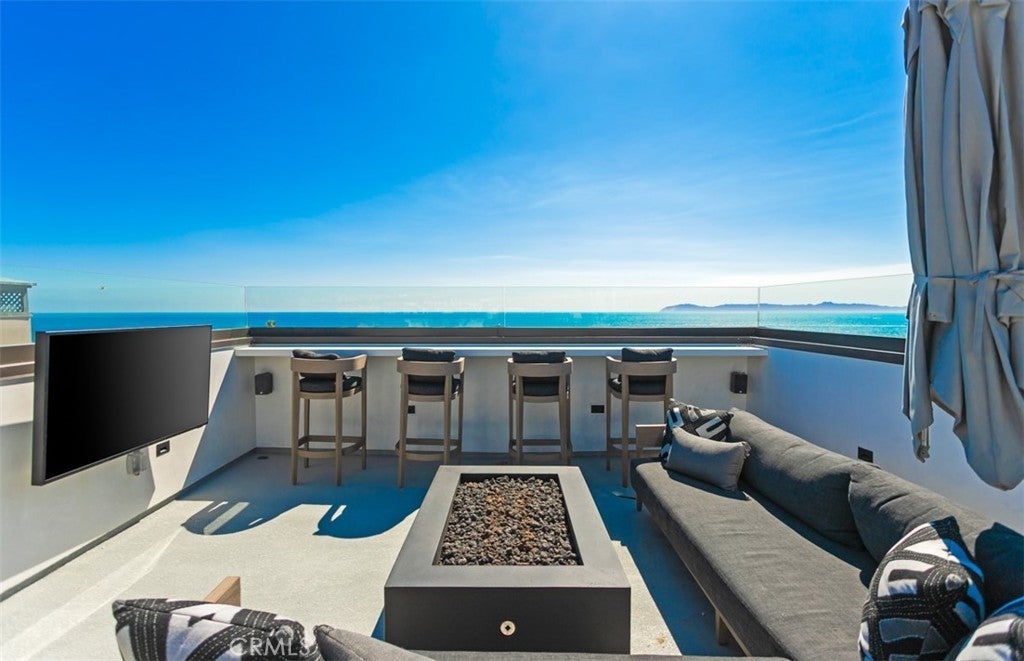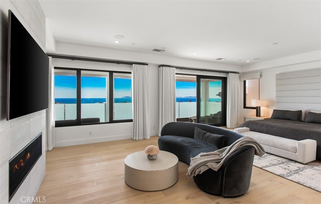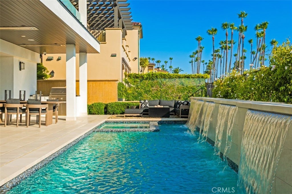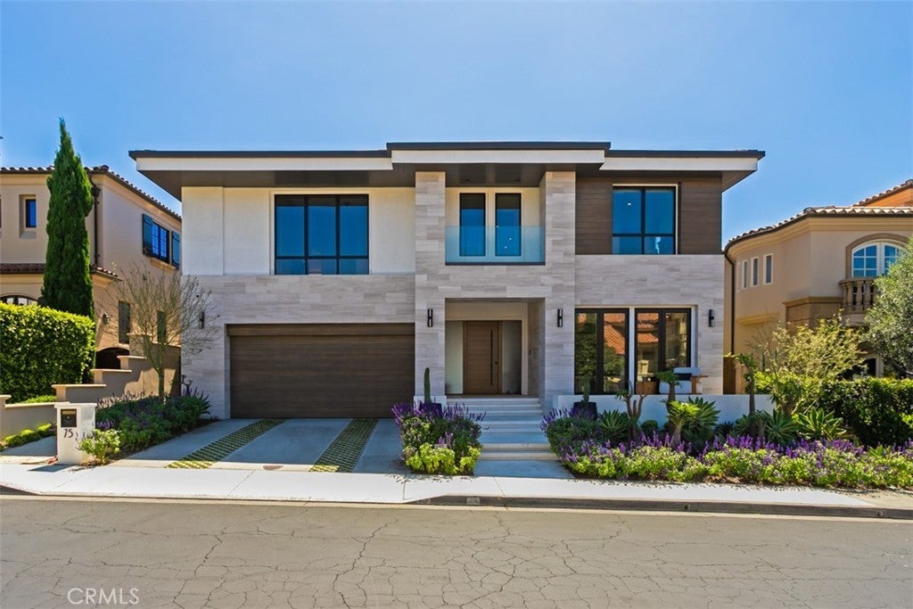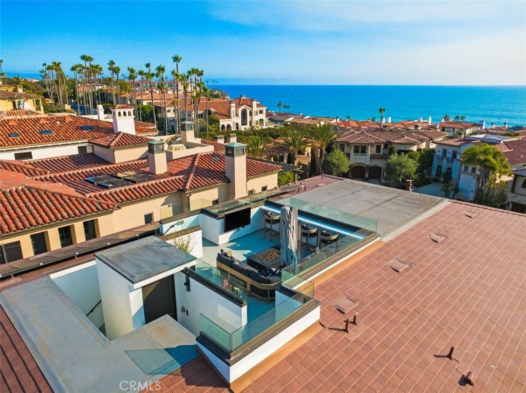 With captivating soft-contemporary architecture, striking interior design and panoramic ocean, Catalina Island and coastline views, this magnificently modern custom home is without compare. Located just steps from the sand in Dana Point’s exclusive guard-gated Ritz Cove collection, the luxurious residence takes full advantage of its beach-close setting by offering seamless indoor/outdoor living that blends walls of automated glass pocket doors with an open-concept floorplan. Natural stone and wood details embellish an exterior that stands apart from adjacent homes while complementing the neighborhood’s prestigious aesthetic. Approximately 6,250 square feet, the generous two-level design reveals a formal entry with views through to the backyard, a custom elevator to the rooftop deck, and an atrium-style double-height foyer with a dramatic staircase and seamless access to a fireplace-warmed lounge and seating area with side-yard fountain. Disappearing walls of glass open the rear of the home to the backyard and welcome light into a family room with fireplace, large dining room, a stunning wine wall with backlit onyx, and an open chef’s kitchen that rivals those found in glossy architectural magazines. An island with dual-waterfall edges is joined by custom wood cabinetry in two distinct finishes, polished stone countertops, and top-tier stainless steel appliances including a six-burner Wolf range with griddle and two ovens. Convenience is enhanced by a hidden prep kitchen with cooktop, second refrigerator and abundant storage. Four ensuite bedrooms with walk-in closets and five and one-half baths ensure comfort and privacy for residents and guests, while a main-level office opens to a sunny front patio and could become a fifth bedroom. Everyone will enjoy a second-floor gym and massage room, each featuring a soothing interior waterfall. For movie night, the gym easily becomes a home theater, complete with a state-of-the-art Denon AV receiver and surround sound. Escape to an ocean-view paradise in the primary suite, which showcases a covered full-width balcony, sitting area with fireplace, and custom closets. Gold fixtures shine in the primary bath, harmonizing with a freestanding tub, two floating vanities, and an oversized shower with custom built-in body-conforming lounger. Solar power, whole-house Sonos audio, and a three-car garage with two EV outlets are included, and the backyard boasts a resort-style pool, spa, and built-in BBQ.