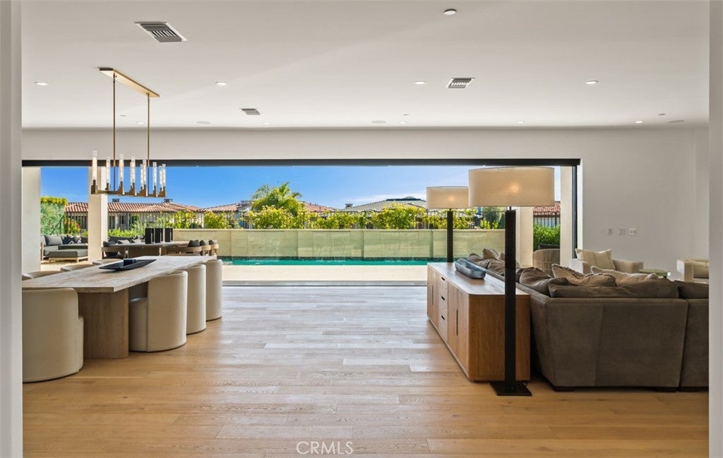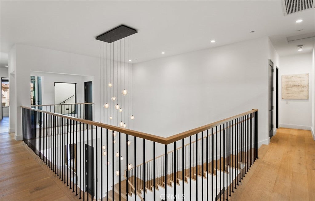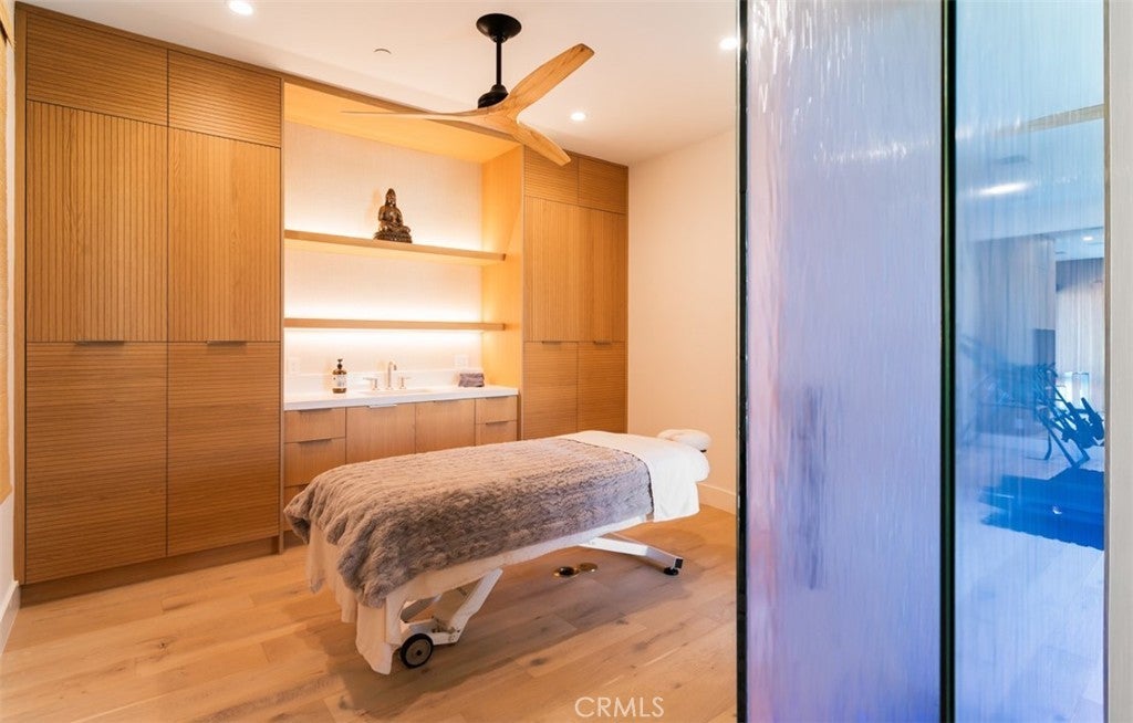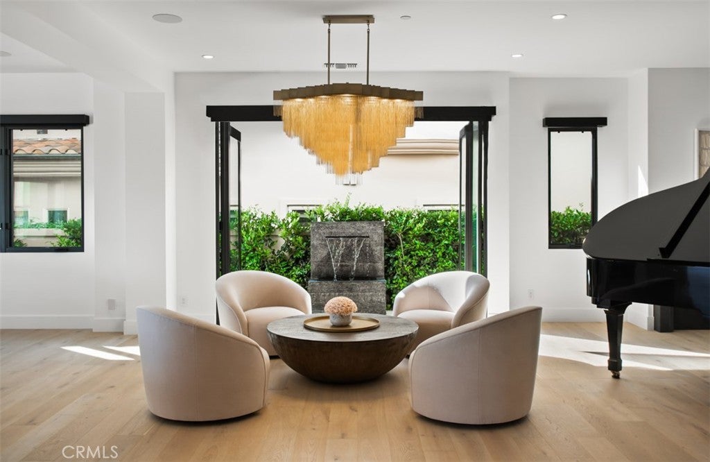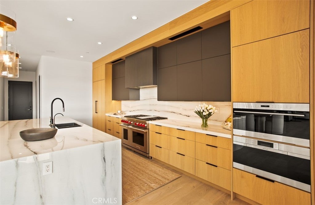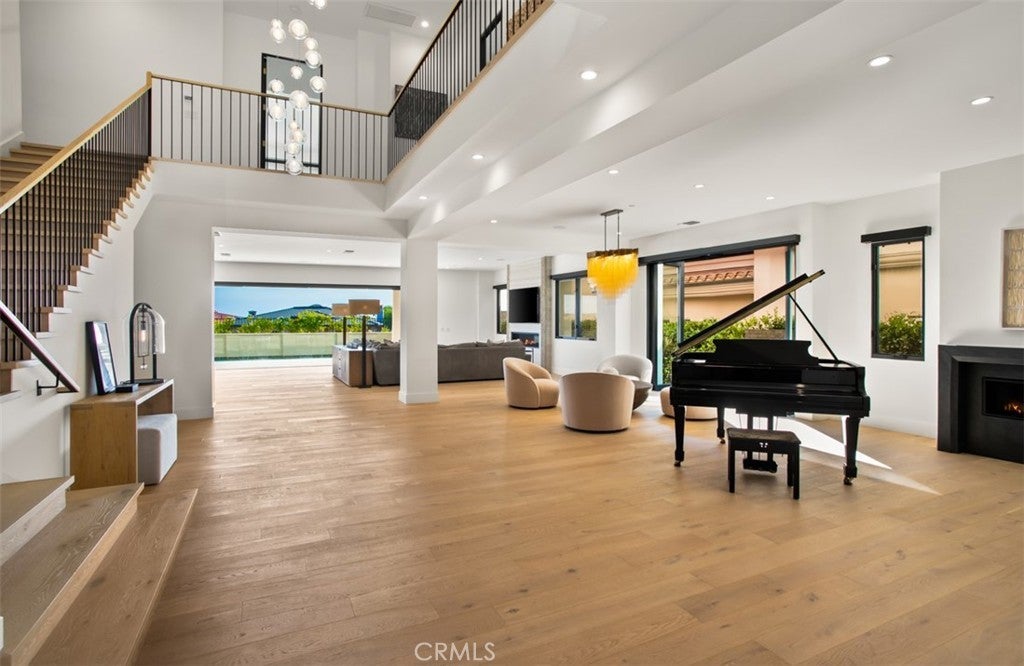 With captivating soft-contemporary architecture, striking interior design and panoramic ocean, Catalina Island and coastline views, this magnificently modern custom home is without compare. Located just steps from the sand in Dana Point’s exclusive guard-gated Ritz Cove collection, the luxurious residence takes full advantage of its beach-close setting by offering seamless indoor/outdoor living that blends walls of automated glass pocket doors with an open-concept floorplan. Natural stone and wood details embellish an exterior that stands apart from adjacent homes while complementing the neighborhood’s prestigious aesthetic. Approximately 6,250 square feet, the generous two-level design reveals a formal entry with views through to the backyard, a custom elevator to the rooftop deck, and an atrium-style double-height foyer with a dramatic staircase and seamless access to a fireplace-warmed lounge and seating area with side-yard fountain. Disappearing walls of glass open the rear of the home to the backyard and welcome light into a family room with fireplace, large dining room, a stunning wine wall with backlit onyx, and an open chef’s kitchen that rivals those found in glossy architectural magazines. An island with dual-waterfall edges is joined by custom wood cabinetry in two distinct finishes, polished stone countertops, and top-tier stainless steel appliances including a six-burner Wolf range with griddle and two ovens. Convenience is enhanced by a hidden prep kitchen with cooktop, second refrigerator and abundant storage. Four ensuite bedrooms with walk-in closets and five and one-half baths ensure comfort and privacy for residents and guests, while a main-level office opens to a sunny front patio and could become a fifth bedroom. Everyone will enjoy a second-floor gym and massage room, each featuring a soothing interior waterfall. For movie night, the gym easily becomes a home theater, complete with a state-of-the-art Denon AV receiver and surround sound. Escape to an ocean-view paradise in the primary suite, which showcases a covered full-width balcony, sitting area with fireplace, and custom closets. Gold fixtures shine in the primary bath, harmonizing with a freestanding tub, two floating vanities, and an oversized shower with custom built-in body-conforming lounger. Solar power, whole-house Sonos audio, and a three-car garage with two EV outlets are included, and the backyard boasts a resort-style pool, spa, and built-in BBQ.