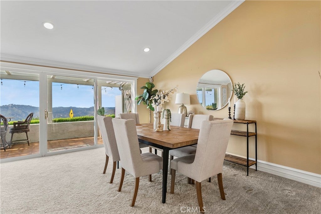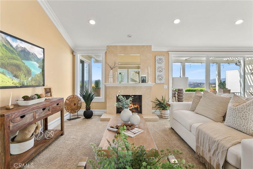 Rare opportunity, this attached home is on the most sought after street in Monarch Summit II, featuring Spectacular Ocean, Catalina, Saddleback Valley Mountains, Sunsets & City Lights Views, located on a single loaded street. This home has unobstructed panoramic views, without rooftop intrusion and sits across from Seaview Park where you can take in the joys of people watching & trails by day & quiet serenity & majestic city lights by night.This 1,400 sq ft single level floor-plan offers quality craftsmanship throughout with an updated, large dine in kitchen, custom maple cabinets, countertops with marble bullnose, built in cooktop, oven, dishwasher & refrigerator. It also features a computer desk with cabinetry & a centered wine rack. Additional features consist of an attached 2 car garage, Bose speaker systems, large format porcelain floors, crown moldings, custom baseboards, recessed lighting, paneled doors, custom window casings & large glass sliders throughout the house & a BBQ island off the kitchen courtyard.The kitchen’s walls are open to create one fabulous “great room” with a living room and additional dining space which enhances the sensational unobstructed views. The “great room” also features a polished marble fireplace, vaulted ceiling & a large slider opening to the back patio view. A large primary bedroom with vaulted ceilings that has a spectacular night-light view of the Saddleback Mts, Canyon below, while still providing ocean views from various perspectives. The adjoining bathroom has a large skylight, ceramic tile shower & tub, double vanity, polish porcelain floors & elaborate crown molding, backlit with custom lighting & a large closet area with mirrored sliders. The secondary bedroom has vaulted ceilings, crown molding, recessed lights & mirrored wardrobe closets. The remolded hall bath has porcelain tiled shower with glass doors, skylight and a beautiful custom vanity. This is resort style living in a 55 + community that has a pool, jacuzzi, clubhouse, nearby world class beaches, dining & shopping.