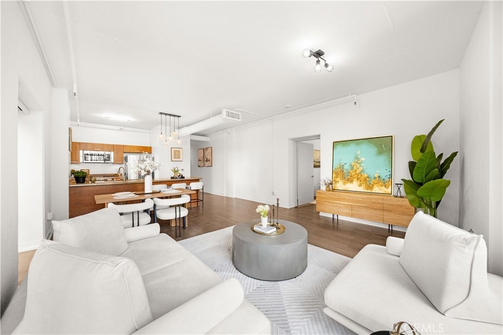 This amazing rare corner residence offers expansive southwest-facing floor-to-ceiling windows that flood the home with natural light. The elegant interior features wide-plank hardwood flooring throughout, an open-concept layout, and a sleek kitchen appointed with Ceaserstone quartz countertops, a Whirlpool five-burner gas range, stainless steel appliances, and in-unit washer/dryer. 2 generously sized, gated side-by-side parking spaces are included. Market Lofts provides 24-hour concierge service, ensuring security and seamless package and delivery management. Amenities include a resort-style pool, 20-seat private screening room, fitness center, clubhouse, and BBQ area. Ground-level conveniences include Ralph’s, Coffee Bean, and more. Ideally located within walking distance to Whole Foods, LA Live, The Bloc, fine dining, and upscale retail. Experience refined urban living in the heart of Downtown LA.