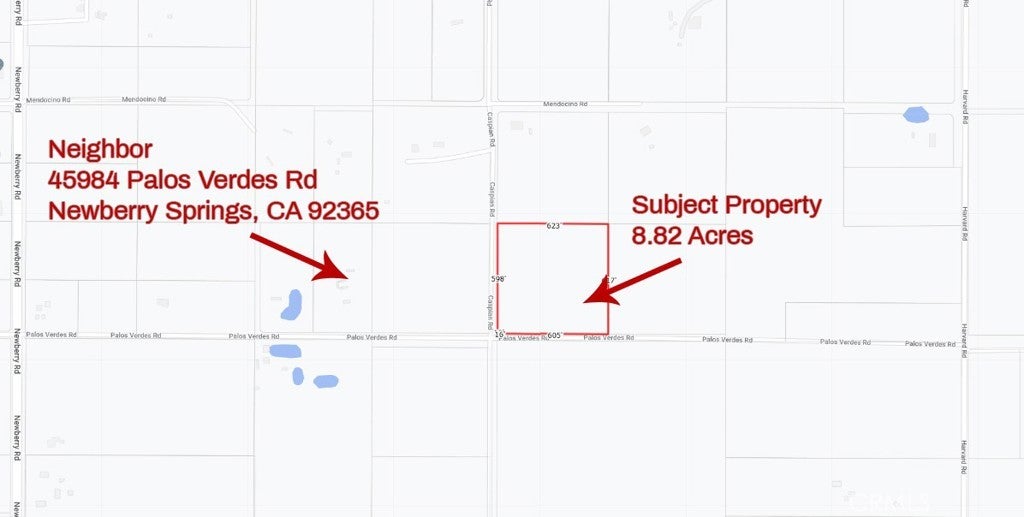 Claim your own 8.82-acre corner lot (APN: 0532-121-34-0000) in the welcoming high-desert community of Newberry Springs. Perfectly situated at the intersection of Caspian Road and Palos Verdes Road, this versatile property offers the space and freedom to create your vision—whether it’s building a custom home, starting a farm, or investing for the future. Electricity is available right at the street, and RL-5 zoning provides the flexibility for both rural residential and agricultural uses. The location offers the perfect mix of tranquility and convenience—just 15 minutes from Barstow, about two hours from Las Vegas, and with quick access to both Interstate 15 and Interstate 40. Here, you can enjoy peaceful desert living without giving up easy connections to shopping, dining, and essential services. The surrounding community is known for its rich agricultural heritage, highlighted by the annual Pistachio Festival, as well as its natural beauty—from ancient volcanic rock formations and mineral springs to hidden mud baths and endless desert trails. Outdoor enthusiasts will love the opportunities for dirt biking, hiking, camping, and exploring the nearby Mojave Trails National Monument and historic Route 66. With its ample size, fertile soil, and scenic location, this lot is ideal for pistachio orchards, other crops, or your own private retreat. The seller also owns the adjacent 9.39-acre parcel (APN: 0532-121-33-0000) and will pay all closing costs if you purchase both together—giving you over 18 acres to bring your dream project to life. Opportunities like this are rare, especially for a corner lot with utilities nearby and zoning this flexible. Don’t miss your chance to secure a prime piece of Newberry Springs and start building the lifestyle you’ve always envisioned. Call today for more information.