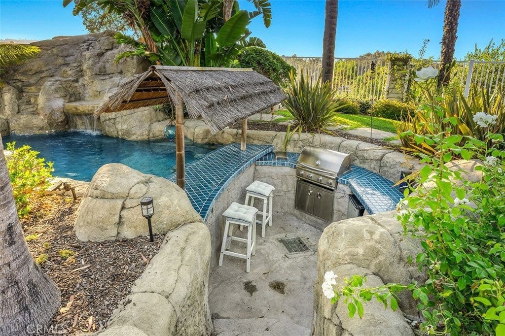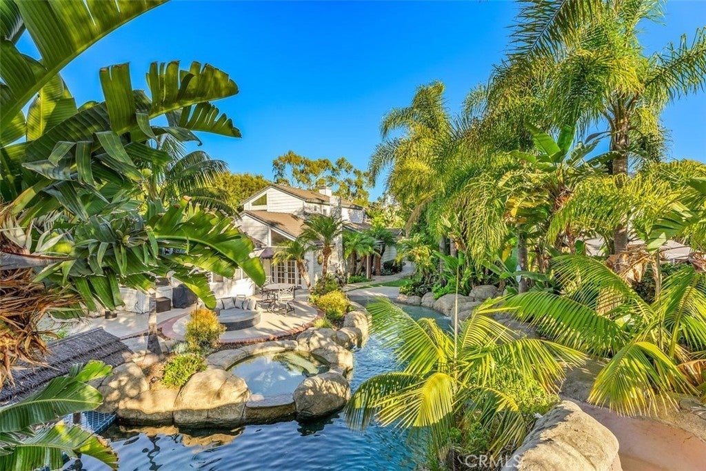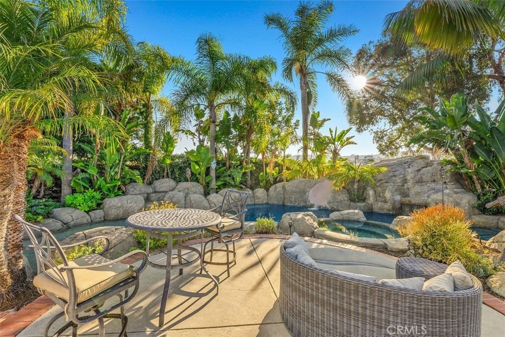 Gorgeous cape cod style home in Beacon Cove. Amazing four-bedroom, three-bath home with a resort-style backyard and endless views of South County. The home features a corner cul-de-sac location with a gated entry leading to the amazing resort-style backyard that is FULLY furnished and ready for entertaining. A cute dutch door greets you and opens up to a huge open floor plan with high ceilings and great natural lighting. The home has been FRESHLY painted on the interior and exterior and new carpet has bee installed in the primary bedroom. The kitchen is remodeled with quartz counters and stainless steel appliances and is open to the family's great room. A kitchen island and breakfast nook are perfect for casual dining but you also have a formal dining and living room option. The main level includes three bedrooms, a Jr. primary bedroom that is en-suite, and two secondary bedrooms that share a remodeled full bathroom. Laundry vsn be both inside or in the garage and there is direct entry from the two-car garage. The upper level is a private master suite with a private bar, built-ins, a two-way fireplace, dual vanities, and a separate tub and shower. The backyard is an entertainers dream and includes a rock pool with a water slide, grotto, spa, swim up bar and a sunken BBQ area. Two concrete deck areas with a custom outdoor fireplace unit! Close to shopping, dining, award-winning schools, a dog park, Laguna Niguel Lake, hiking trails, and a short stroll to world-class beaches!