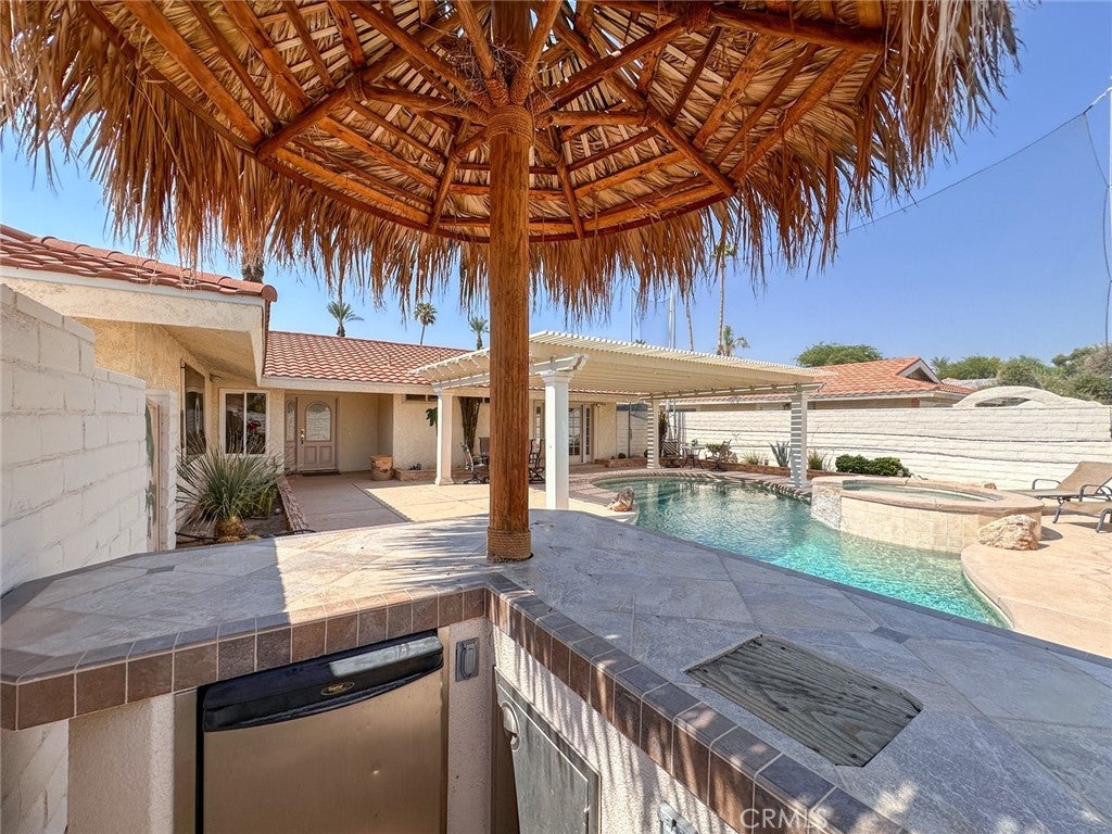 PRICE REDUCTION!!! Stunning 2-Bedroom Pool Home with Spectacular Golf Course Views -- NO HOA! Welcome to 80205 Westward Ho Drive, a beautifully updated single-story retreat in the heart of La Quinta, offering unparalleled south-facing double fairway golf course views. This exquisite 2-bedroom, 2-bathroom home combines modern elegance with resort-style living, perfect for relaxation or entertaining. Step inside to a three bedroom home converted to a two bed to create an open floor plan with plenty of living space. If three beds is your preference, it could easily be converted back. The kitchen is a showstopper, boasting custom wood cabinetry, sleek granite countertops, a spacious island with breakfast bar seating, a gas cooktop, double wall oven, and a dishwasher. Adjacent, the formal dining area with a built-in buffet is ideal for hosting memorable gatherings. The private front yard is a true oasis, complete with a pool and spa, surrounded by drought-tolerant landscaping for low-maintenance beauty. With an attached two-car garage and exceptional curb appeal, this home offers style and convenience. Bask in the natural lighting pouring through expansive windows, framing breathtaking views of the Indian Springs golf course. Located in a prime spot, this property is a rare gem, perfect for those seeking luxury and freedom in one of La Quinta's most desirable neighborhoods.