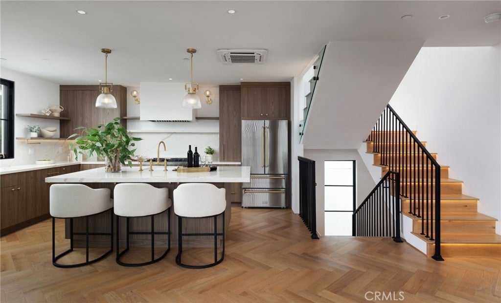 - Interior FeaturesBreakfast Bar, Balcony, Ceiling Fan(s), Separate/Formal Dining Room, Eat-in Kitchen, Open Floorplan, Pantry, Quartz Counters, Recessed Lighting, Bedroom on Main Level, Walk-In Closet(s), Built-in Features, Instant Hot Water, Living Room Deck Attached, Wine Cellar