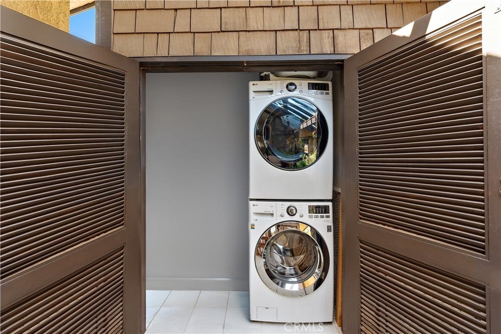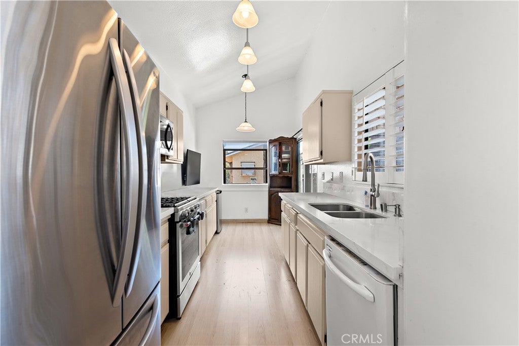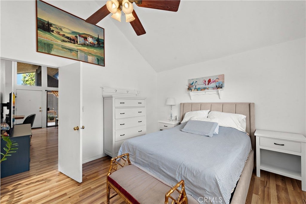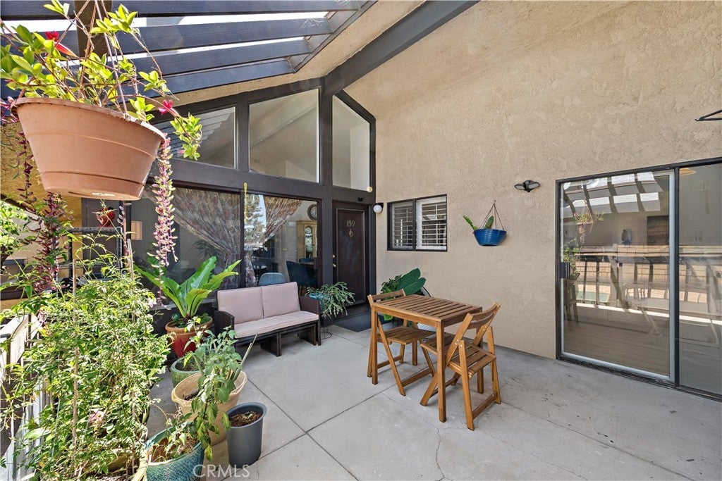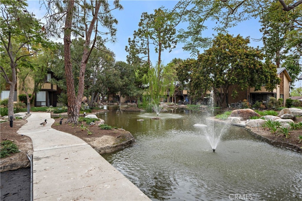 Welcome to your peaceful, updated 1-bedroom, 1-bath end unit condo nestled in a gated community. This end unit, with stairs leading exclusively to your door, shares only one common wall, providing added privacy. The upper-level home features soaring vaulted ceilings and bright rooms filled with natural light, complemented by plantation shutters throughout. Recently refreshed with new paint and flooring, the open kitchen has quartz countertops and additional cabinetry. The cozy living room with a fireplace overlooks a spacious patio, perfect for entertaining or relaxing, with a convenient washer and dryer area. The bedroom is illuminated by a skylight and includes a newly renovated vanity area along with a spacious walk-in closet. Residents enjoy access to two pools, two hot tubs, tennis courts, and beautifully maintained grounds. With easy access to shopping, dining, and freeways, this location offers exceptional convenience. Lakewood Shores provides a vibrant community lifestyle and is the perfect place to call home!