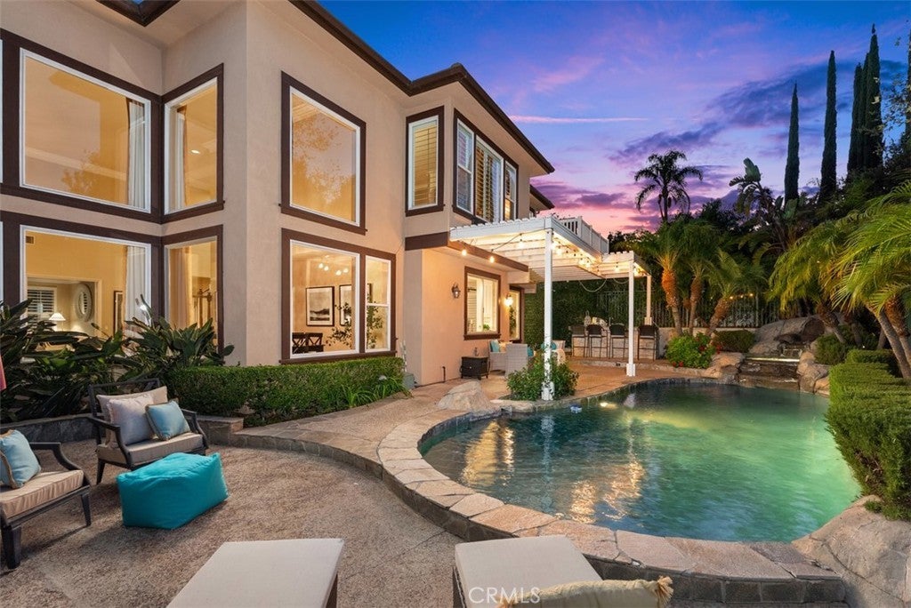Discover unparalleled luxury at 6 Barneburg, a stunning 5-bedroom, 4.5-bathroom pool and spa home within the prestigious gated community of Dove Canyon. Boasting breathtaking panoramic views and an open floor plan, this thoughtfully designed home is a must-see. Upon entry, you are greeted by a spacious formal living and dining room, accentuated by soaring ceilings and expansive windows. The upgraded gourmet kitchen, a culinary enthusiast's dream, boasts quartz countertops, a large center island with seating, a double oven, and a walk-in pantry, seamlessly flowing into the breakfast nook and a separate family room complete with a wet bar and fireplace. A convenient main floor bedroom with a private full bath provides added flexibility. Ascending to the second level, the oversized primary bedroom presents a luxurious retreat, featuring a fireplace and a private walk-out deck to savor the sweeping views. The primary bathroom is appointed with dual vanities, a jetted tub, and a separate shower, ensuring a spa-like experience. This level also offers a spacious bonus room or loft, perfect for recreation or relaxation. Two secondary bedrooms are connected by a convenient Jack-and-Jill bathroom with dual sinks, while a fourth upstairs bedroom provides additional accommodation. The meticulously landscaped backyard serves as an entertainer's paradise, showcasing a sparkling pool and spa with a tranquil waterfall, a built-in barbecue, and an outdoor fireplace, all set against a scenic backdrop. Enhanced by casement windows, crown molding, and newer carpet, this residence exudes refined elegance. As a resident of Dove Canyon, you’ll enjoy access to a Jr. Olympic pool, tennis courts, sports court, playground, and scenic trails. You’ll also have the option to join the Jack Nicklaus Jr. golf course and social club, with a gym, dining, wine room, and more.
