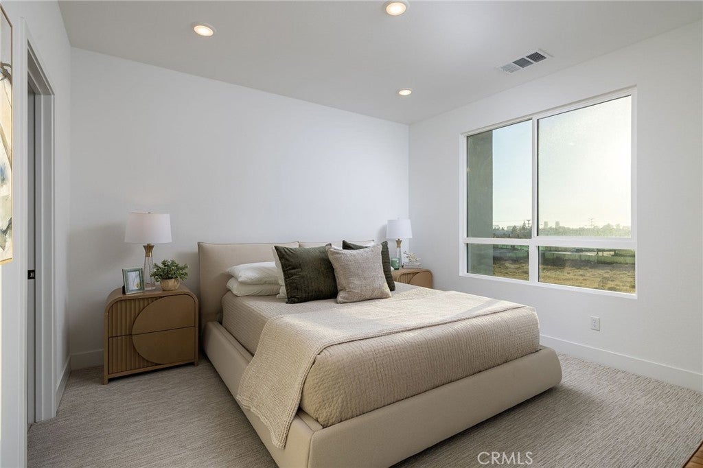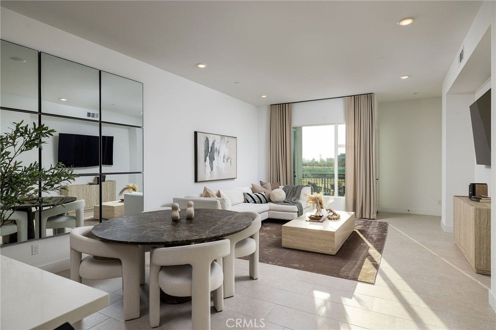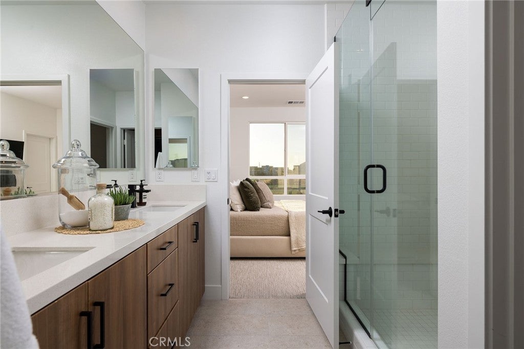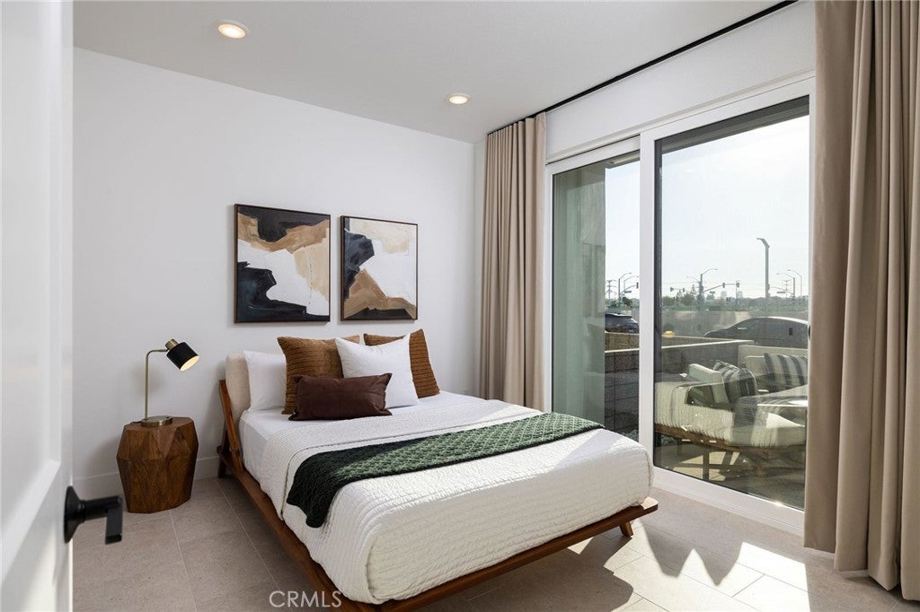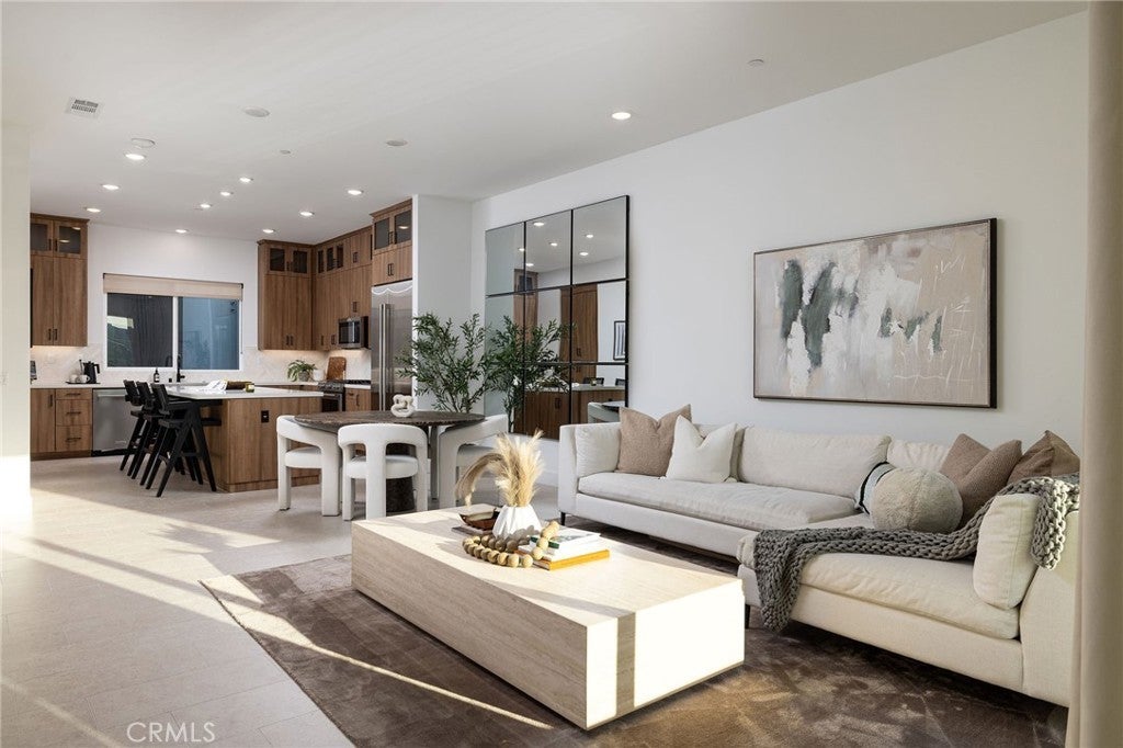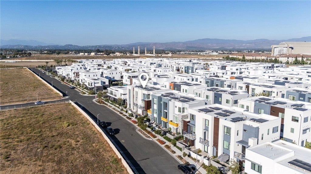 This newly built luxury townhome in The Landing at Tustin Legacy offers the perfect blend of modern sophistication and everyday convenience in one of Orange County's most desirable new communities. Completed in 2023, this light-filled contemporary home welcomes you with an open-concept layout featuring soaring 12-foot ceilings, imported Italian stone floors, and sleek matte black designer finishes that create an atmosphere of understated elegance. Enter the 3-story plan through the thoughtfully designed lower level that includes an ensuite bedroom (or optional office or fitness room) and direct access to the two-car garage. This space also opens directly to a sunny patio, bringing the outdoors in and making for a welcoming curb appeal. Large windows fill the second-level great room with natural light, creating an ideal environment for both entertaining guests and everyday relaxation. The living room flows seamlessly to a private balcony, extending your living area outdoors. The luxe chef's kitchen is finished with full-height maple cabinetry, a complete stainless steel JennAir/KitchenAid appliance suite, and a striking quartz island ready for casual bites and conversation. Upstairs, two generously sized bedrooms each provide ample accommodation with large windows and spacious closets. The primary suite serves as a true retreat, with two walk-in closets featuring professional organizers and a spa-like bathroom with double sink vanity and oversized shower. Modern convenience is built-in, with smart features including paid solar panels, an EV charger, Google Home smart system, instant hot water system, and SpringWell whole-home water filtration system. This property’s excellent location within The Landing community provides views of Disneyland fireworks displays and John Wayne Airport, while being within the boundaries of top-rated Tustin Unified schools. All within walking distance of The District shopping center and entertainment, local parks, and a diverse array of restaurants, creating a lifestyle where luxury living meets unmatched convenience in the exciting heart of Tustin Legacy.