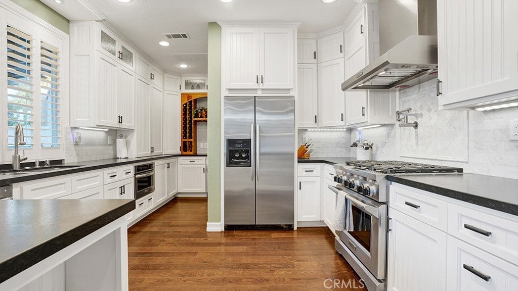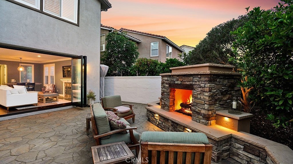 MODERN DESIGNER VIEW HOME IN TALEGA’S FARRALON RIDGE TRACT. Welcome to this stunning 4-bedroom, 2.5-bath home with 2,414 sq. ft. of living space on a 4,376 sq. ft. lot, thoughtfully updated with high-end finishes and modern conveniences throughout. Redesigned and expanded, the kitchen is a true showpiece, boasting black granite countertops, custom cabinetry with abundant storage, a KitchenAid range and hood with premium appliances, a pot filler, and a dedicated wine cabinet with fridge. In the living room, custom built-ins, ceiling speakers with in-wall amp, and dramatic bifold doors create seamless indoor-outdoor living. Additional highlights include a den with a custom built-in bookcase and fully remodeled bathrooms throughout. The downstairs bath, updated less than 15 months ago, features new cabinetry, a modern sink, and elegant white quartz countertops. Recently renovated, the secondary bath showcases a walk-in shower with beautifully detailed tile, new sinks, white quartz countertops, updated cabinetry, and tile flooring. The spacious primary suite provides a true retreat with a walk-in closet featuring custom built-ins. Remodeled within the past year, the primary bath is finished with lovely white tile work, dual sinks set in white quartz countertops, new cabinetry, and a spa-like standalone tub with a custom shower. Step into the backyard, an entertainer’s dream and private retreat, featuring low-maintenance hardscaping, a built-in bar and backbar, wine fridge, multiple kegerators, stainless steel BBQ and sink, fireplace, and elegant exterior lighting. Exceptional privacy and sweeping views of nature, including panoramic east-facing vistas, combine with a short walk to access the Christianitos South Trail—one of Talega’s many hiking trails. Notable upgrades include a full home re-pipe in 2025, crown molding in the living areas and primary suite, custom shutters throughout, rich dark wood flooring, and garage storage cabinets. This home blends thoughtful design with modern luxury, offering a perfect balance of style, comfort, and entertaining spaces.